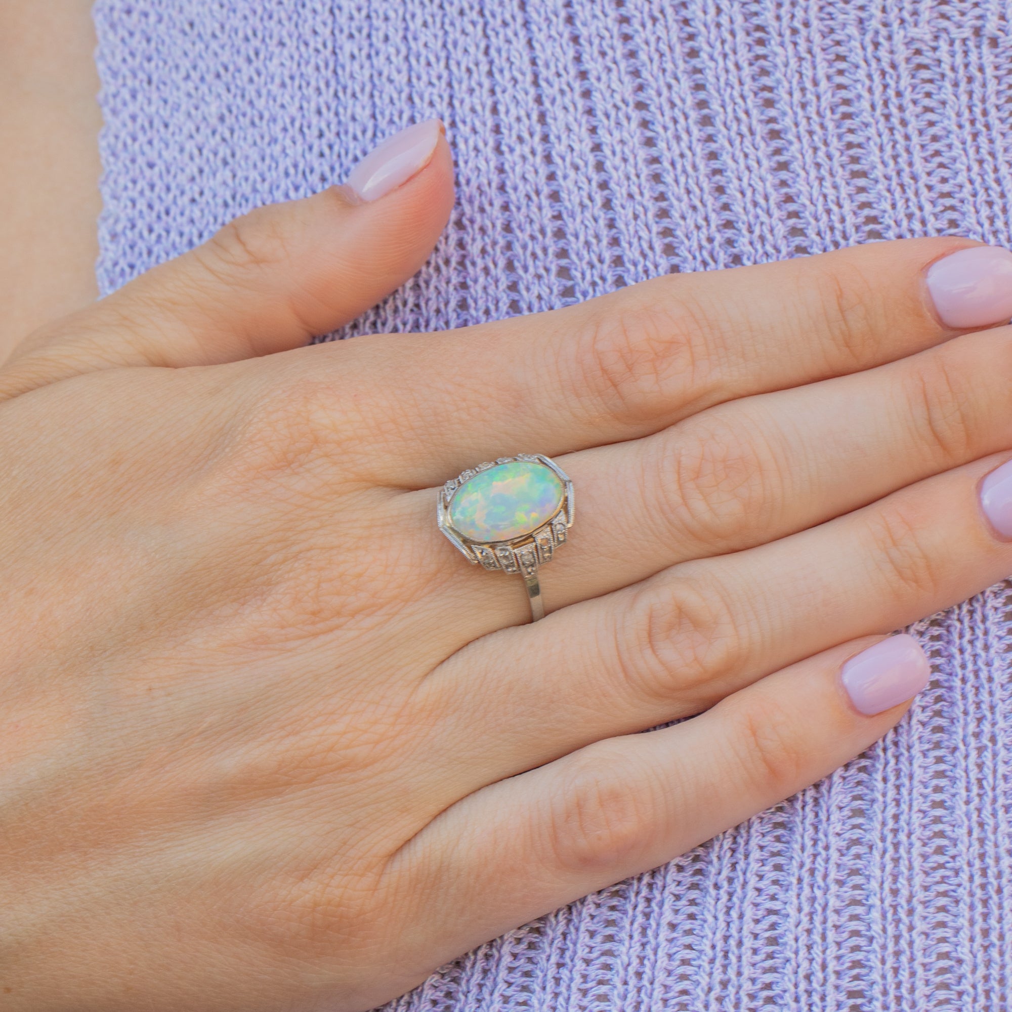French 18ct White Gold Art Deco Opal Diamond Cluster Ring, 1.20ct Opal