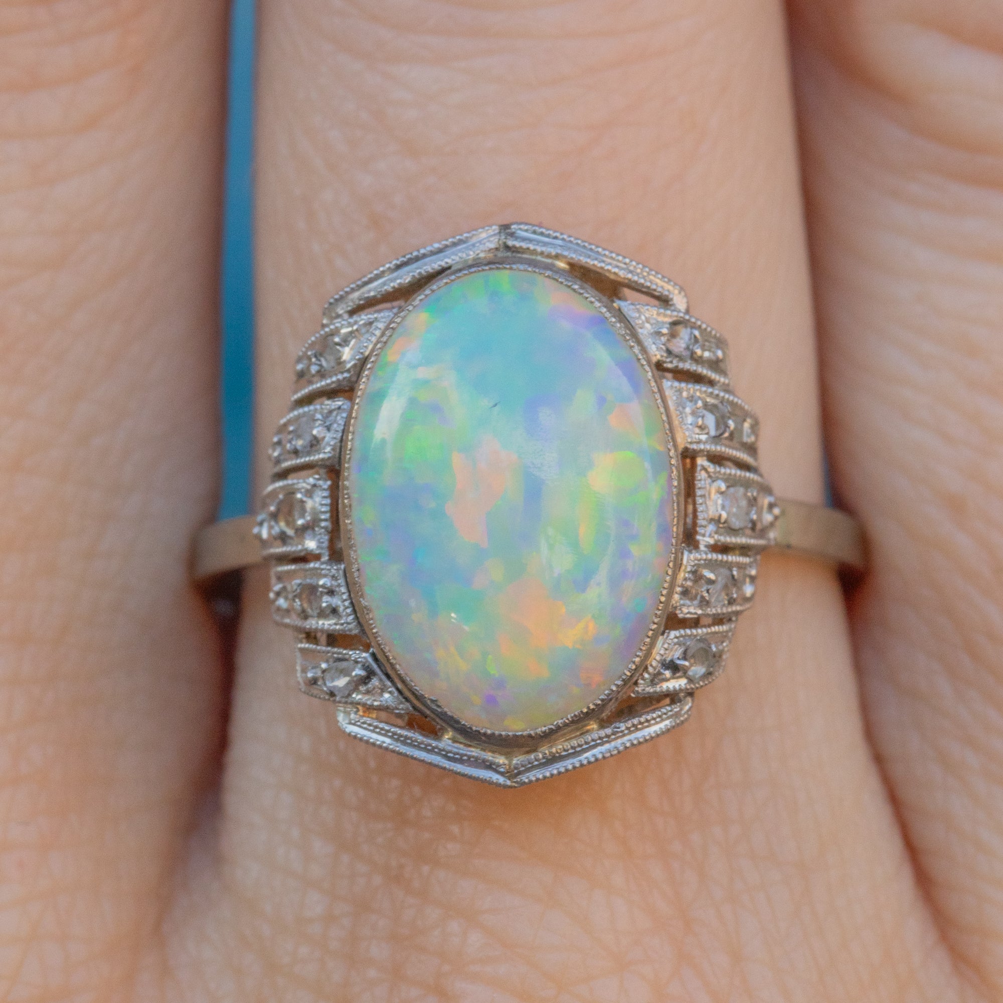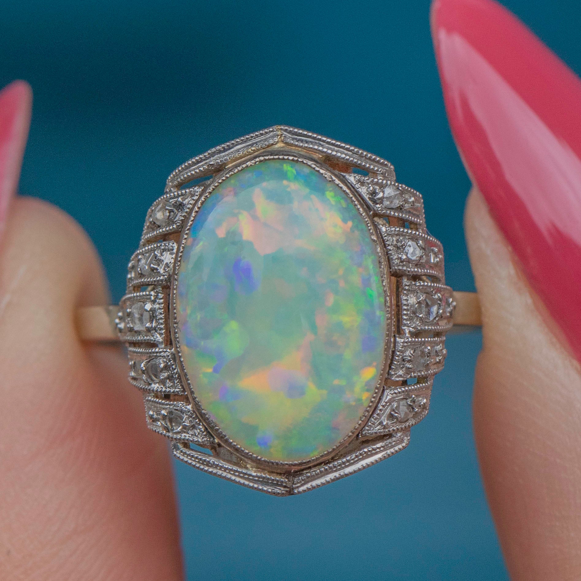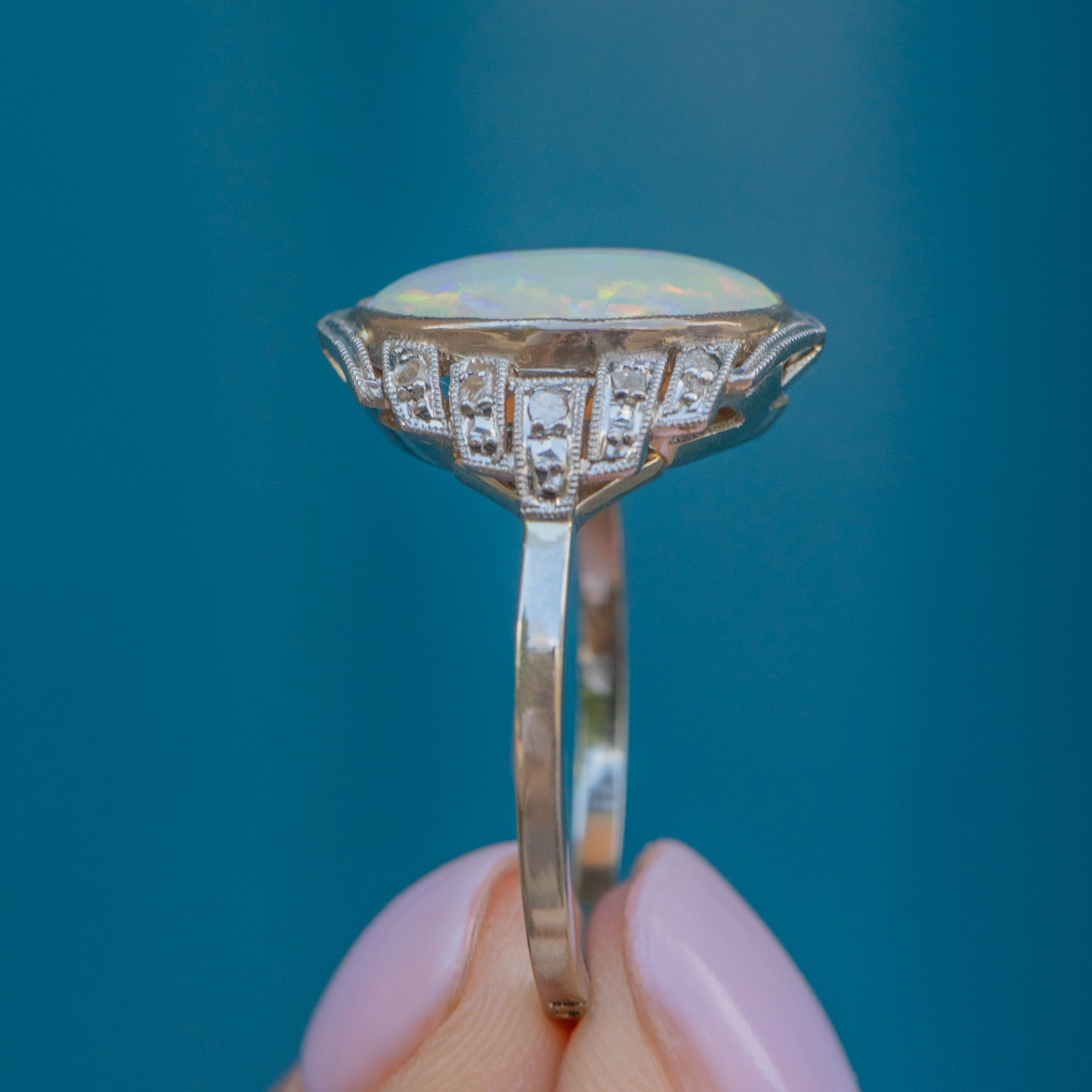 EXCELLENT. This French Art Deco Opal Diamond cluster ring is in excellent condition! The Opal cabochon is cut smooth to the touch and sits securely within the setting, with a vibrant play of colour. Each Diamond is present and secure providing a lovely sparkling accent. The ring band is well rounded making her comfortable to wear, with no damage to the precious metals to note! There are French stamps visible on the outside of the band, making her a highly coveted piece!