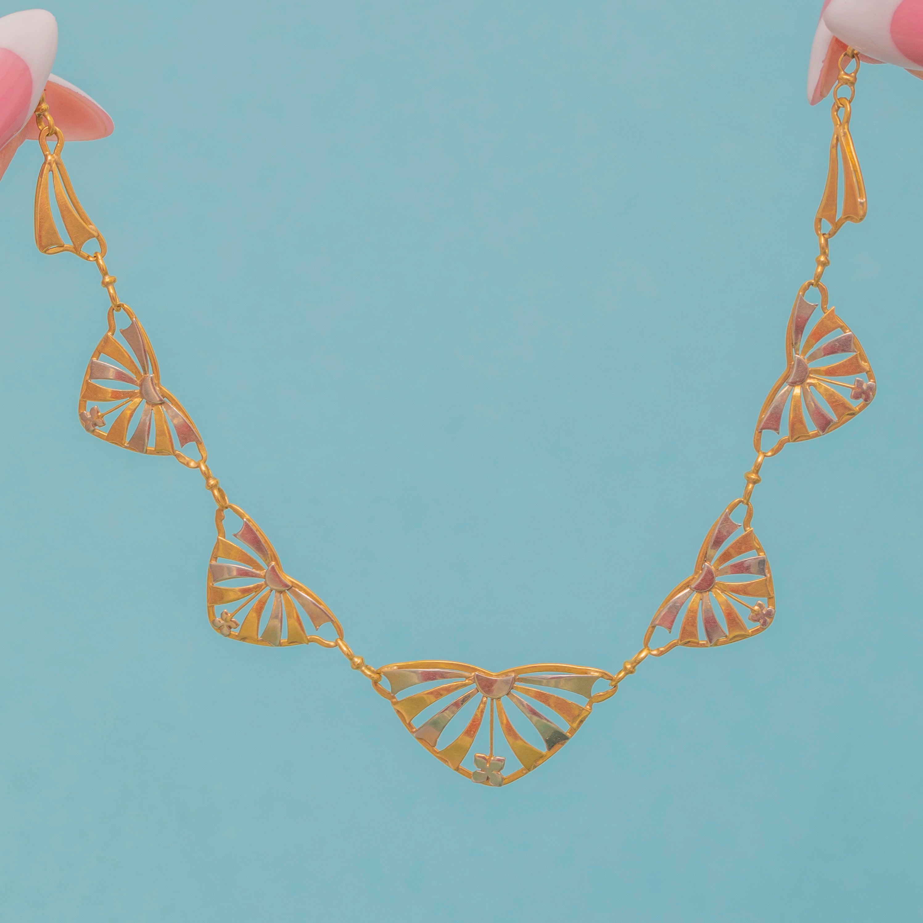 This French Art Deco necklace will make a fabulous addition to your collection. The 17" necklace has an alluring fan-shaped fringe that draws in the eye, crafted from solid 18ct Gold with White Gold accents creating a gorgeous two-tone effect!