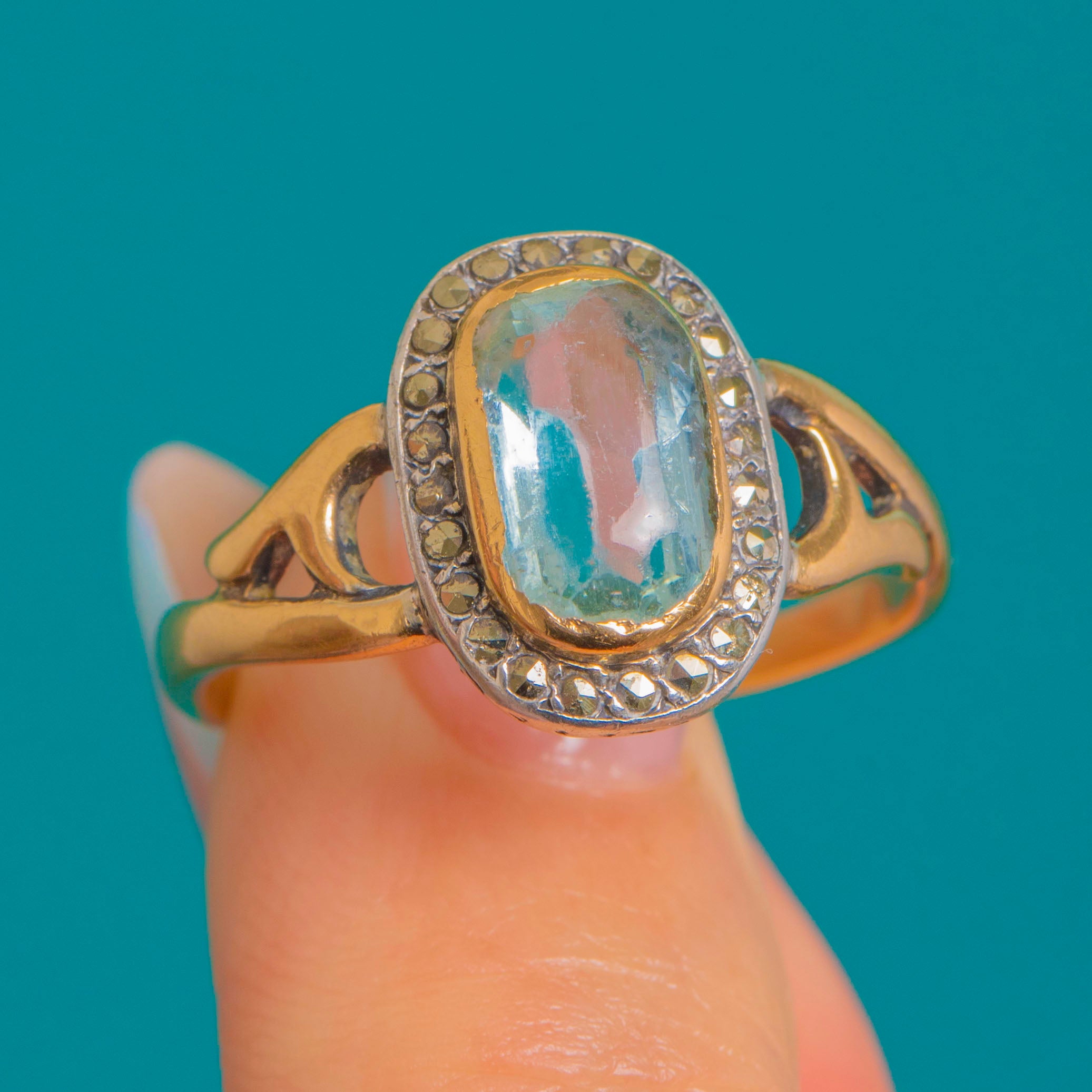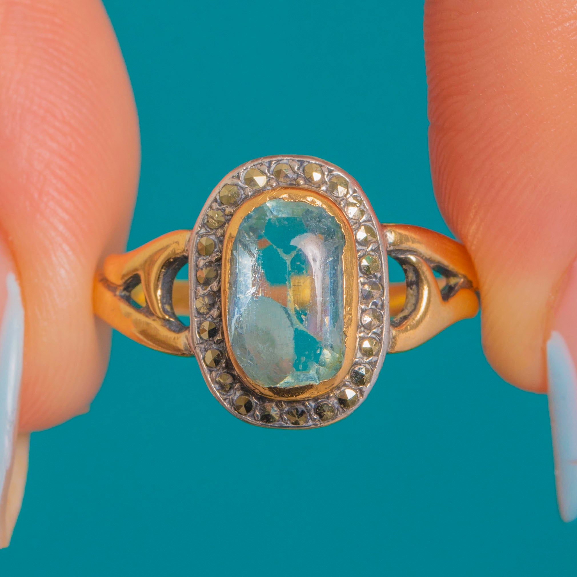 VERY GOOD: The Aquamarine shows gentle softening to the facet edges with light abrasions consistent with age; Marcasites are present and secure with a pleasing antique patina to the white-toned halo. The setting and shank are in good order with light surface wear only. No visible resizing or restoration marks noted.