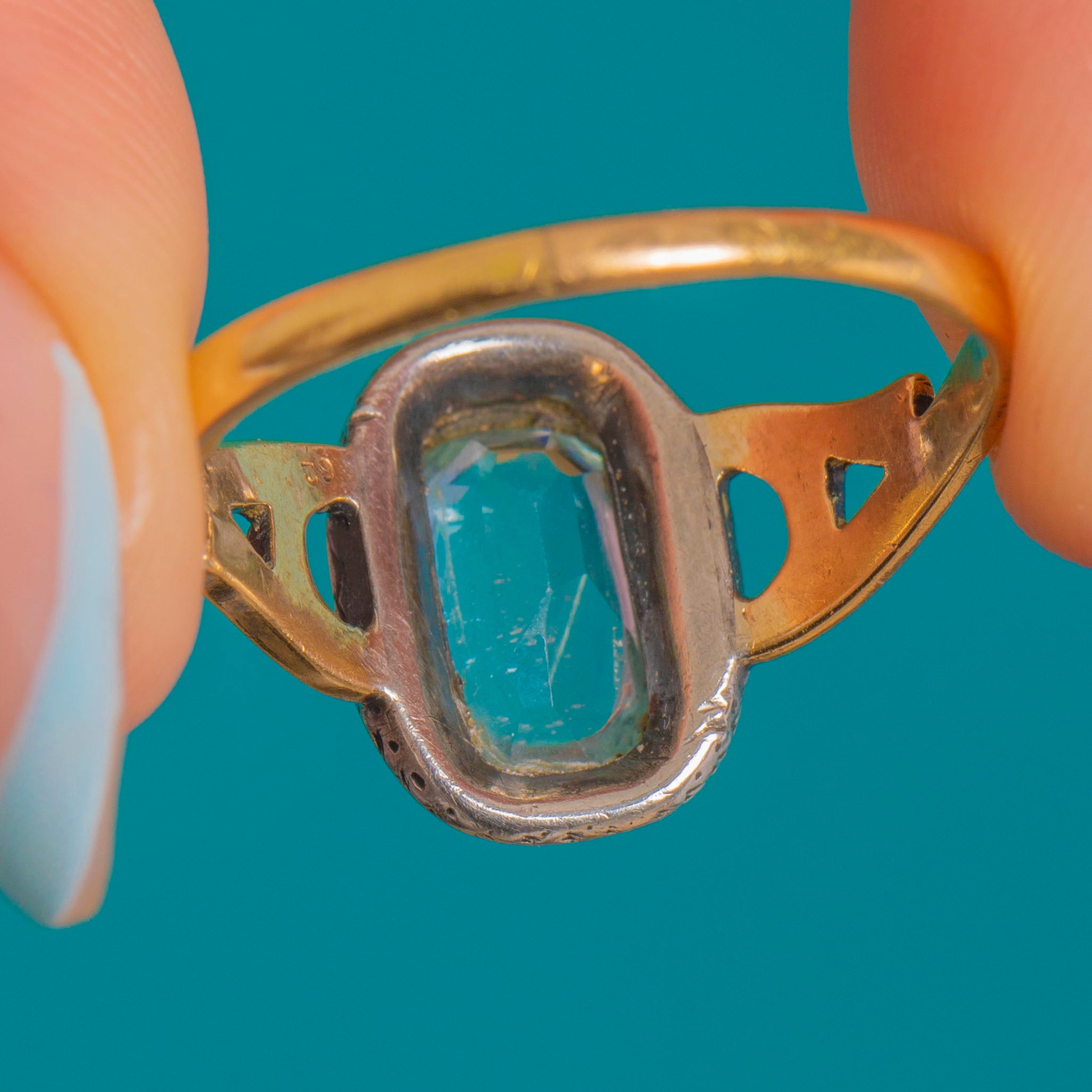 Elegantly split, pierced shoulders with dark navette accents lead to a pretty under-gallery, lending lightness and intricacy to the head. Stamped with the French Eagle’s Head and set with an Aquamarine of approximately 1.80cts, this antique jewel offers that effortless, softly-sparkling charm we love from the turn of the century.