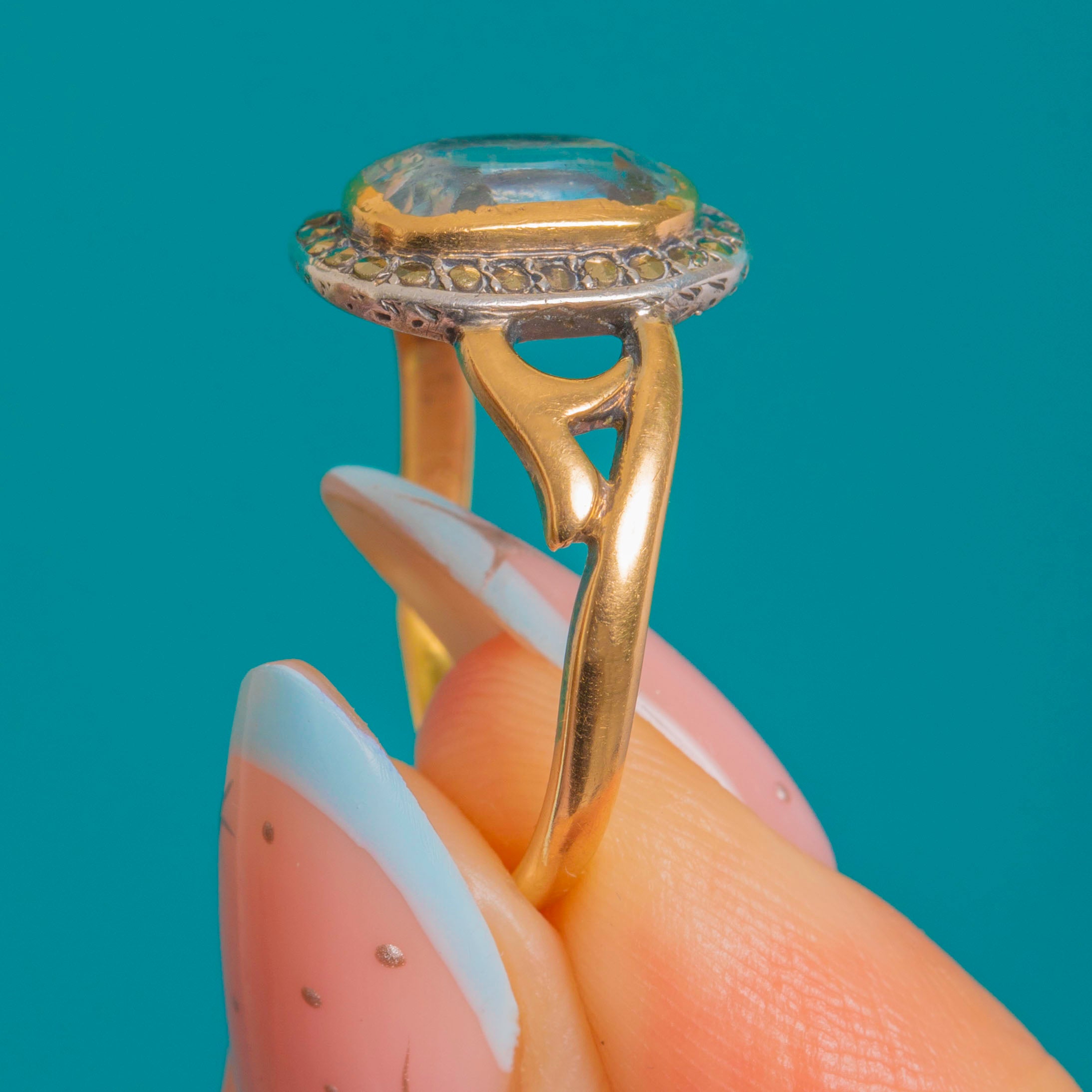 French Art Nouveau 18ct Gold Aquamarine & Marcasite Cluster Ring