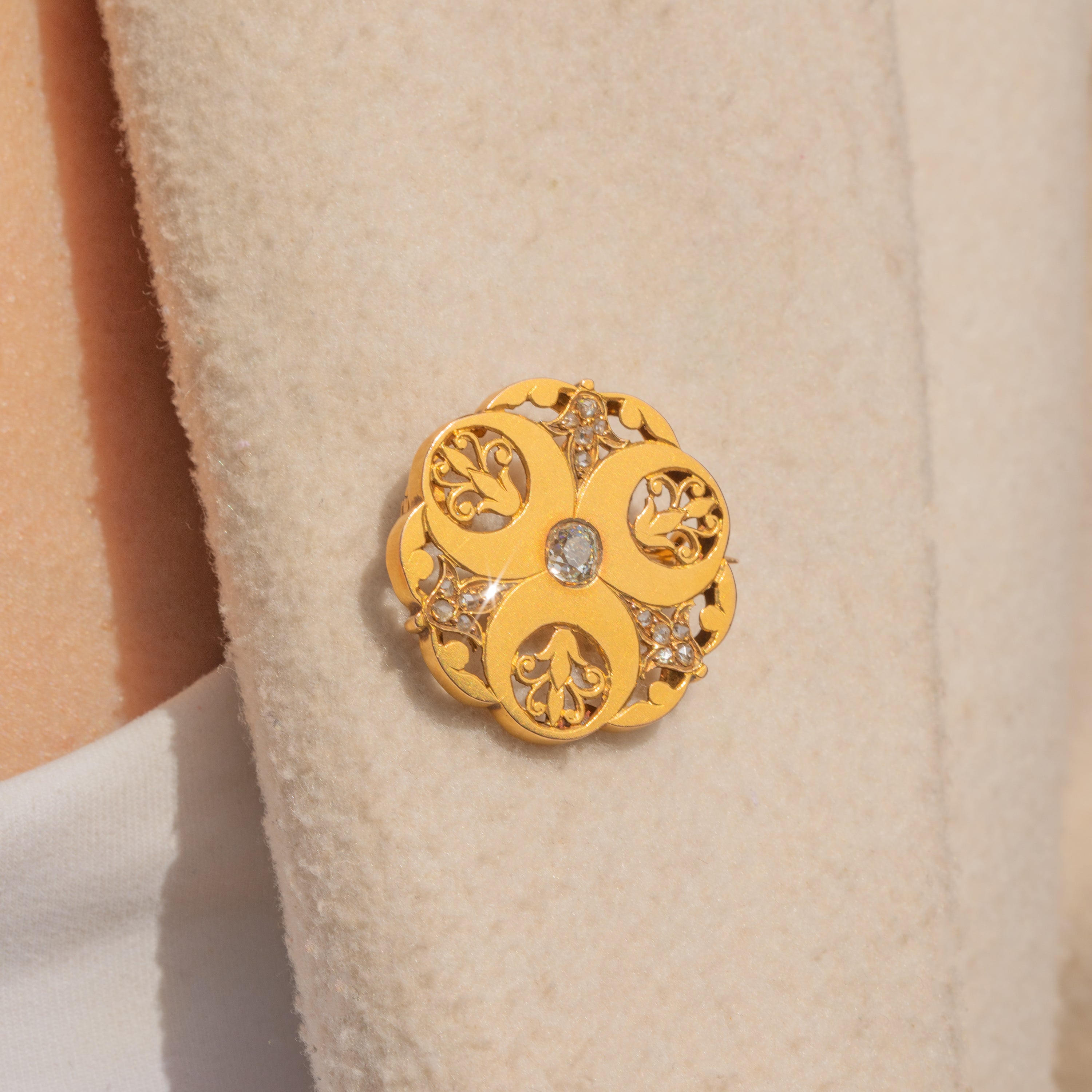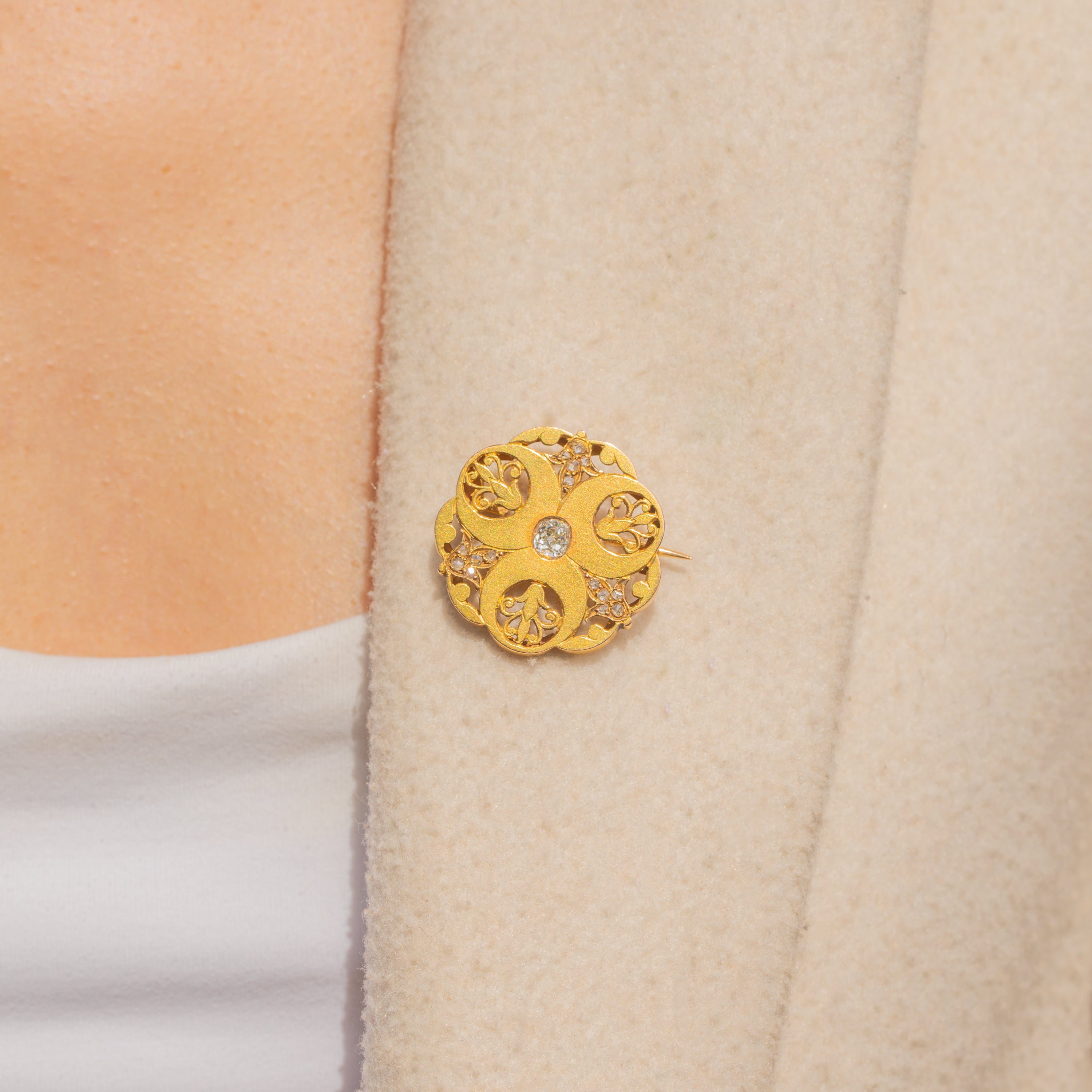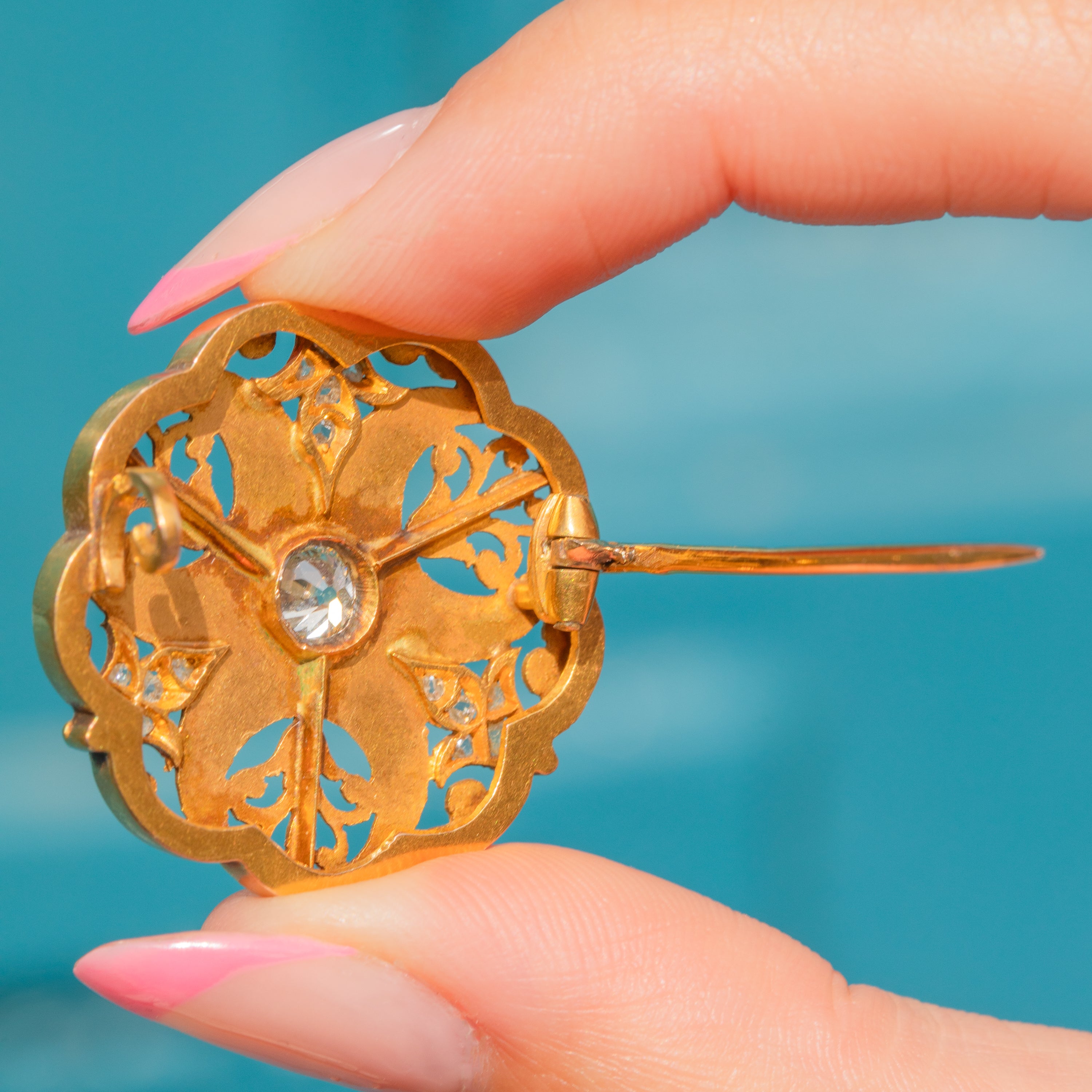 VERY GOOD-EXCELLENT: This French Art Nouveau 18ct Gold old-mine-cut Diamond openwork brooch is in superb condition. The Gold is radiant with a lovely satin finish, and the details are defined with no signs of wear. The Diamonds are all present and securely set, and the central old-mine-cut Diamond is nice and bright. The Gold shows some minor areas of discolouration on the back of the brooch, though this won't be visible while the brooch is worn. The pin is robust and sturdy, allowing you to wear this French antique Diamond brooch with absolute confidence!