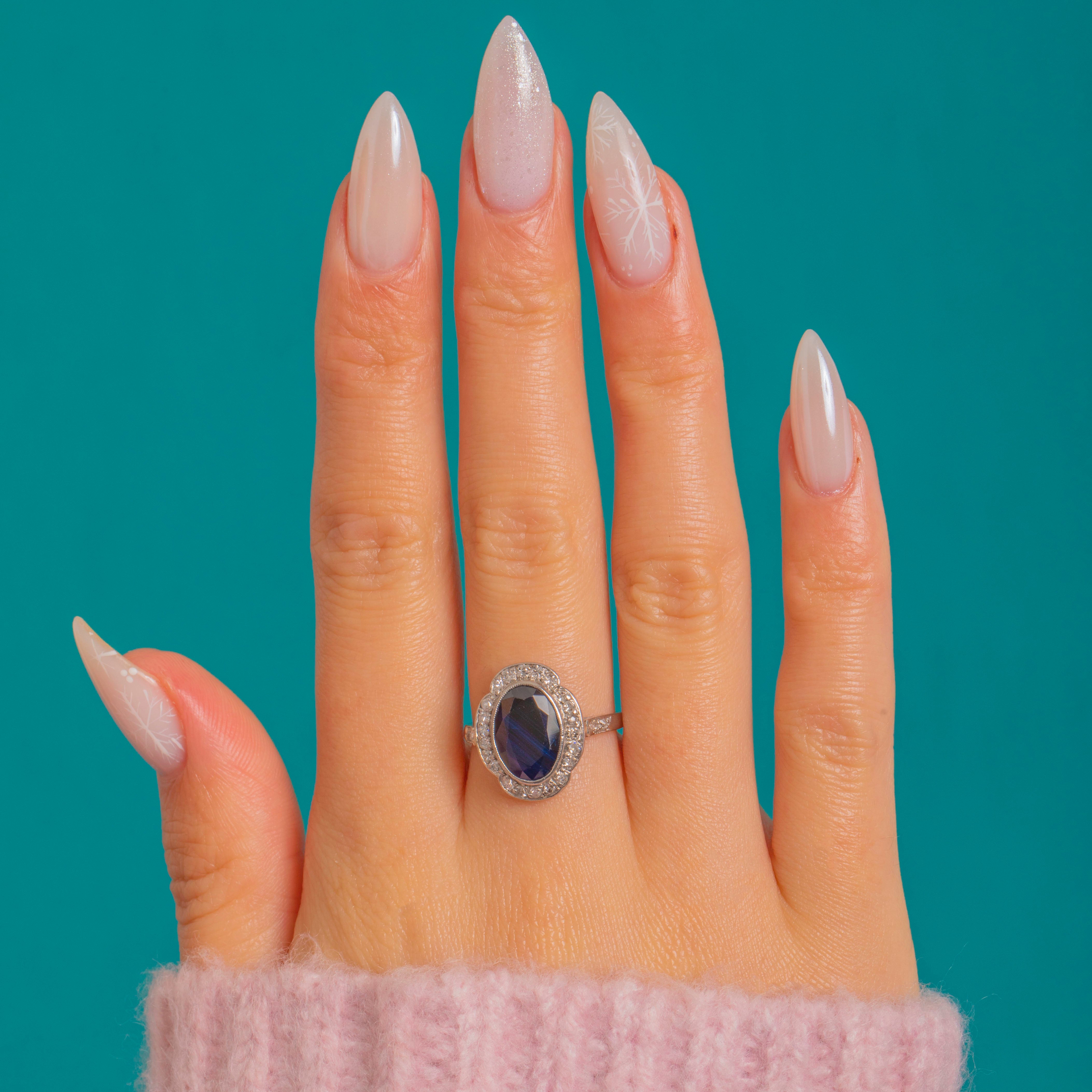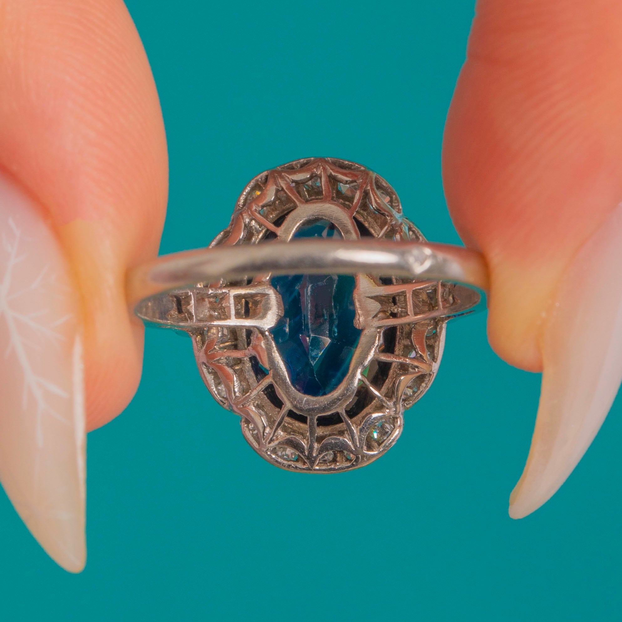 The shank tests as Platinum, while the head and settings are 18ct White Gold, giving the face a bright, silvery look that perfectly complements the Sapphire’s inky-blue depth. The Sapphire is noted as having no indication of heat.