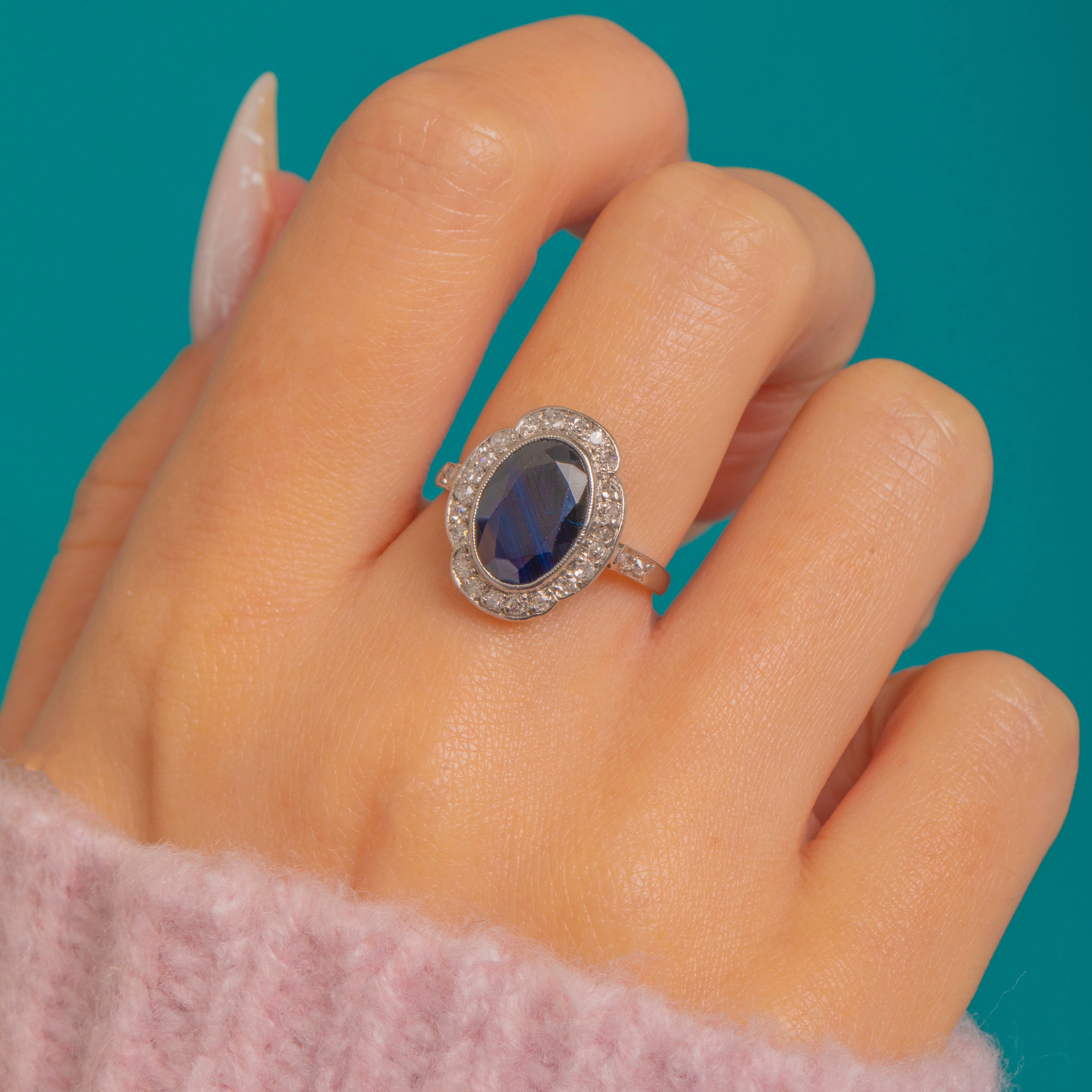 An elegant Antique French cluster ring, crowned with an oval Natural Sapphire measuring 10 x 8mm (approx. 1.70cts), framed by a glittering halo and finished with Diamond-set shoulders. It’s a timeless engagement style that feels both romantic and beautifully wearable.