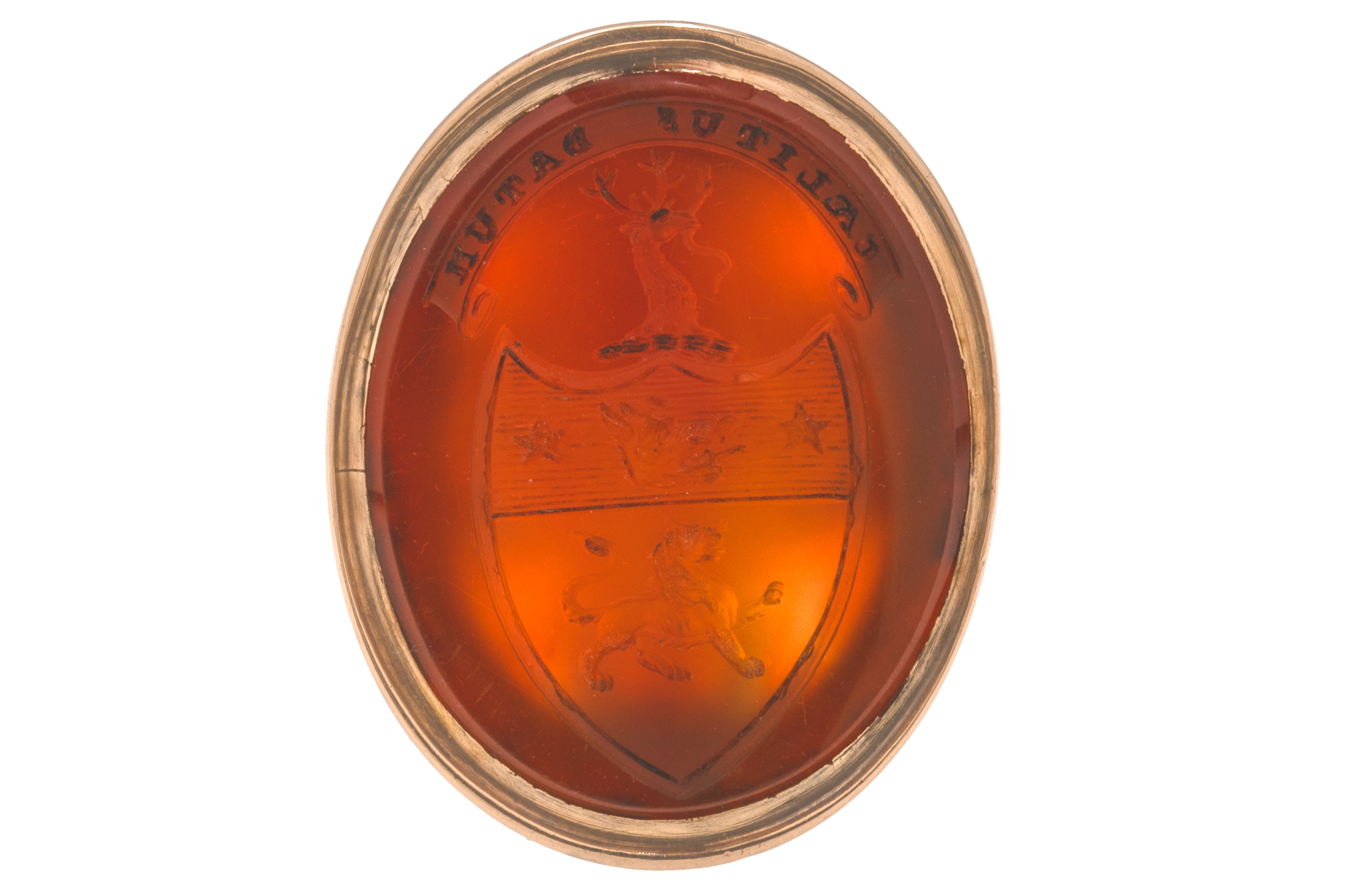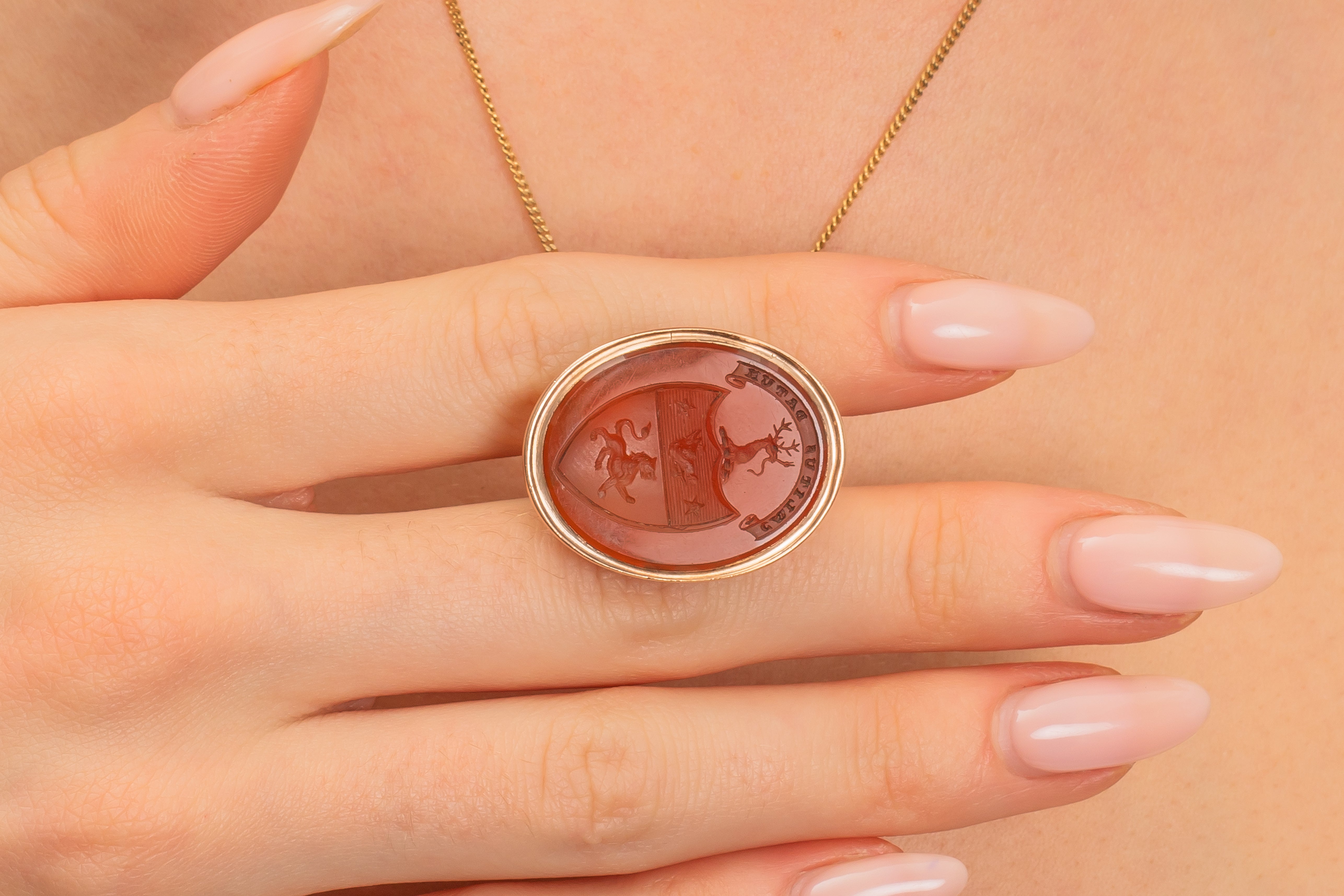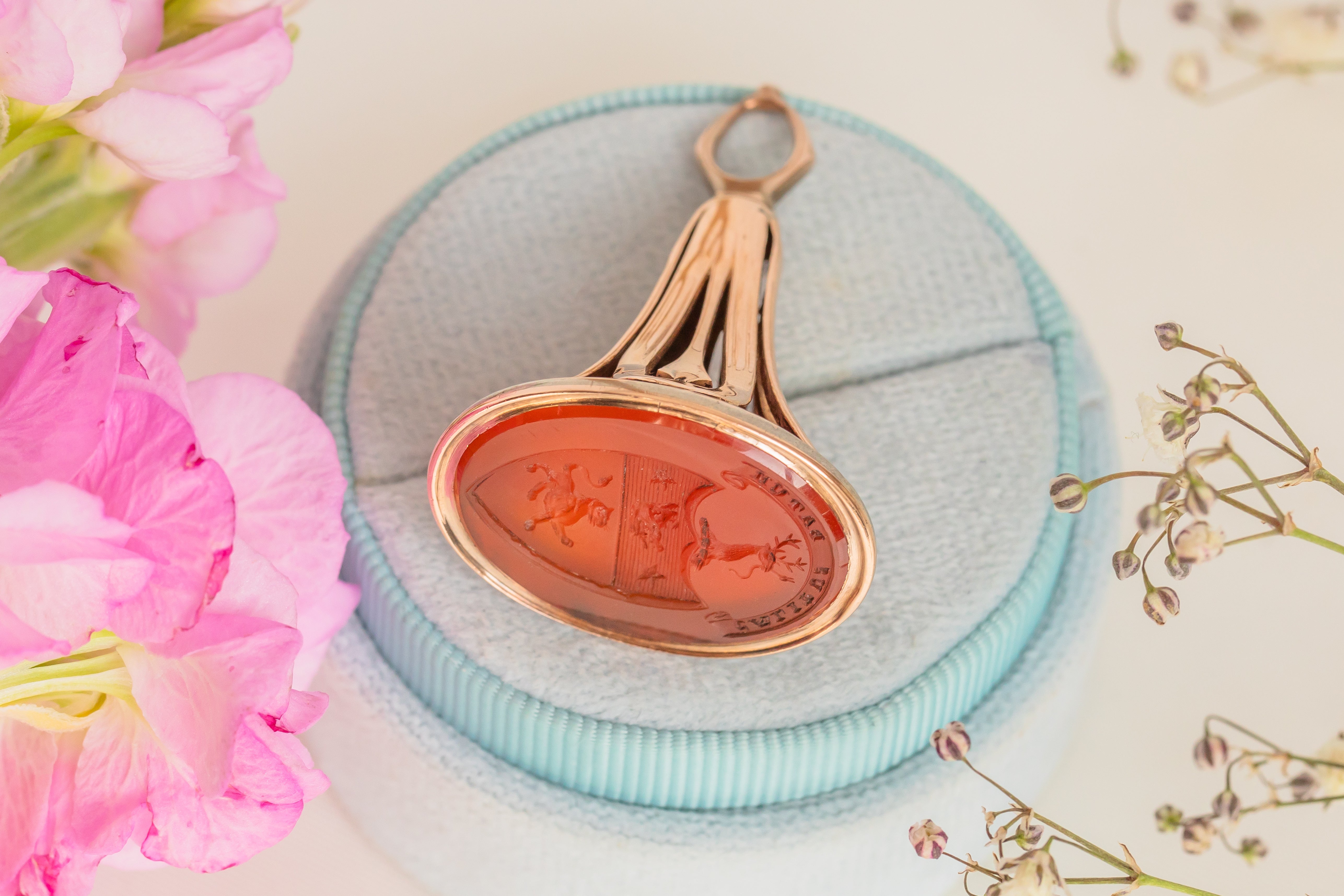 ジョージアン 9ct ゴールド カーネリアン インタグリオ フォブ ペンダント、「神からの贈り物」