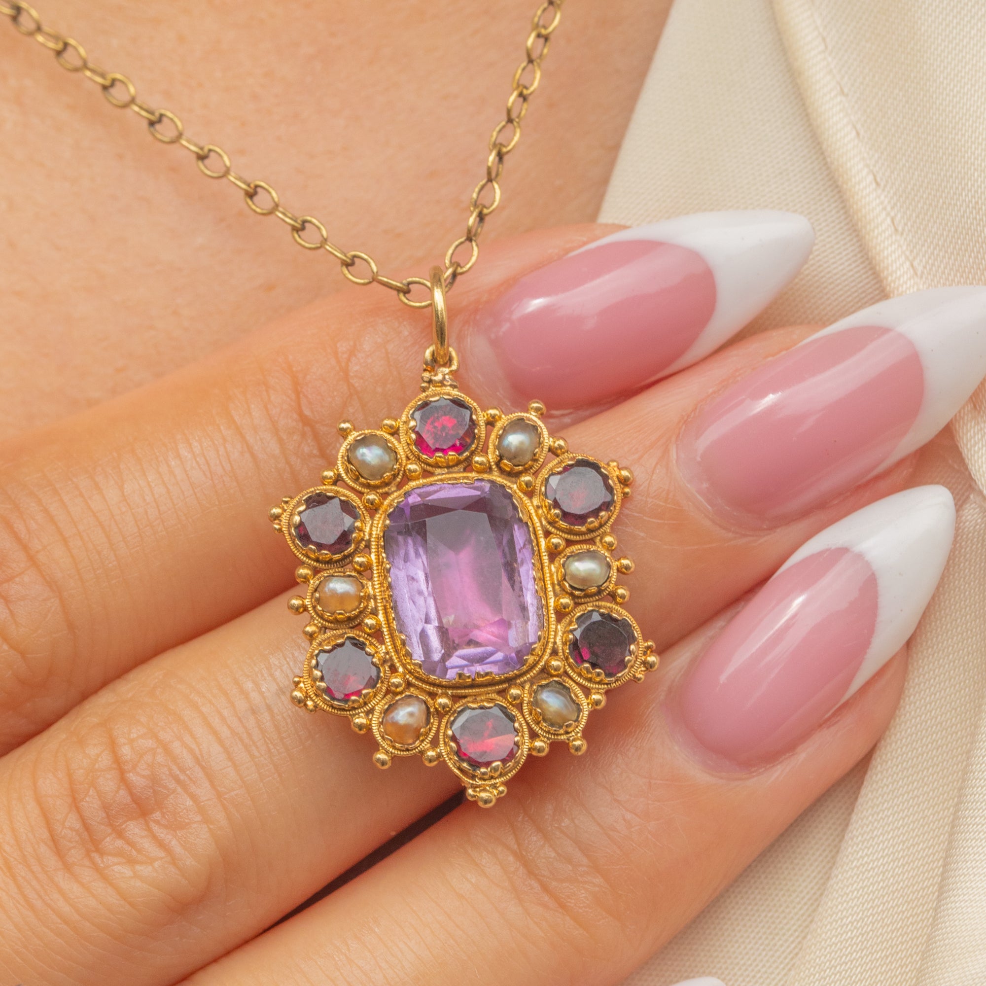 MATERIALS: Tests as 15ct Gold, Amethyst (2.25ct), Garnets, Pearls