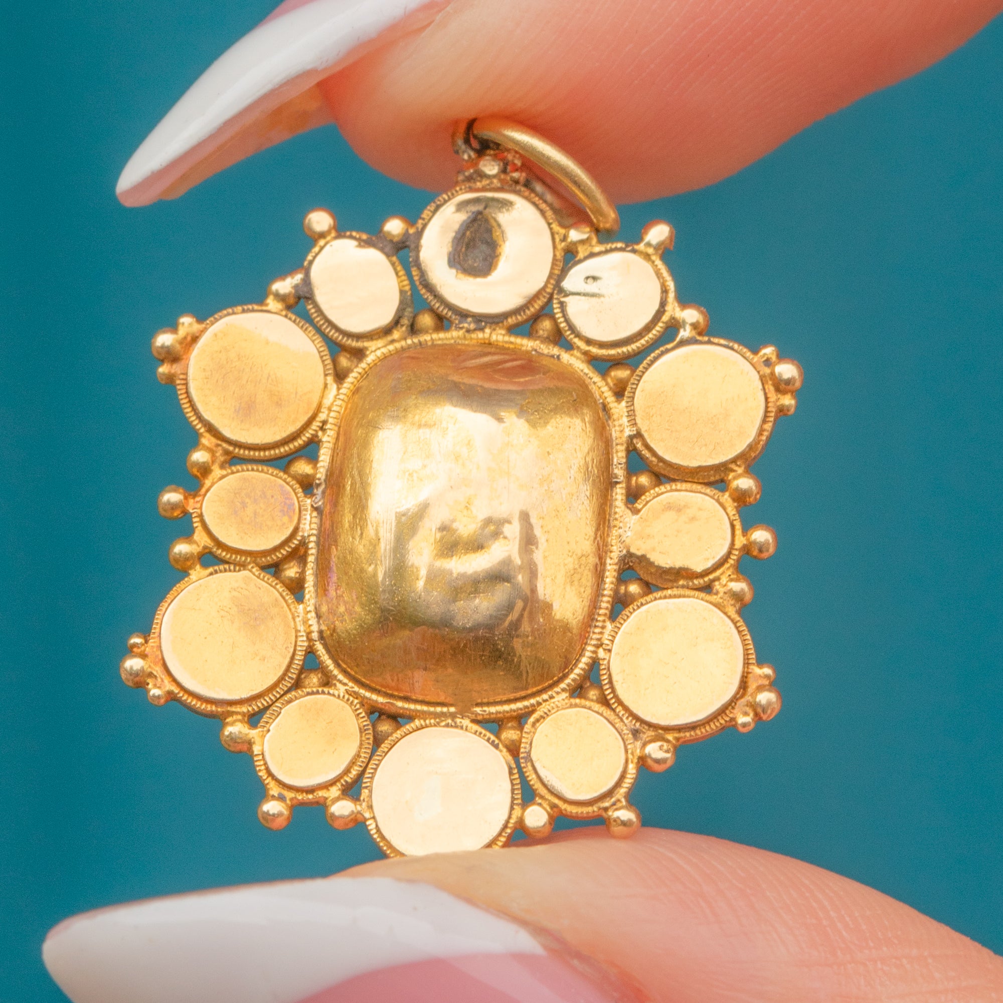 EXCELLENT: Each gemstone is radiant and secure within its settings. The are some scratches on the back of the pendant, though this cannot be seen when wearing. Complete with a securely attached jump ring, this Georgian charm can be worn with utmost confidence.