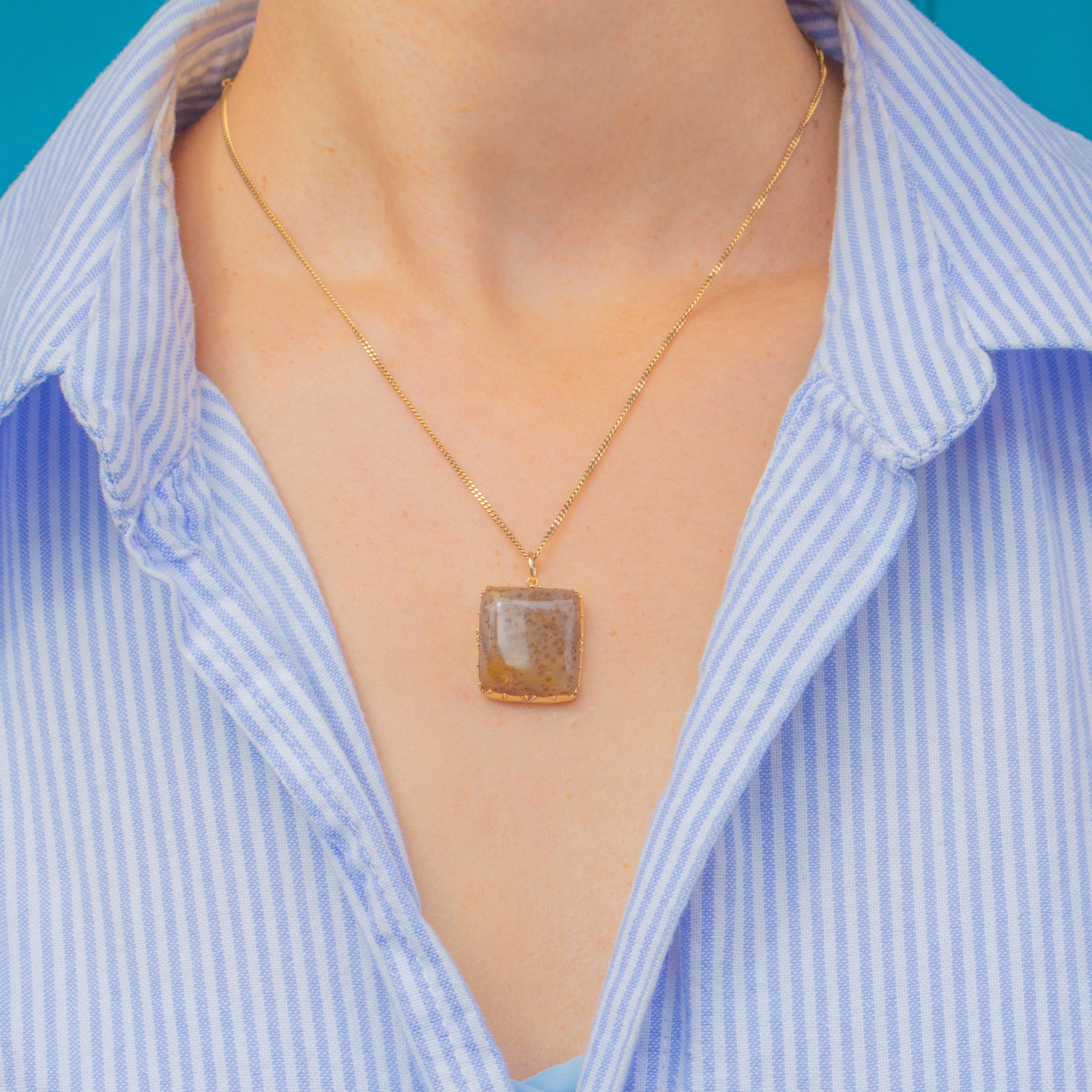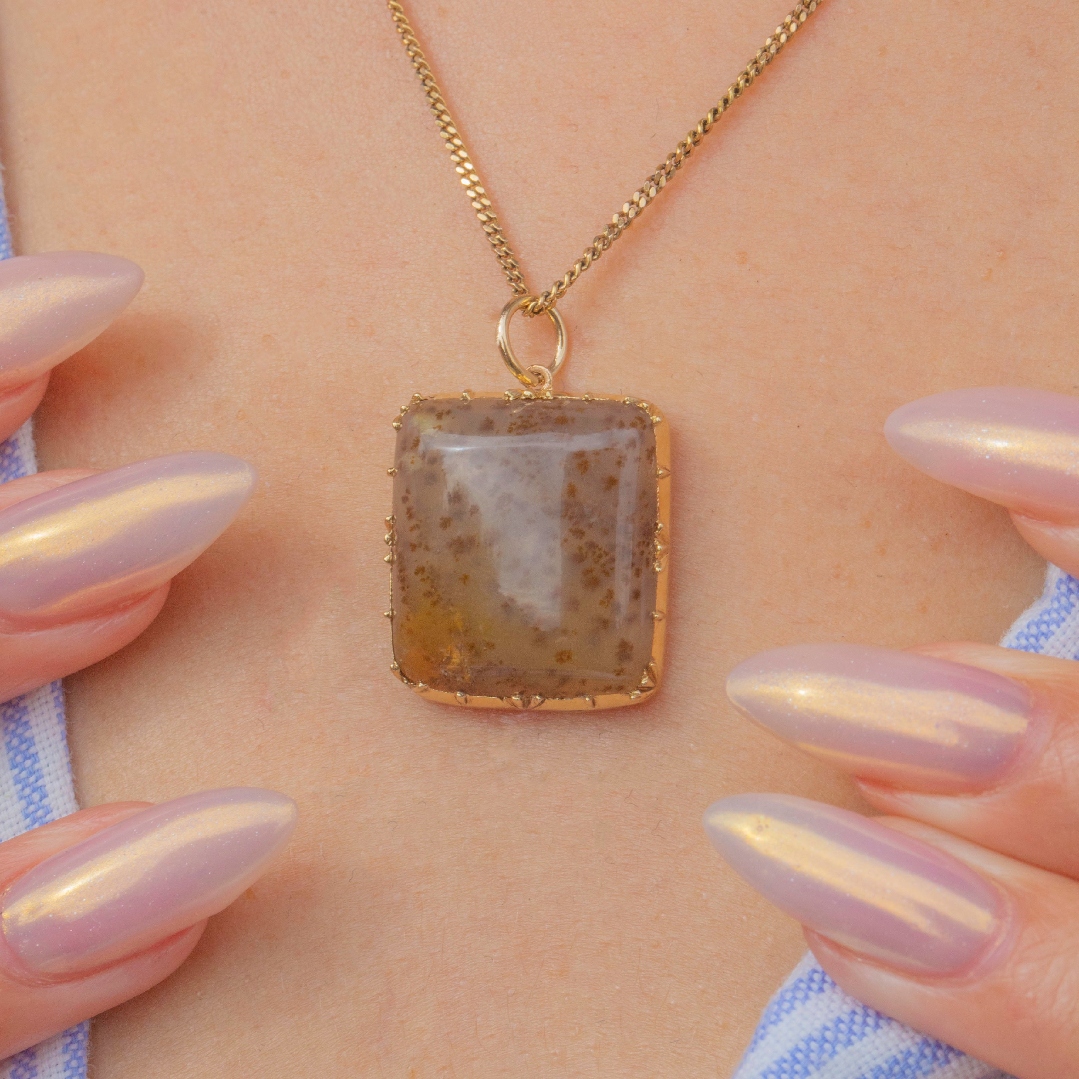 A refined Georgian pendant crafted in 15ct Gold, featuring a striking Dendritic Agate with natural fern-like inclusions. The intricate patterns within the Agate make each piece unique, highlighting the delicate artistry of Georgian jewellery. Elegant and understated, it is a timeless pendant that can be worn alone or layered for a subtle antique statement.