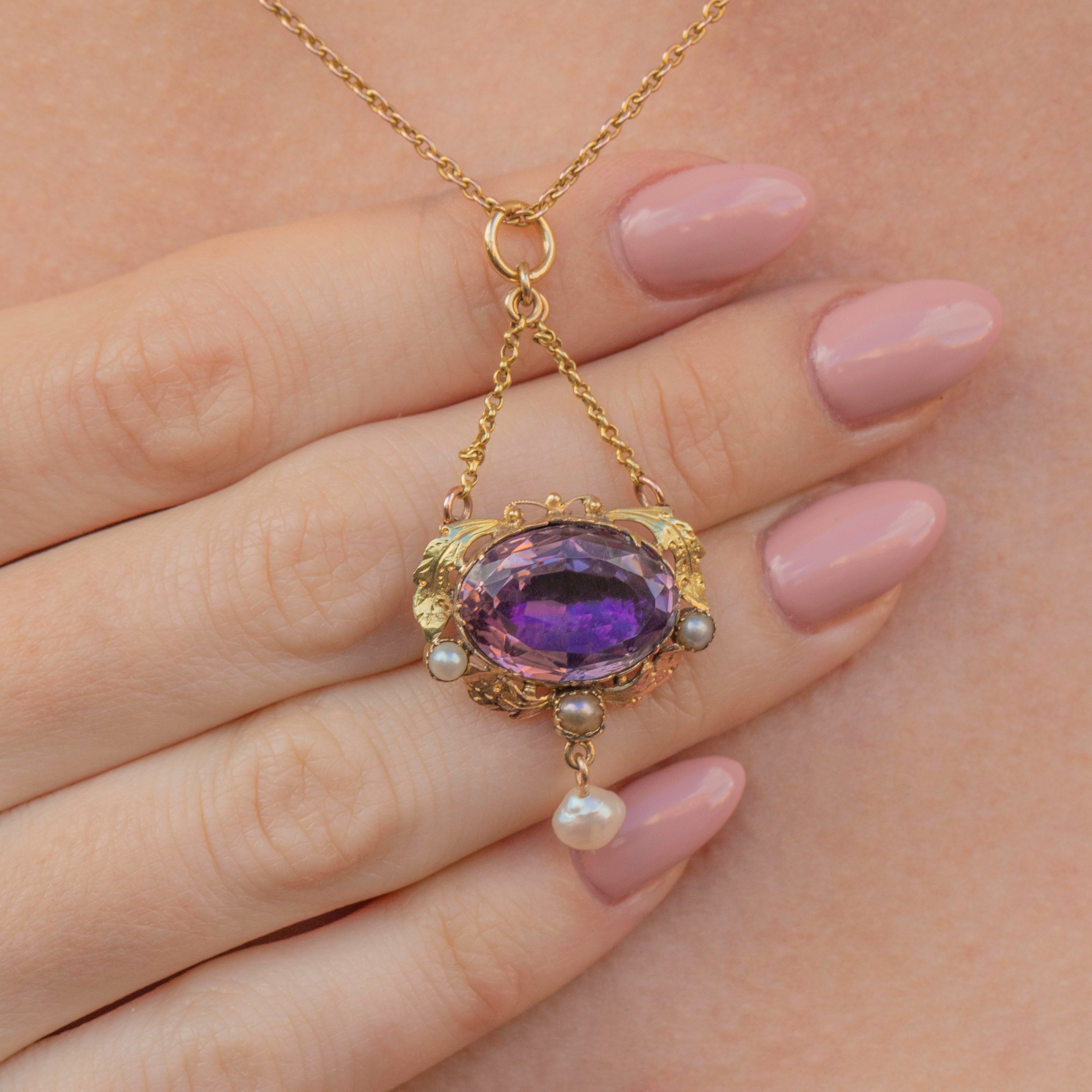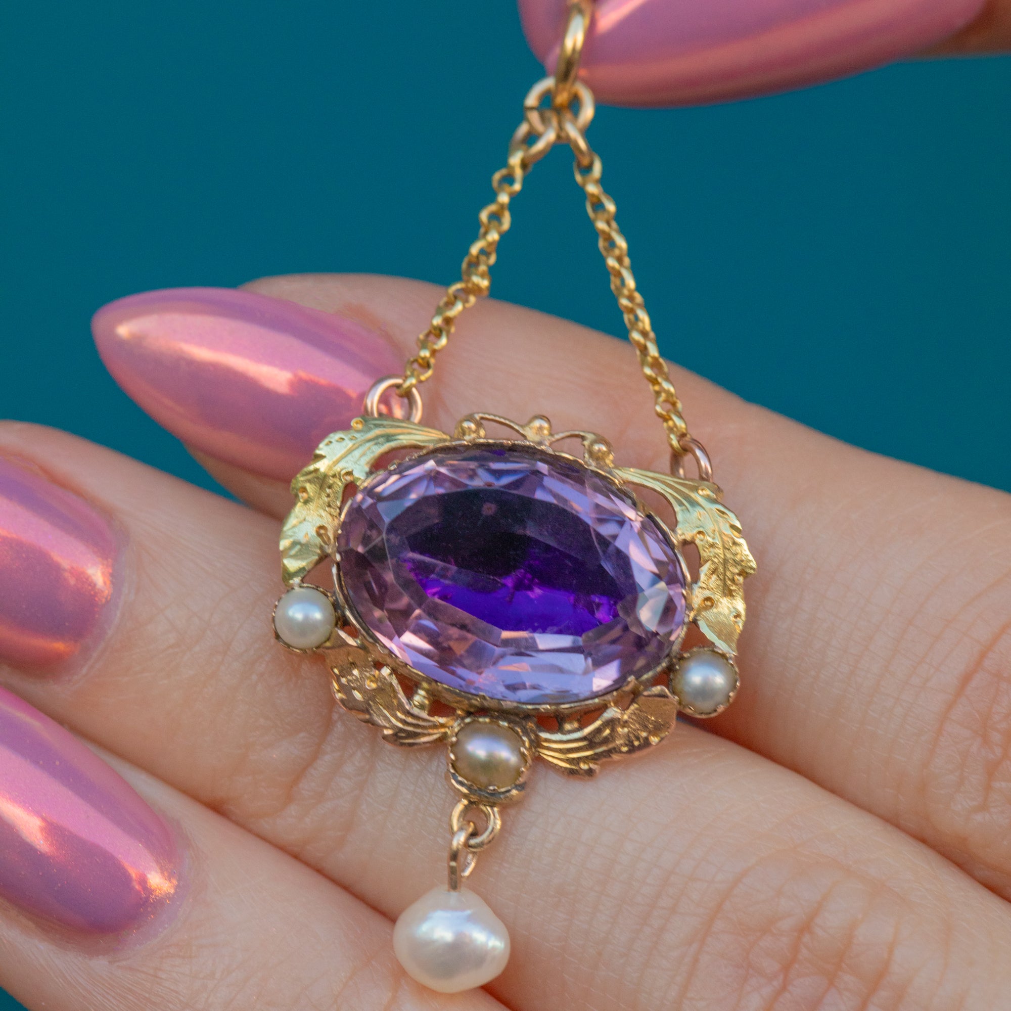 VERY GOOD. This Georgian 15ct Gold foiled Amethyst pearl drop pendant is in very good condition! The Amethyst sits securely, and although there are a couple of nicks to the edge of the setting, her foiled back creates a gorgeous display of purple hues. The Gold flourishes are well formed with lovely engravings creating texture. There are a few dings on the domed back, however, the Gold still possesses lovely reflective qualities and this doesn't affect its comfortability. With two chains and a jump-ring to finish, you can wear this Georgian Amethyst pendant with confidence!