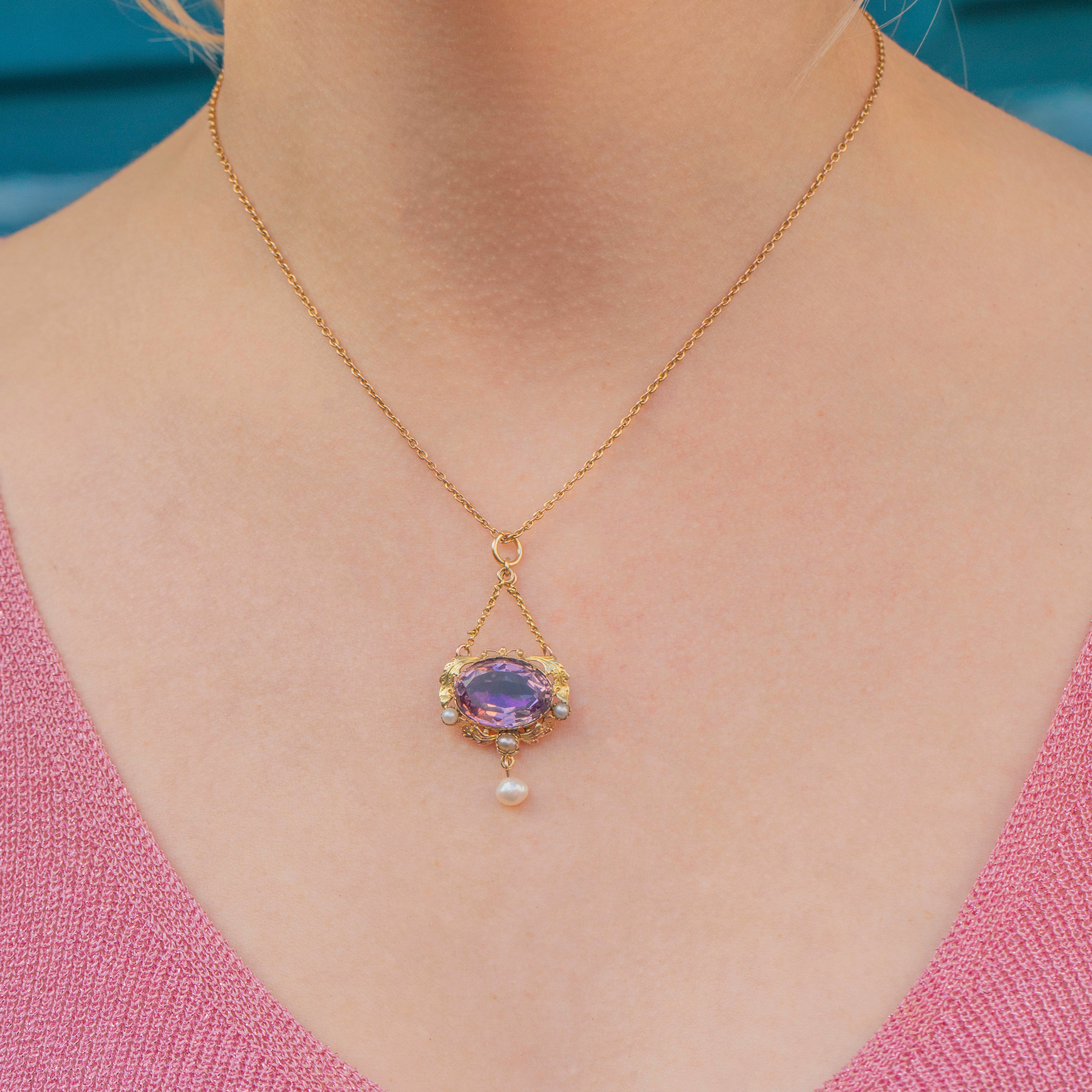 Georgian 15ct Gold Foiled Amethyst Pearl Drop Pendant, 5.70ct