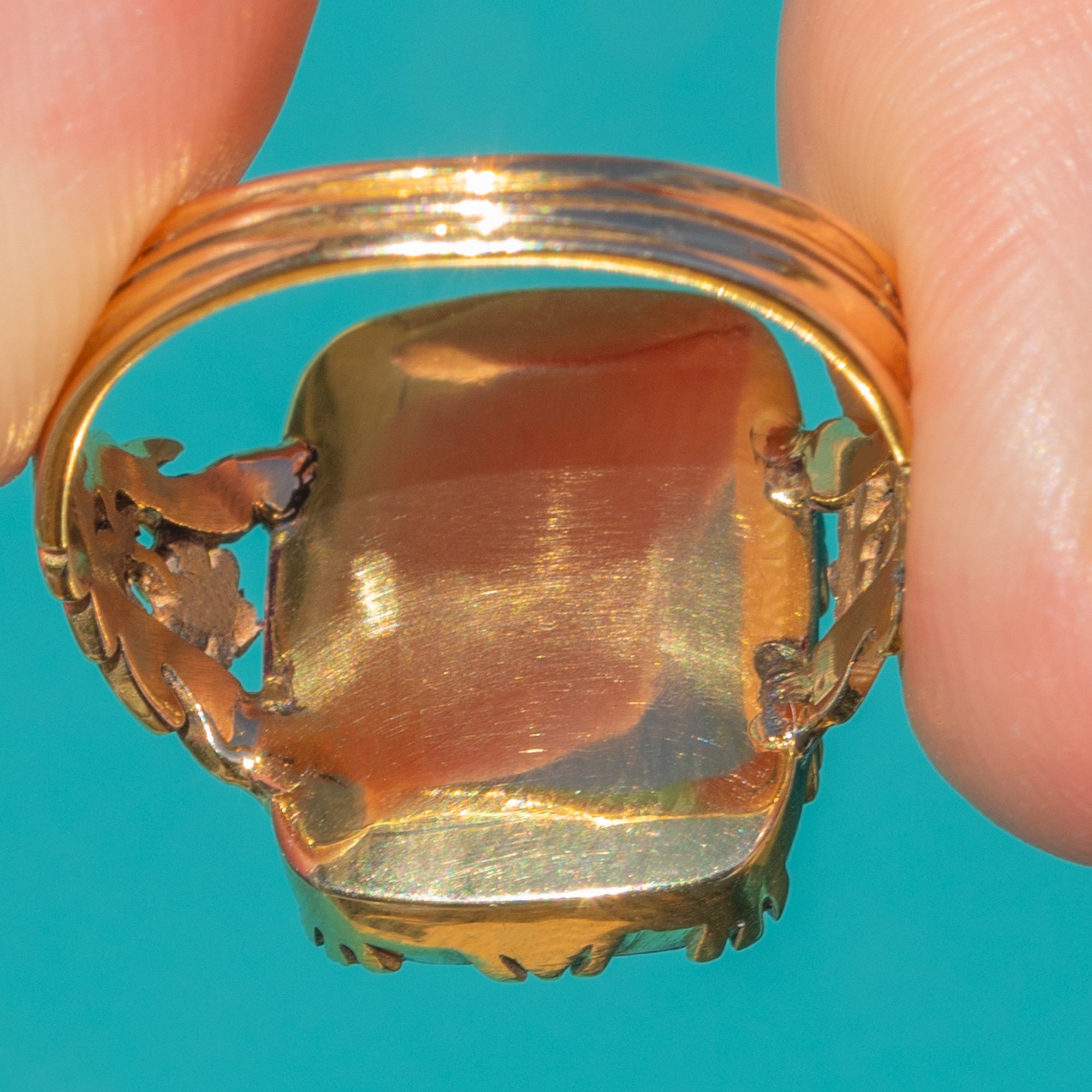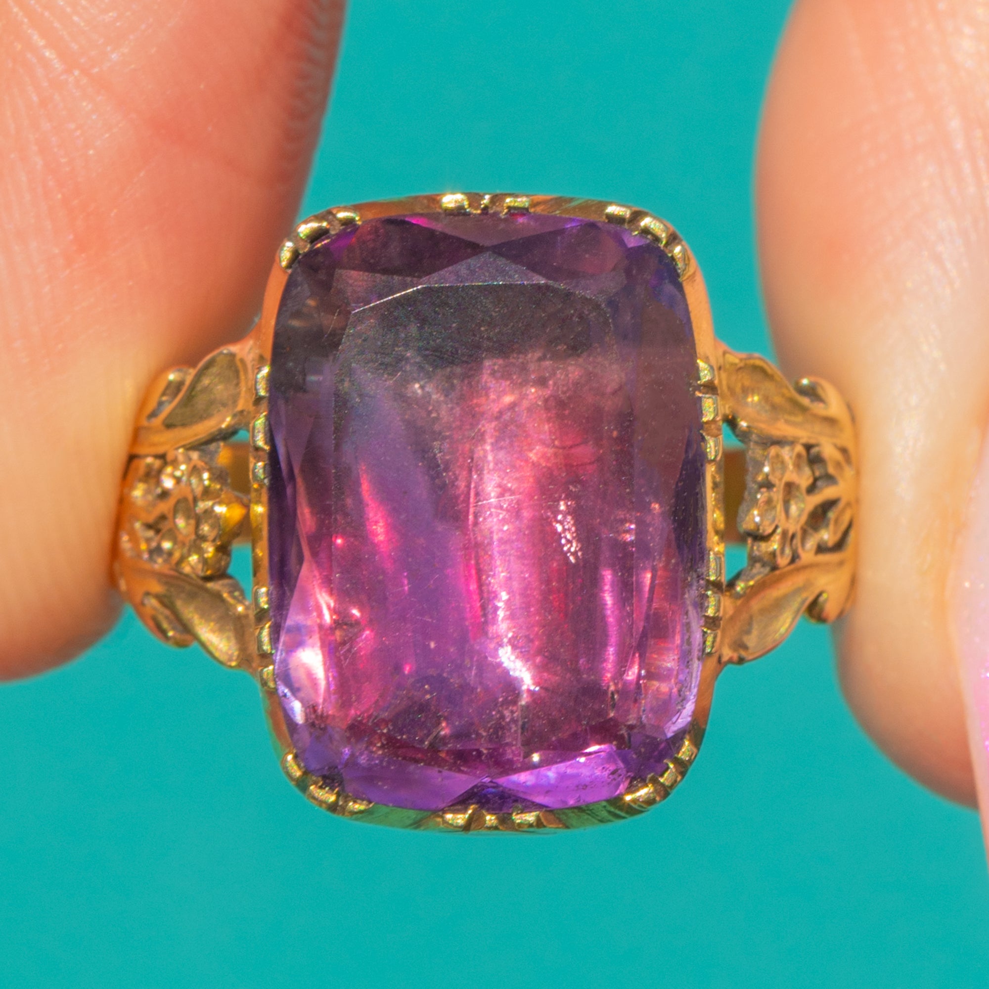 豊かな紫色と温かな薔薇色の輝きを湛えたこのGeorgian期の十五金指輪は、見事な8.60カラットの箔裏打ちアメシストを高いコレットに据えた逸品です。波形の覆輪と透かし細工の草花模様の台座が奥行きと詩情を添え、装飾的な肩と分かれた腕が彫刻的な輪郭を完成させています。