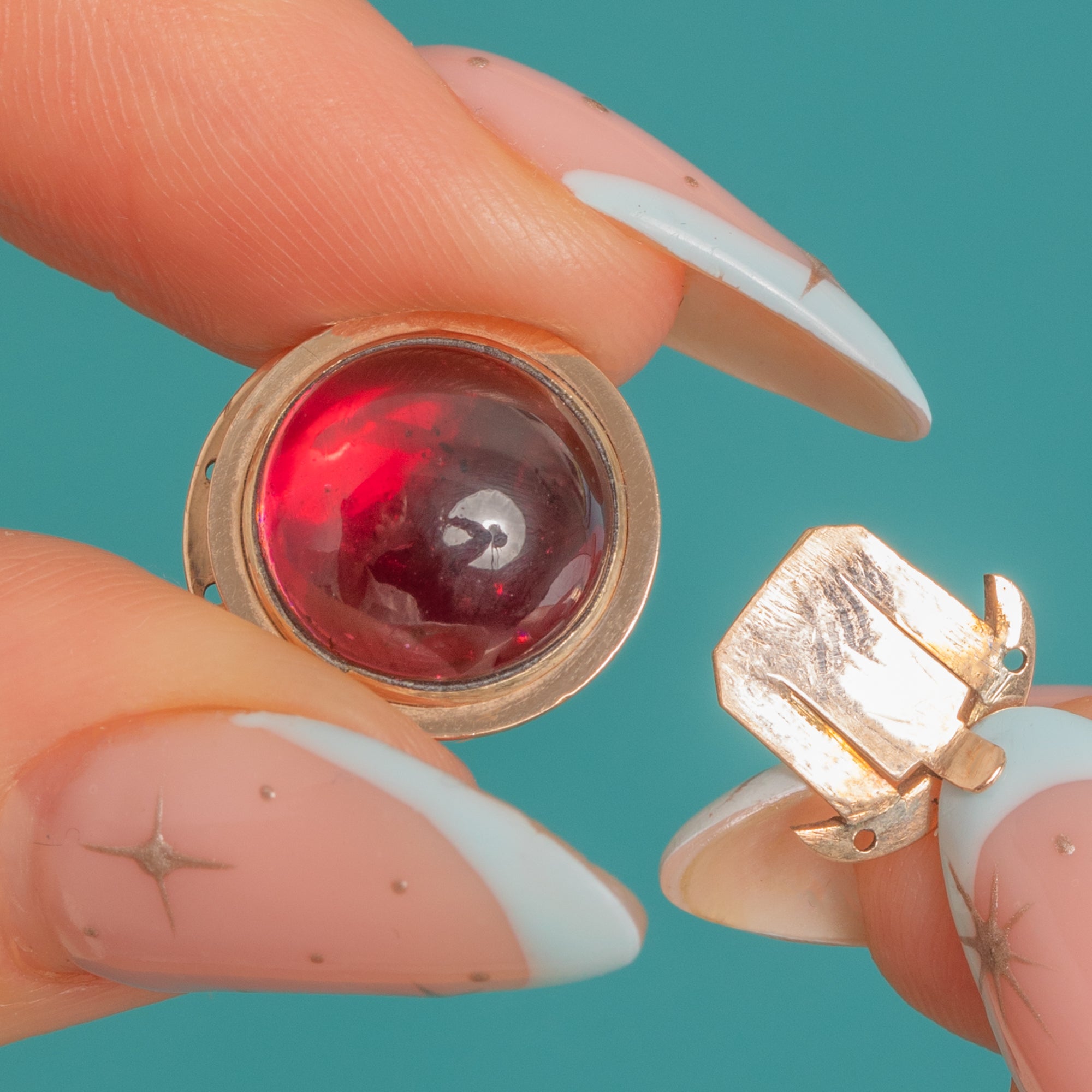 Rich, wine-red and wonderfully domed, this Georgian Garnet cabochon is showcased in a smooth 15ct Gold surround, creating a petite yet striking clasp with timeless elegance. The glowing 4.30ct cabochon sits proud and glossy, its deep crimson hue lending a luxurious pop of colour that feels both refined and romantic.