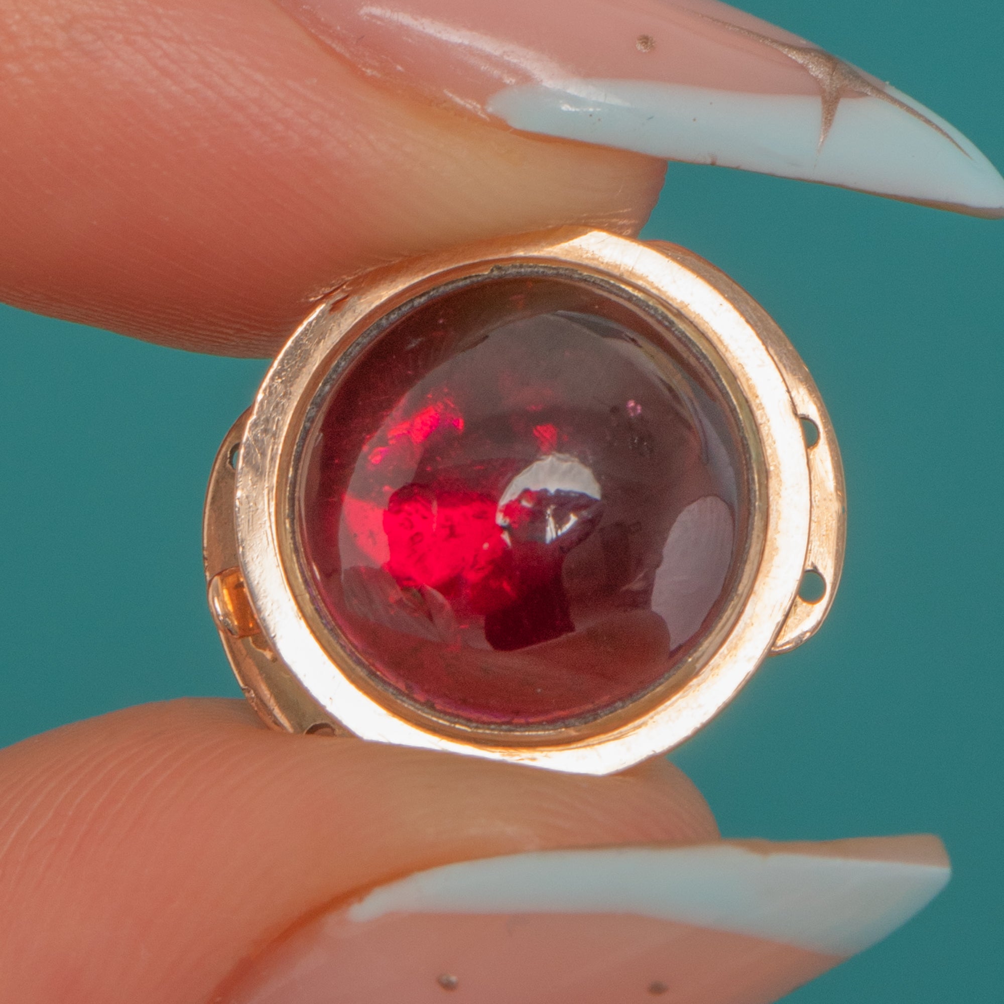 EXCELLENT: The Garnet cabochon is bright with minimal surface wear visible under magnification only. The 15ct Gold setting is clean and well-preserved with light, even surface marks and a gentle antique patina. No signs of repair or alteration observed.
