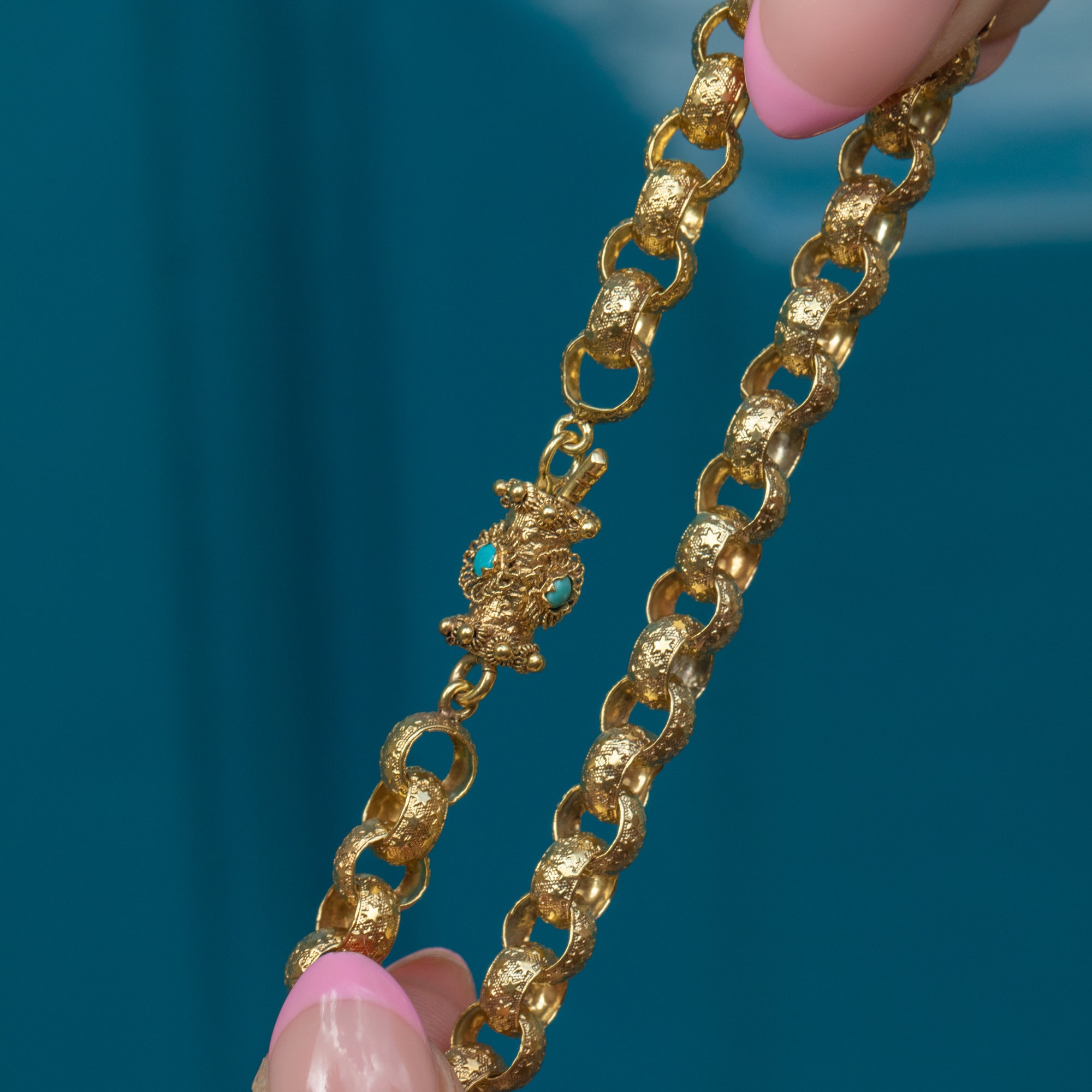 Wow, what a piece this Georgian 15ct Gold star link bracelet is! The amazing Turquoise cannetille clasp is the finishing touch! If you take a closer look at this splendid braclet you will see teeny tiny little stars on every link! Her high carat 15ct Gold is still in amazing shiny condition even considering the fact she is over 200 years old!
