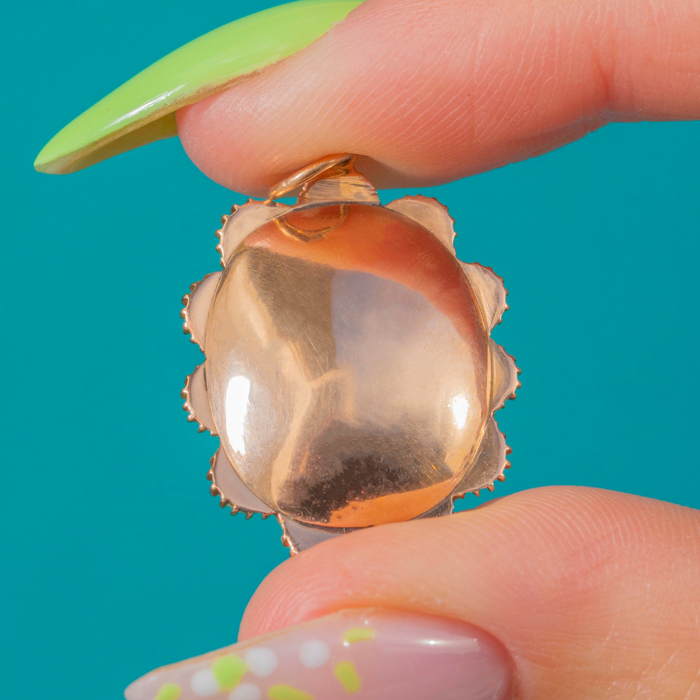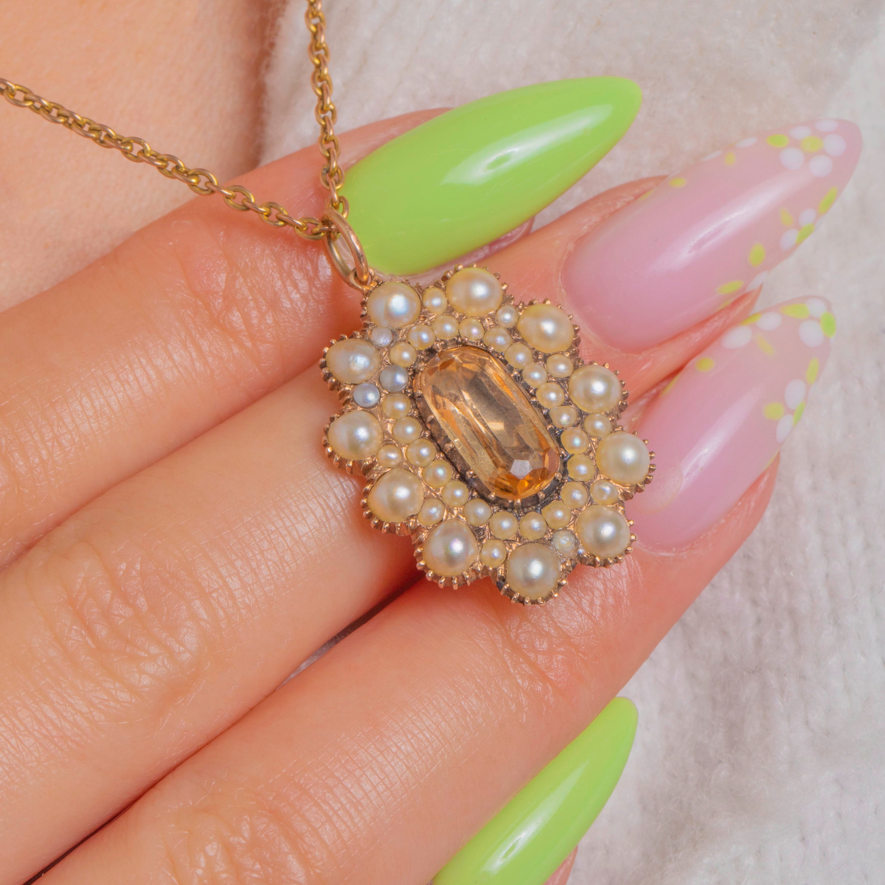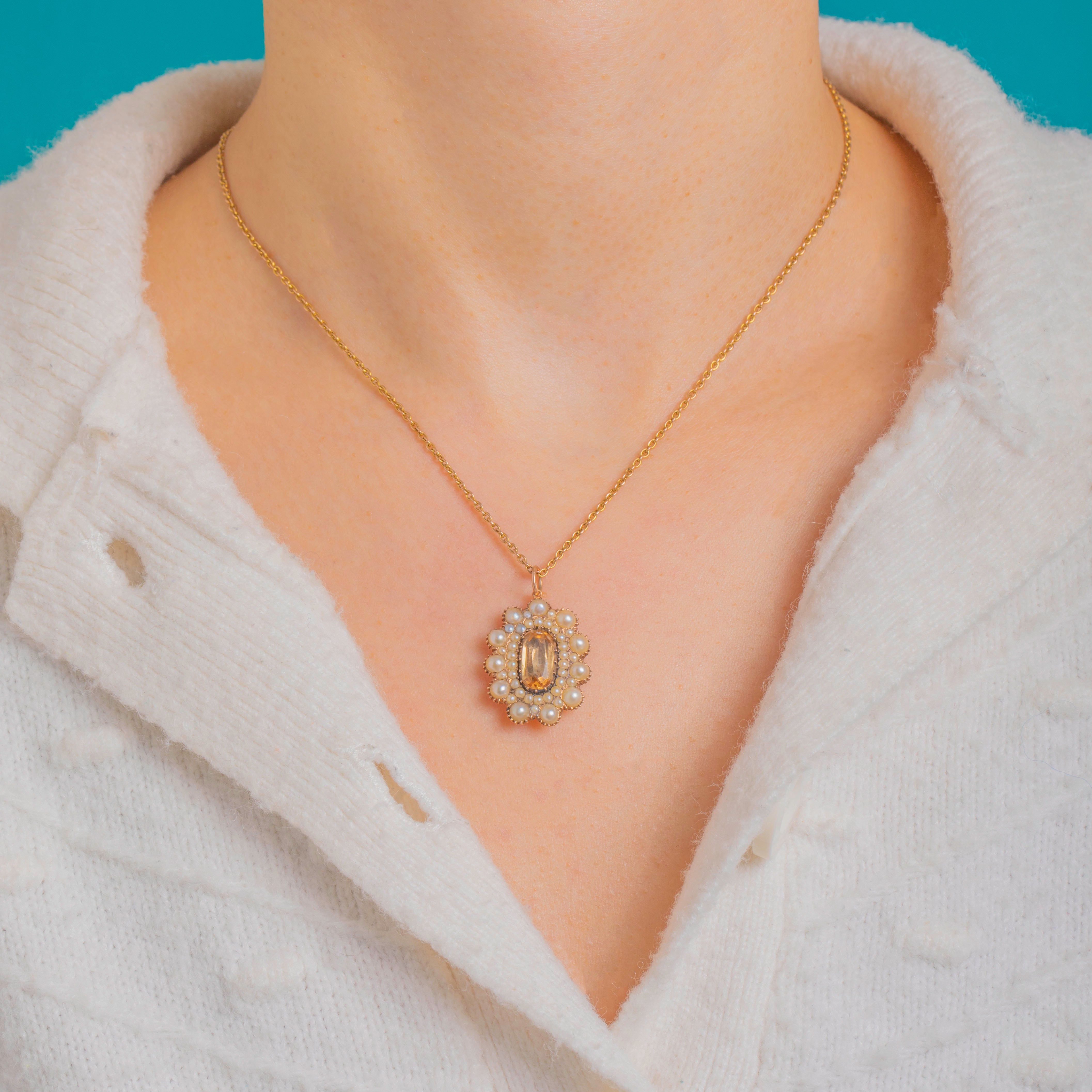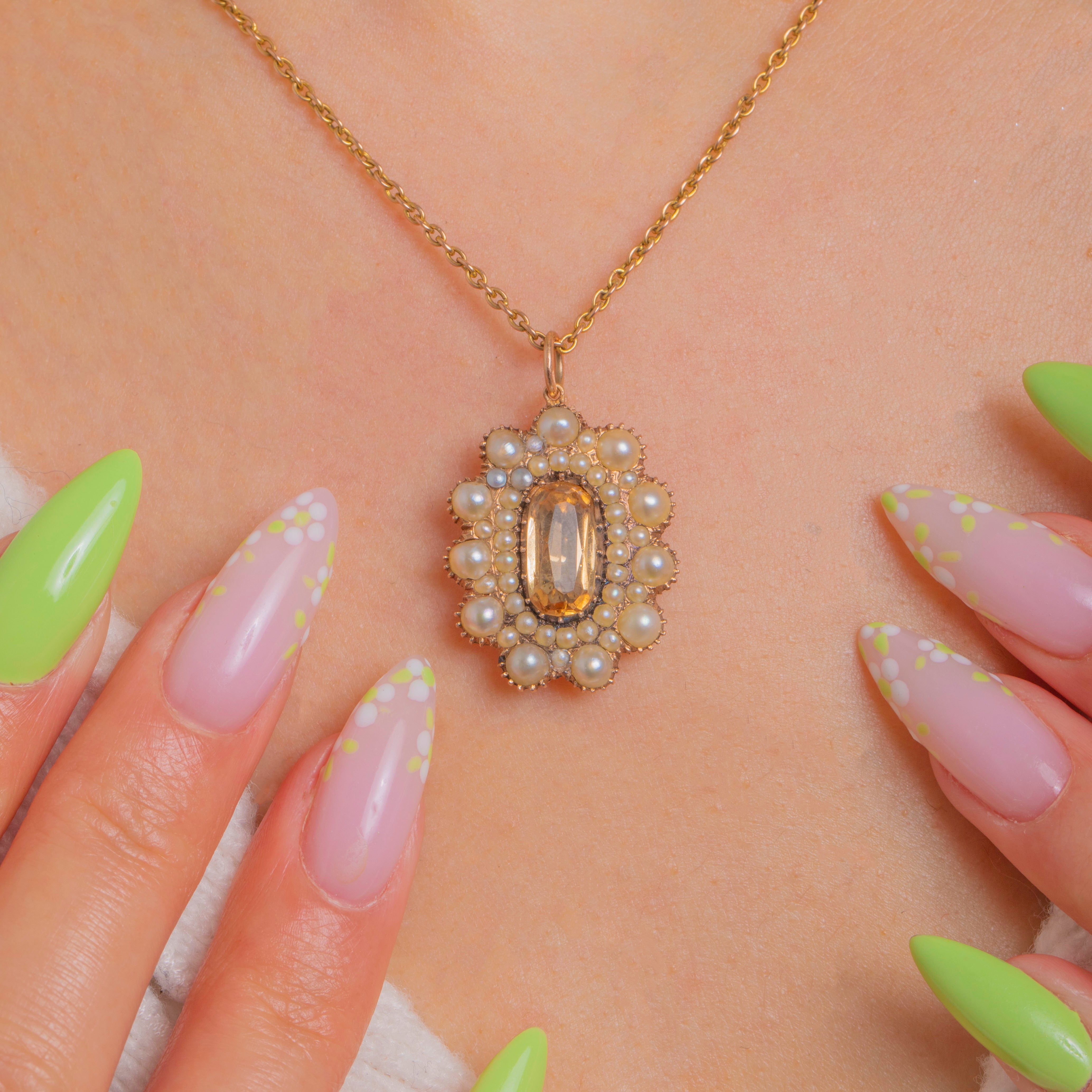 優美でロマンティックなこちらのGeorgian 15ctゴールド クラスター ペンダントは、蜂蜜色のトパーズを中心に、精緻なコレットに配された光沢あるパールが取り巻いています。縦長のファセットカット・トパーズはクローズドバック セッティングに収められ、クリーミーなパールが同心円状に重なり合い、花のロゼットを形作っています。繊細なビーディング装飾と15ctゴールドの温かな輝きが全体を一層引き立てています。
