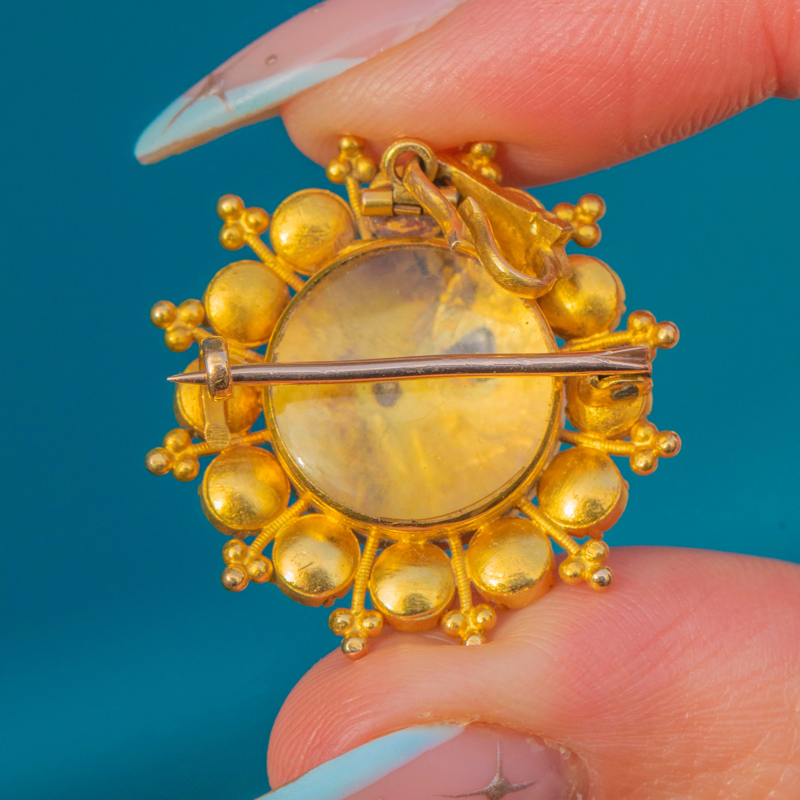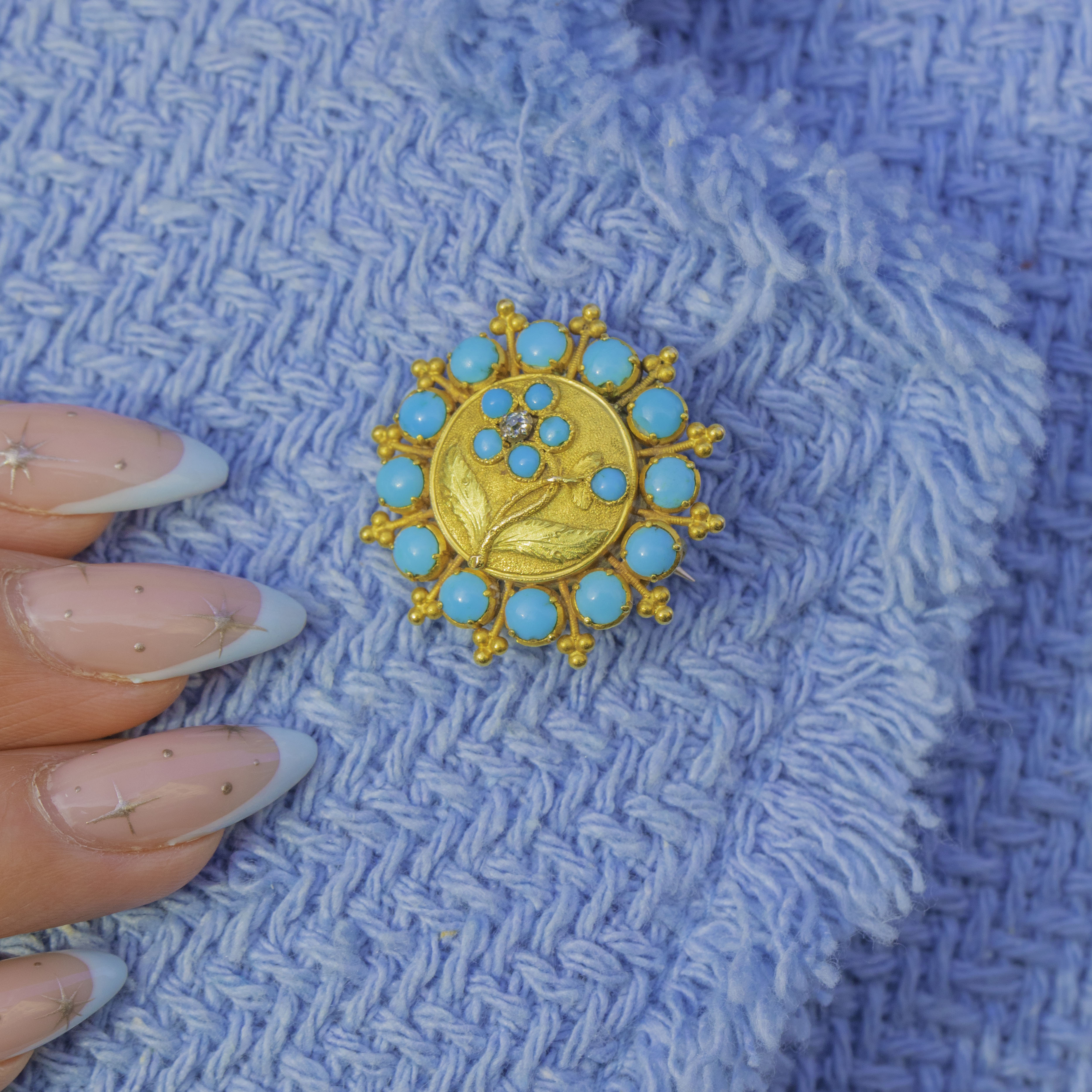 A luminous Georgian treasure in rich 15ct Gold, this convertible pendant-brooch is haloed by bright Turquoise cabochons and crowned with a petite Diamond at the heart of a delicate floral rosette. The central plaque has a satin, chased finish with applied foliate detail, while fine granulation and beaded knops lend beautiful texture and depth around the perimeter and surmount.