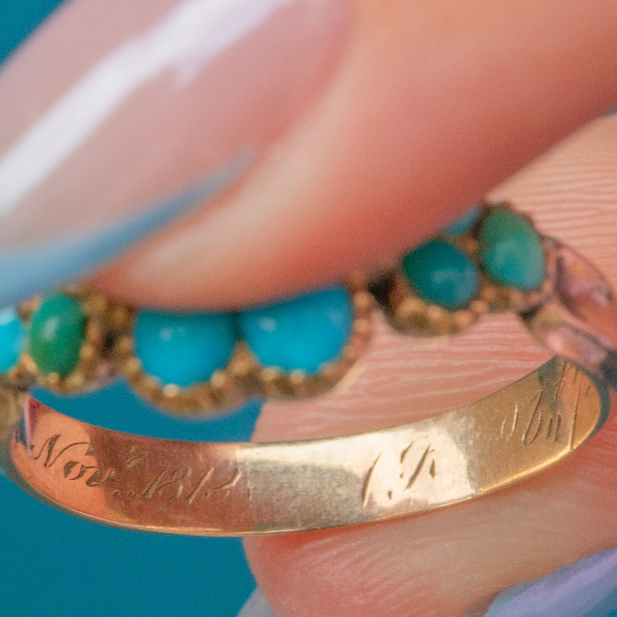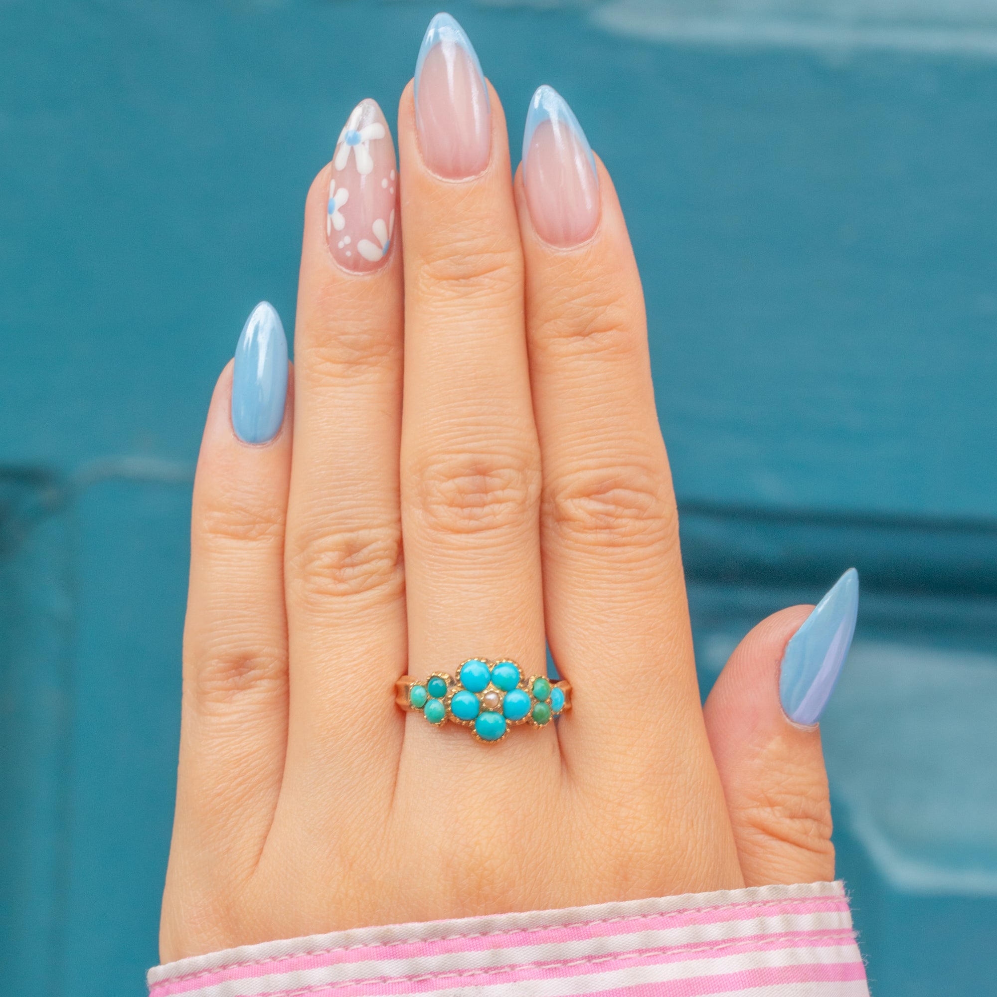 Each Turquoise stone has its own distinct blue-green hue, and is complemented beautifully by the warmth of its 15ct Gold settings. Centred by an iridescent Pearl and complete with a dated inscription inside the band, this Georgian ring simply radiates antique charm.