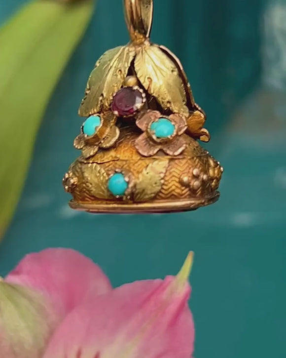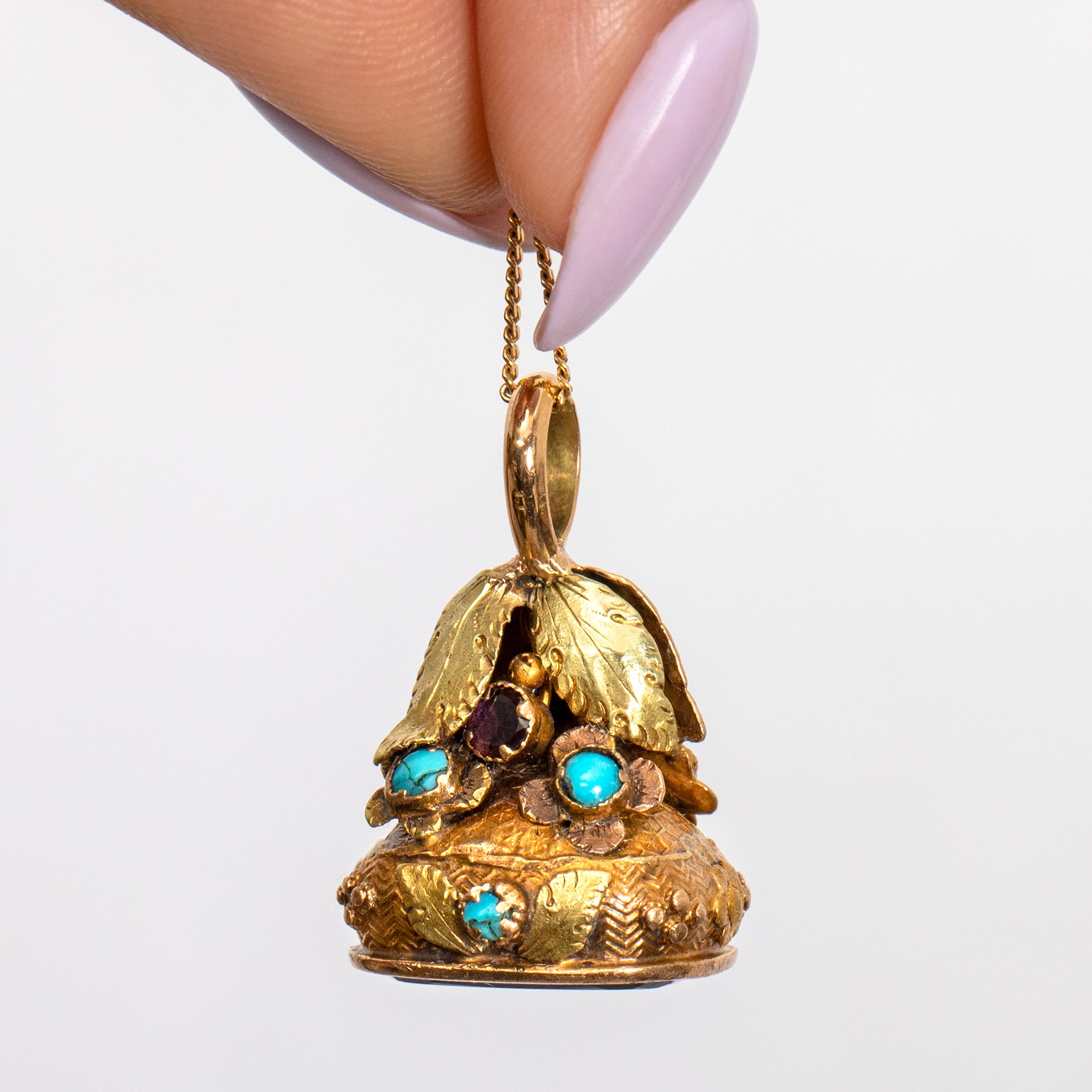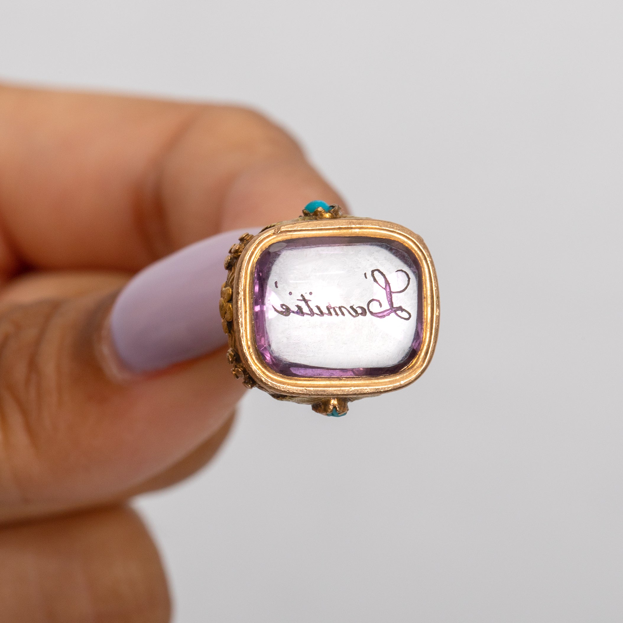 ジョージアン 18ct ゴールド アメジスト フォブ ガーネット、アメジスト、ターコイズ入り、『L'amitié』- 友情、8.20ct アメジスト。