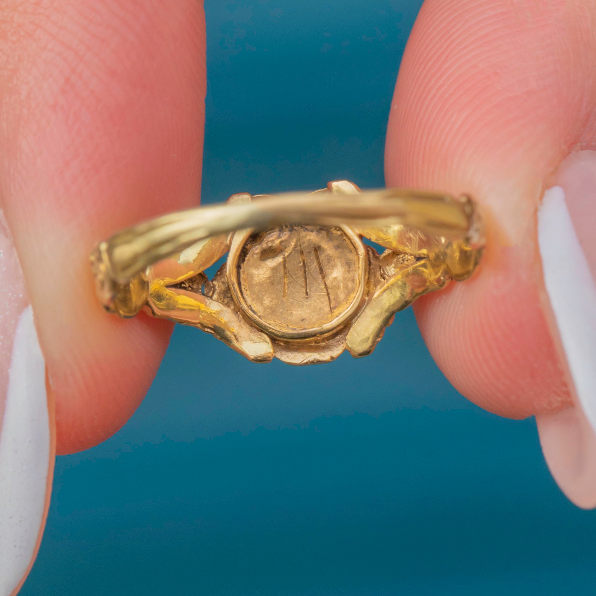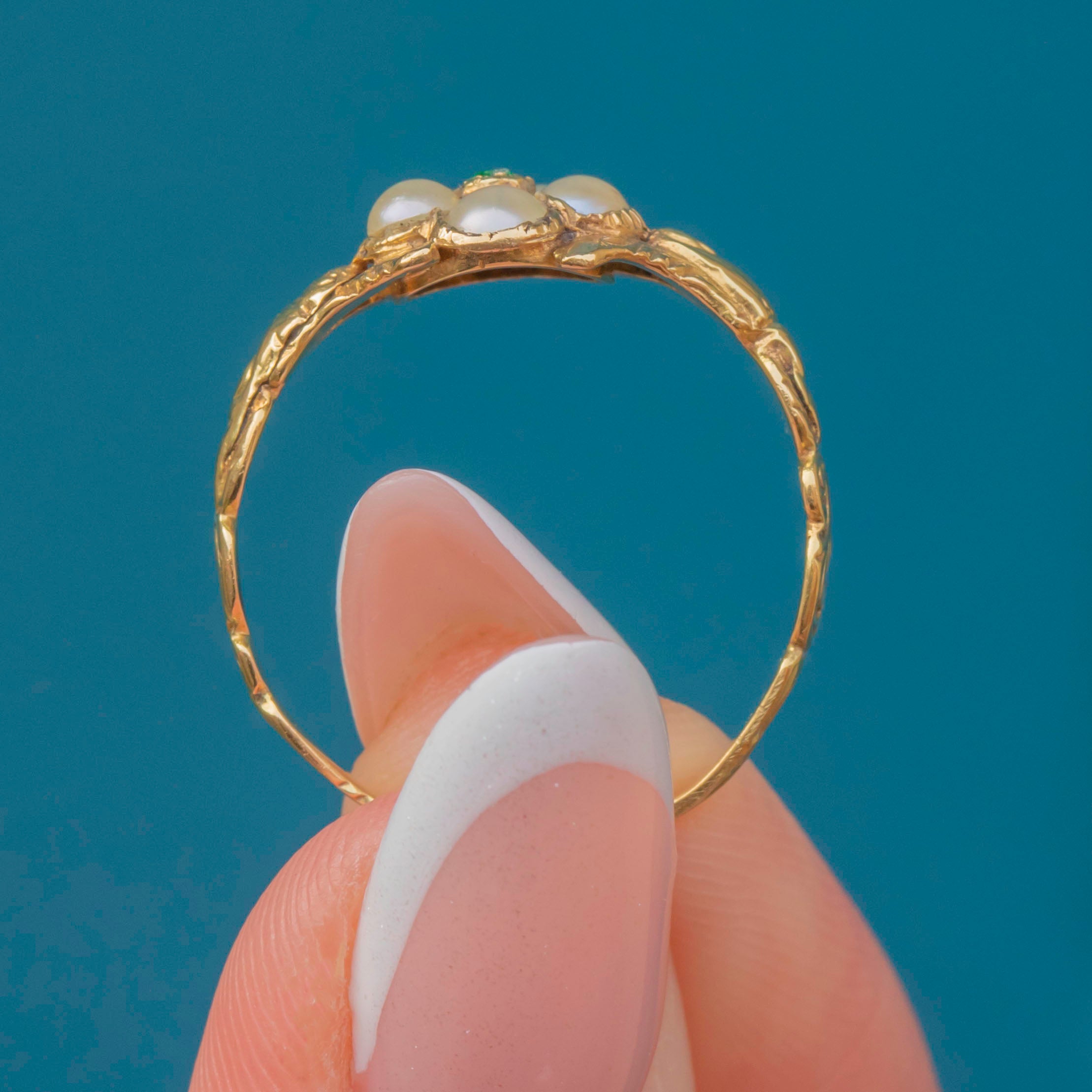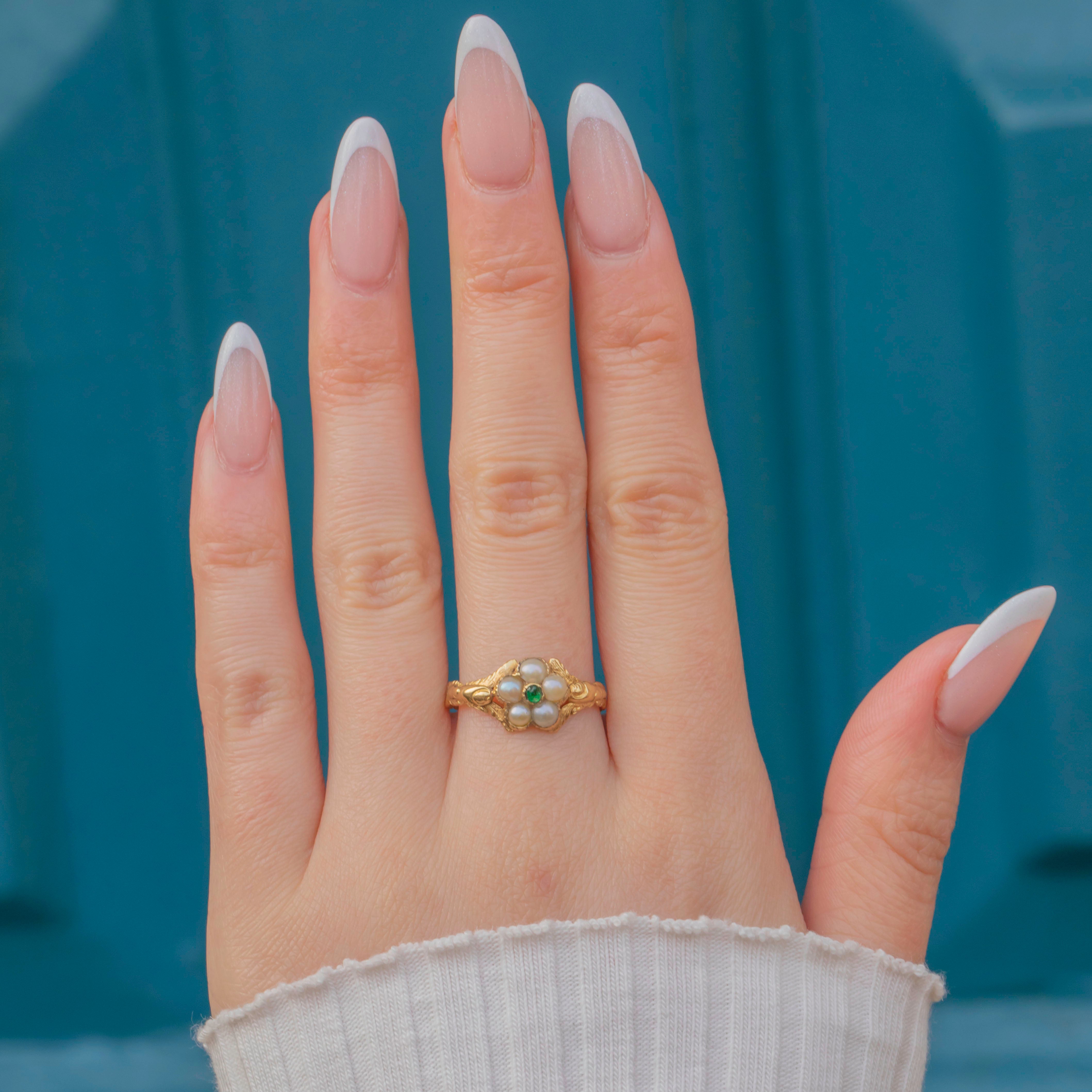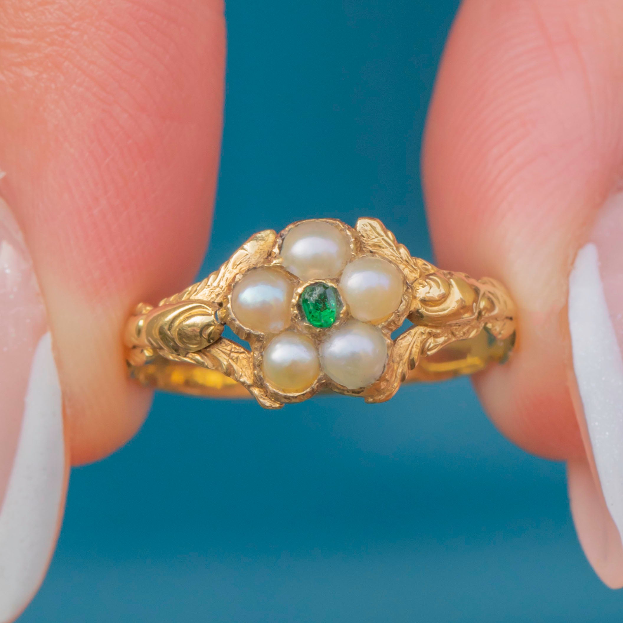 GOOD: This Georgian 18ct Gold Emerald Pearl daisy ring is presented in good condition. You can forgive that she has a little wear and tear to her, considering she is over 200 years old! Her Pearls have all retained their original lustre, are well colour-matched, and have little to no wear to their surface. Her Emerald, although gloriously green and well secured, has a minor chip on her surface. This is only noticeable under close inspection with the use of a jeweller's loupe. Her Gold is wonderfully saturated and rich, accentuated by her engravings, which have marginally worn with time but still add a pop of eccentricity to this piece. There is some visible wear to the Gold on the back of the ring, this is not visible during wear however, meaning you can wear this ring straight from your pink Lillicoco box and impress the world!
