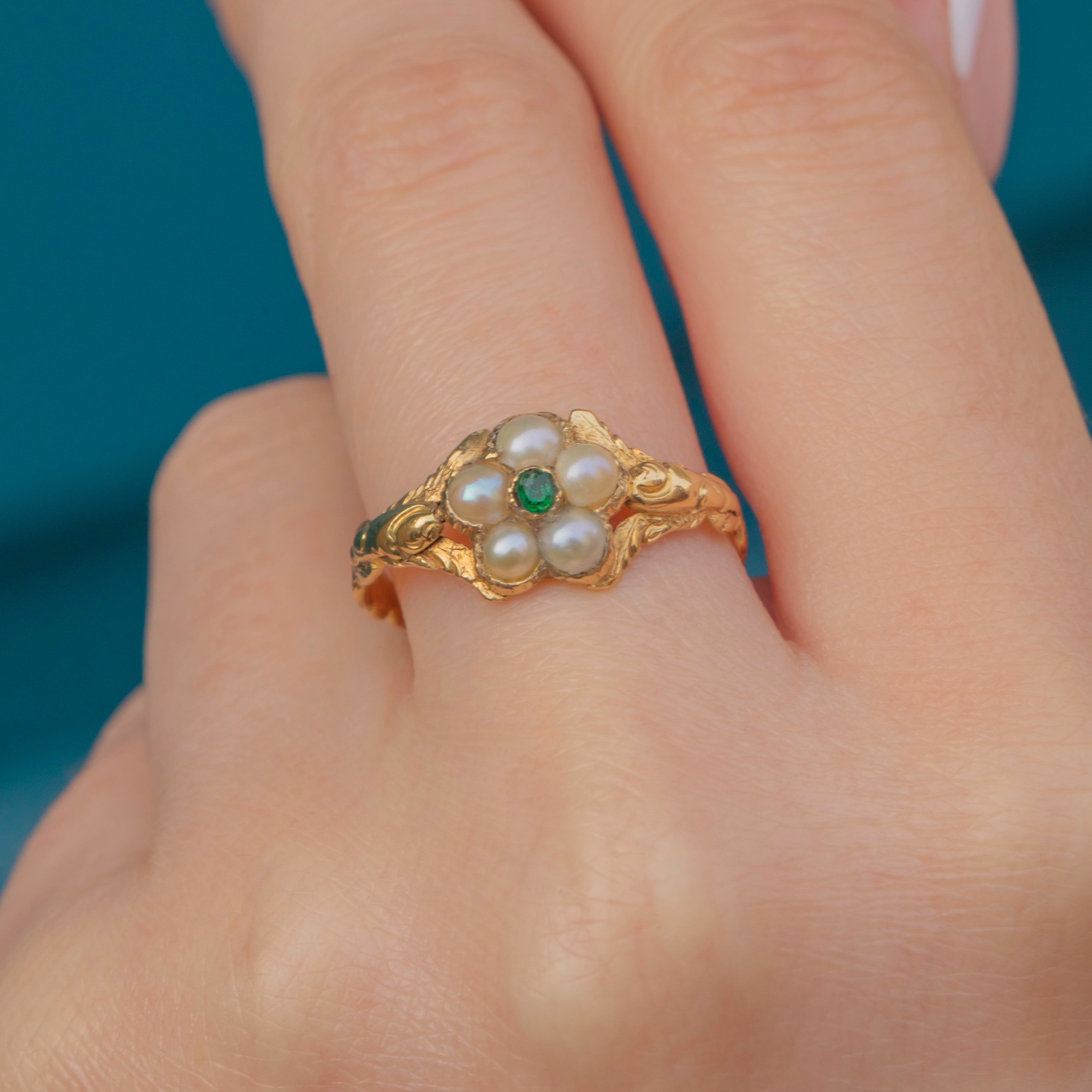 Georgian 18ct Gold Emerald Pearl Daisy Ring, Engraved Shoulders