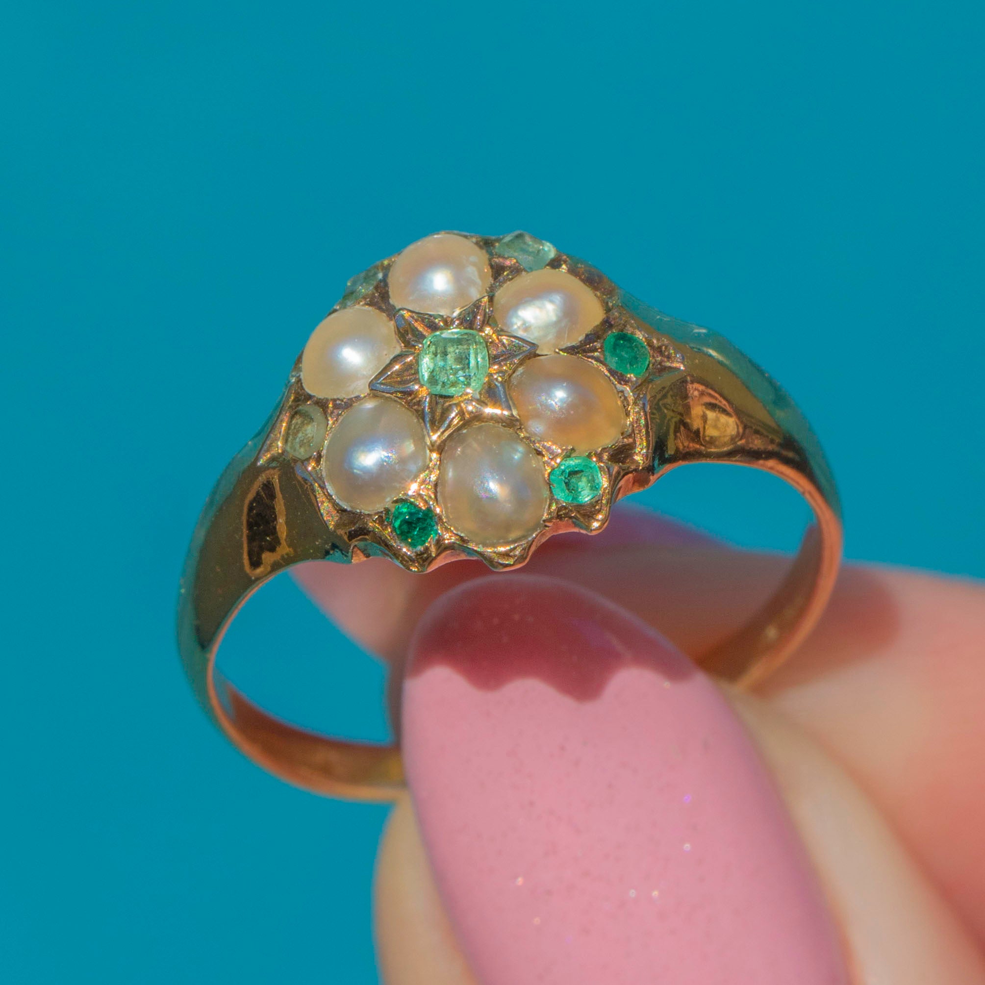 A Georgian 18ct Gold Emerald and Pearl star set cluster ring bursting with character!