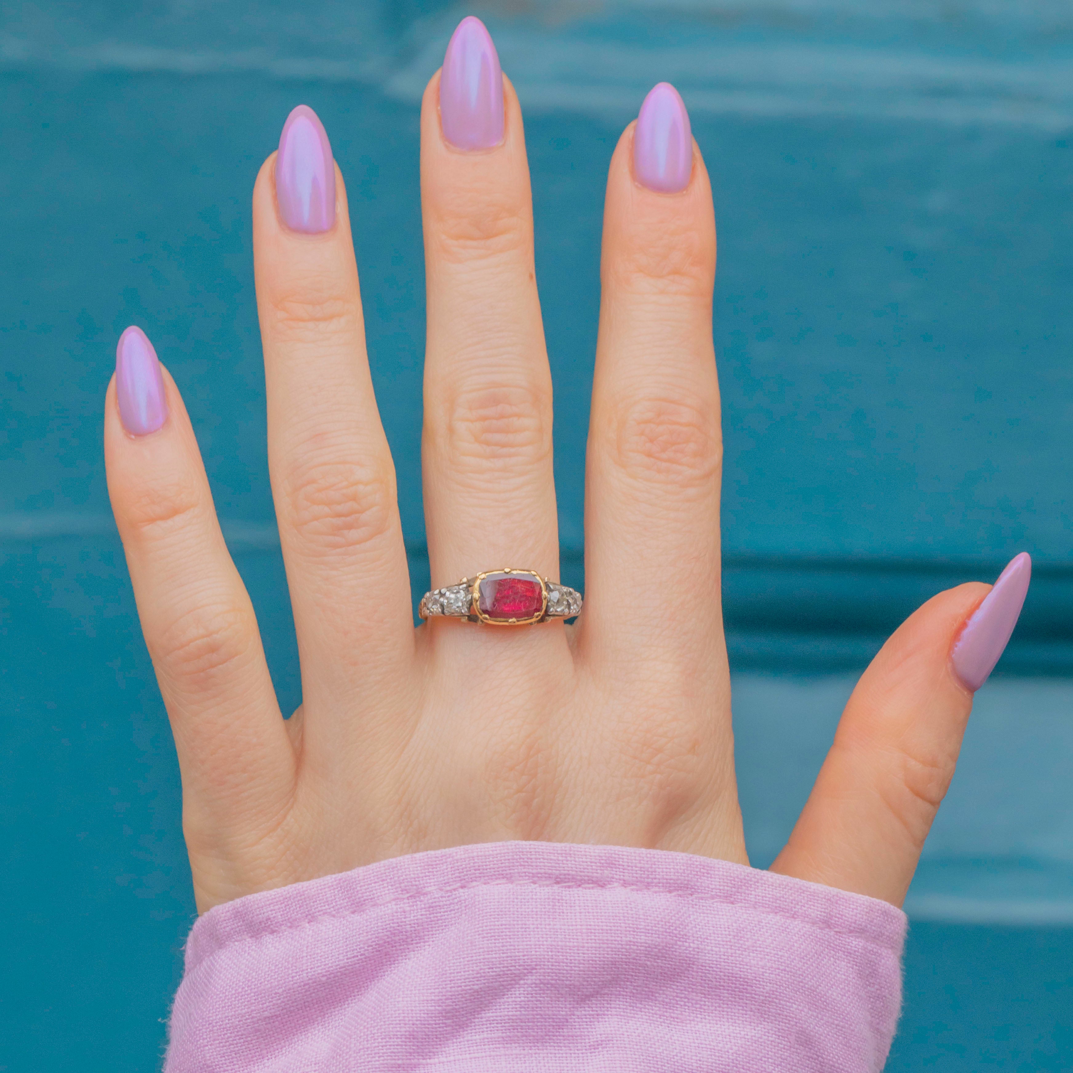At her heart lies a captivating Garnet with a rich, berry-red glow, embraced by a shimmering array of table-cut and old-mine-cut Diamonds. Exuding timeless charm, a rare and exquisite piece, this historic gem is simply irresistible!