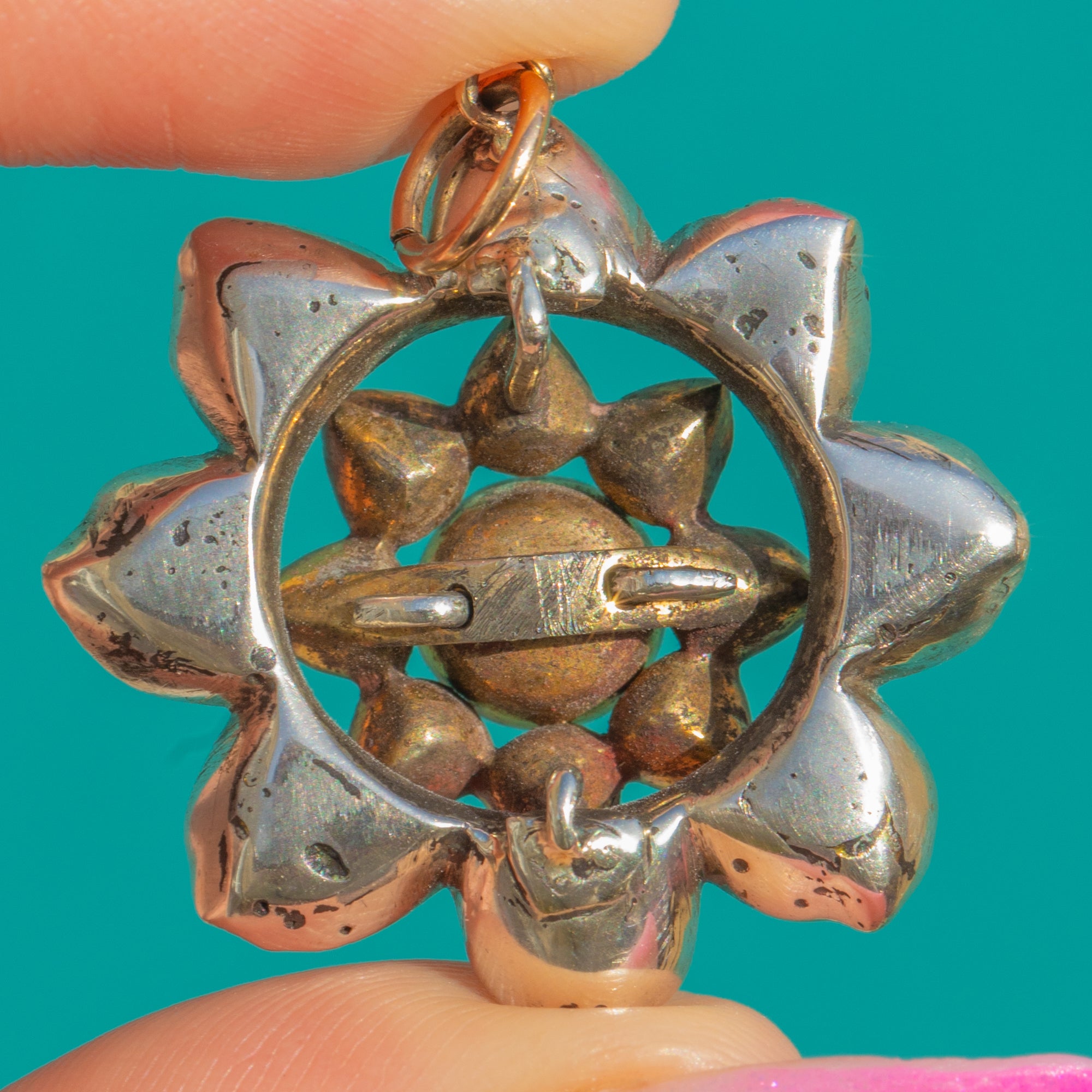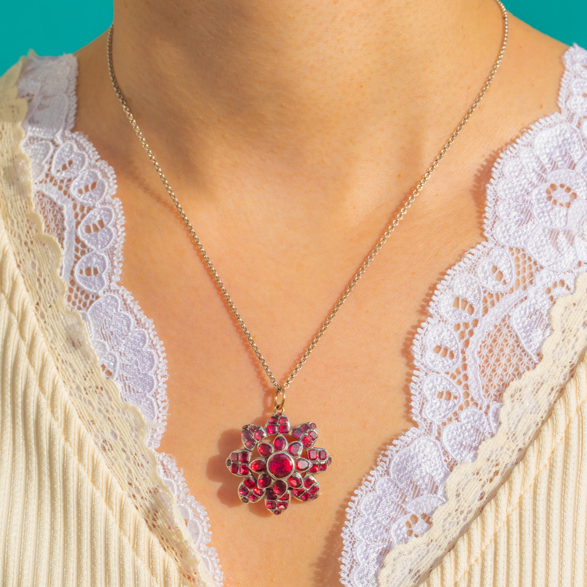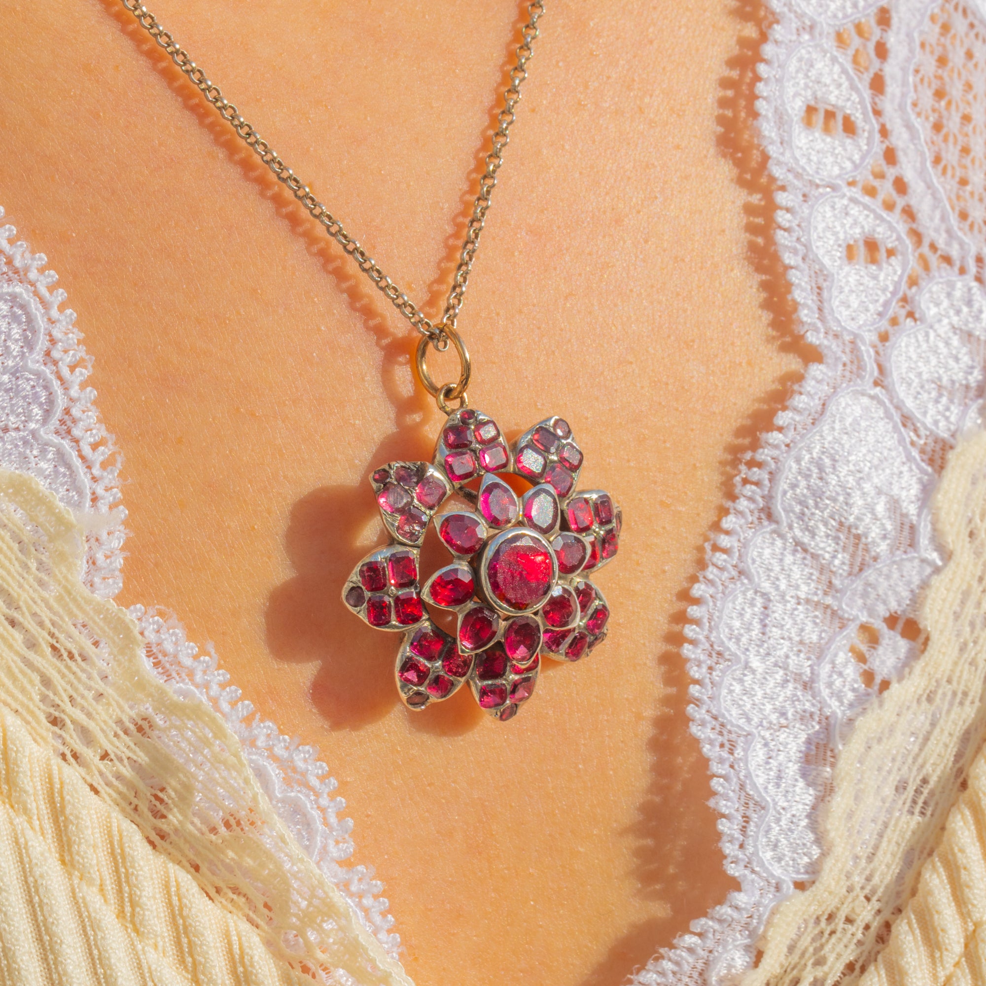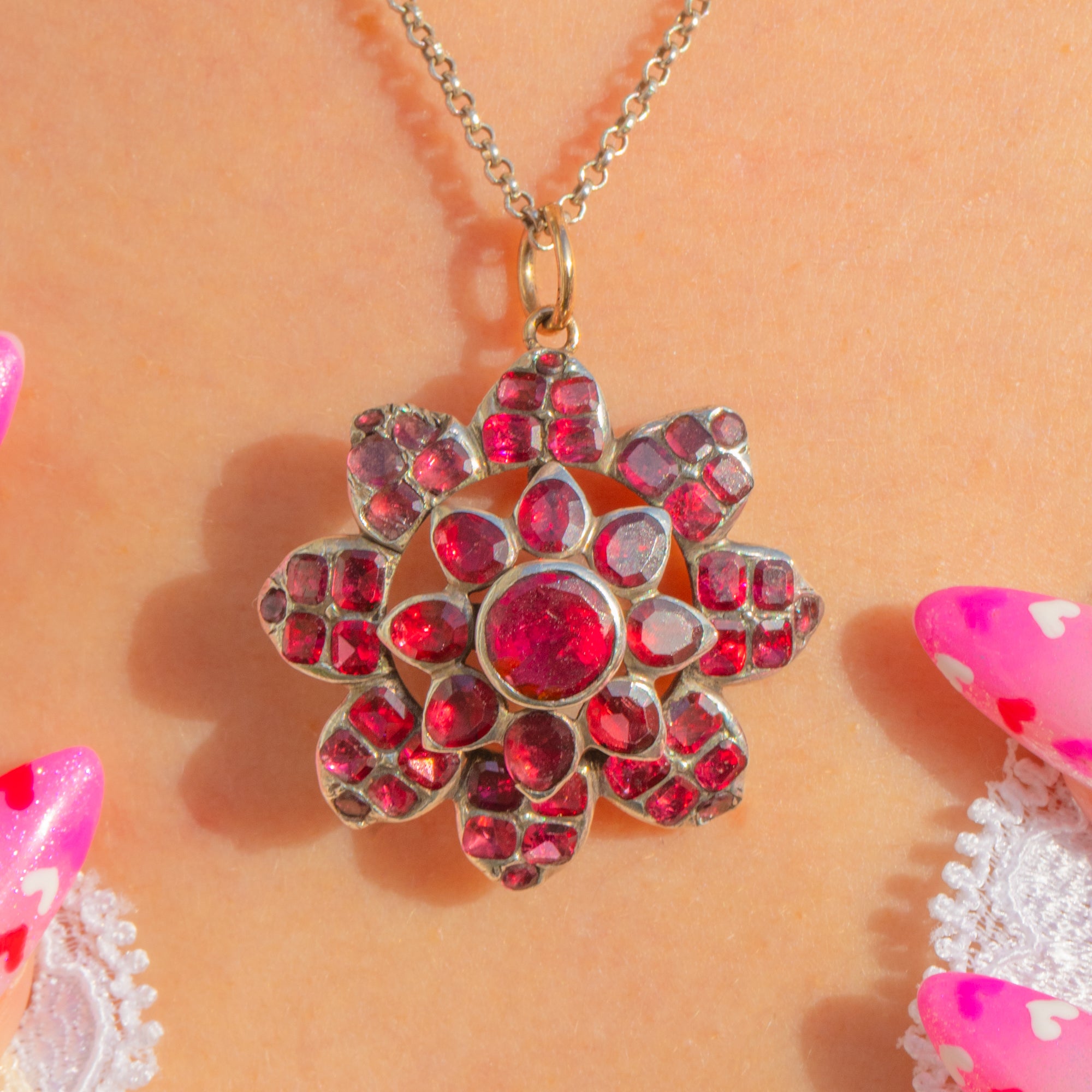 豊かなワインレッドの輝きを放つフラットカット・ガーネットが咲き誇る、贅沢なGeorgian期の花モチーフペンダントです。石は放射状に配され、中央に向かって高く盛り上がるようにグラデーションを描き、それぞれが手作業で仕上げられたクローズドバックのコレットセッティングに丁寧に収められています。重なり合う透かし細工が、花房に奥行きと軽やかさを与え、銀の台座に添えられた十八金の丸カンが、洗練された趣を添えています。