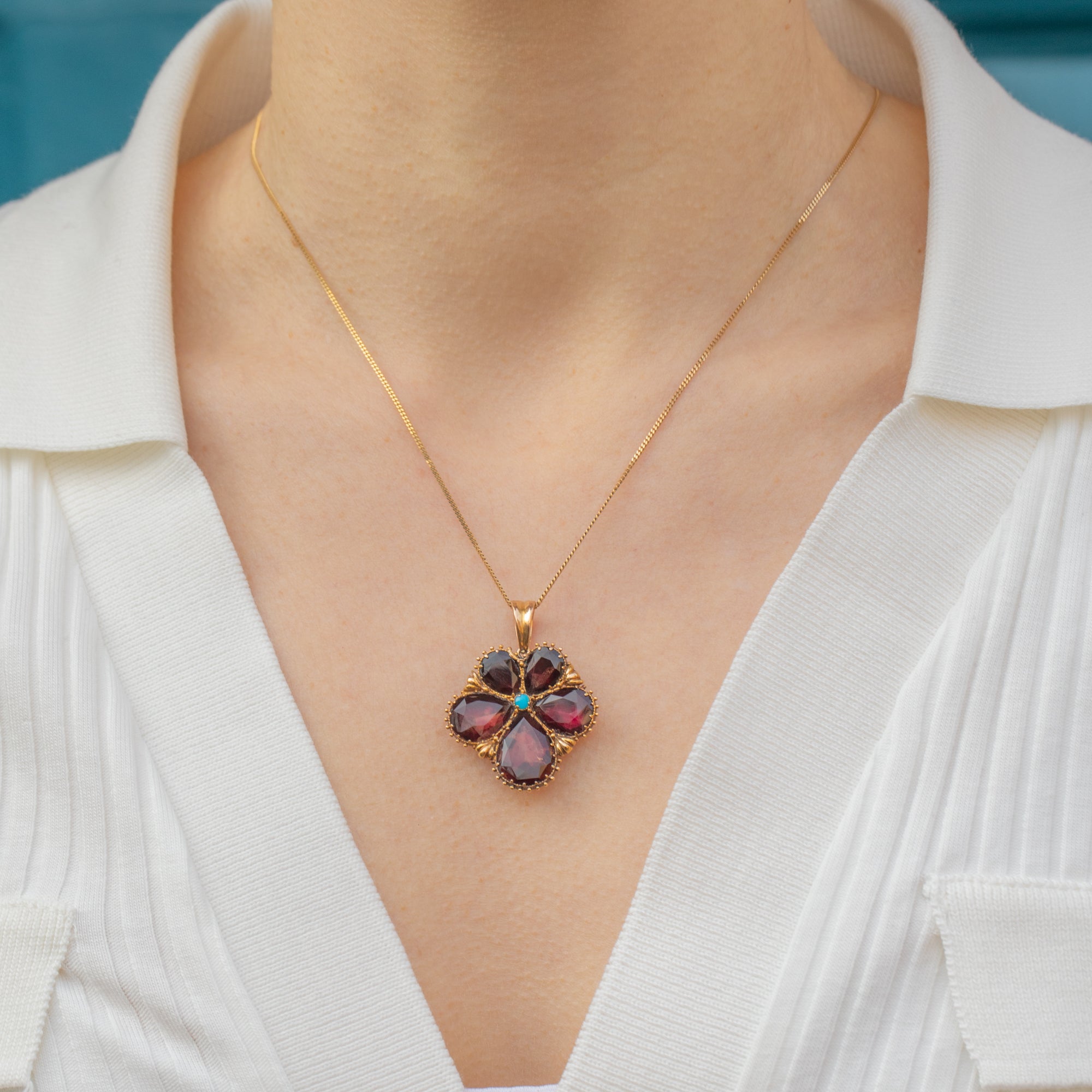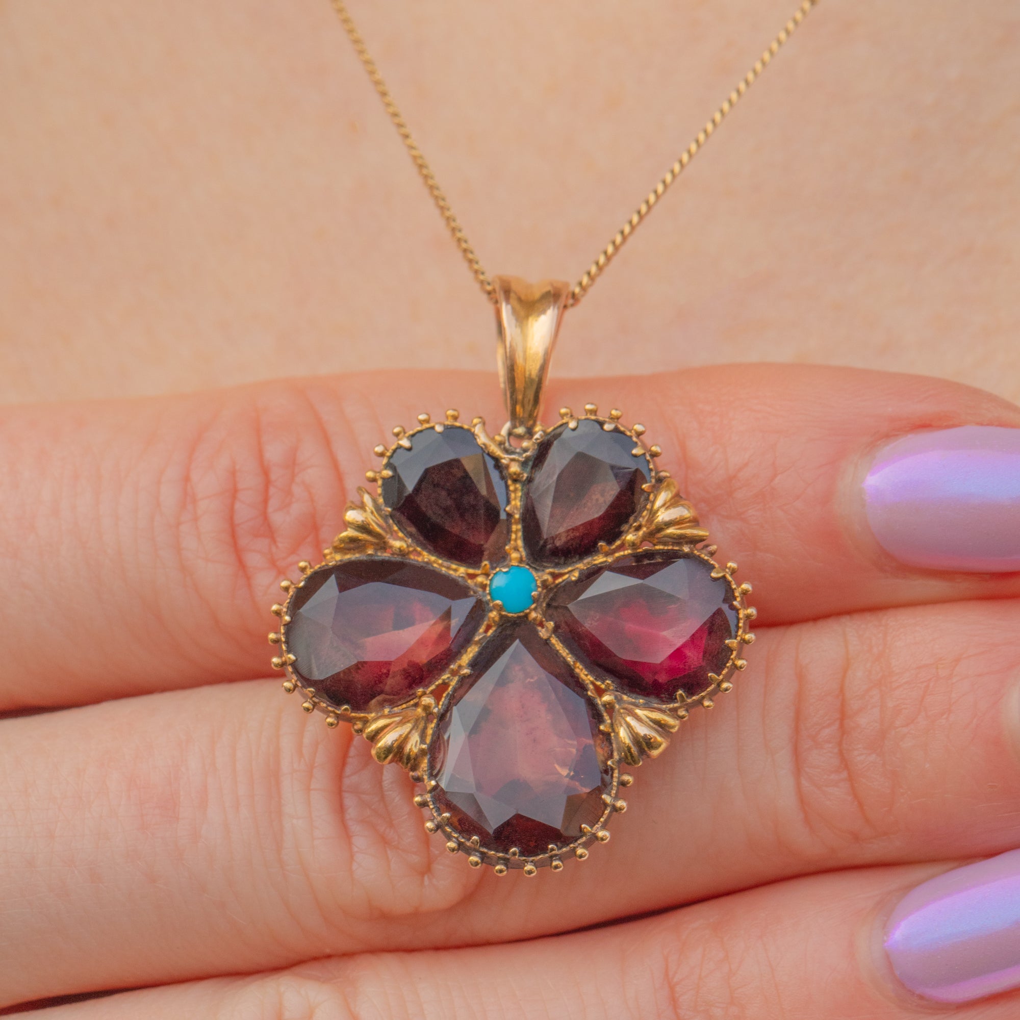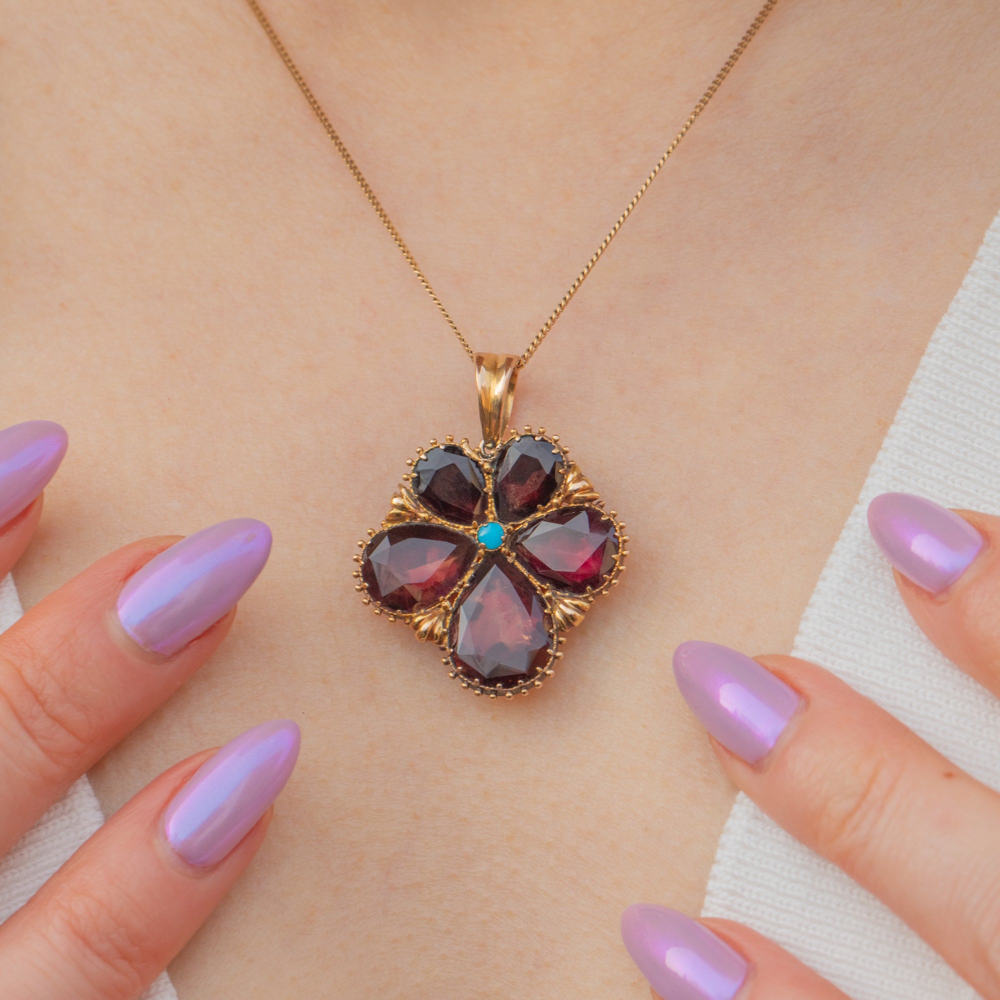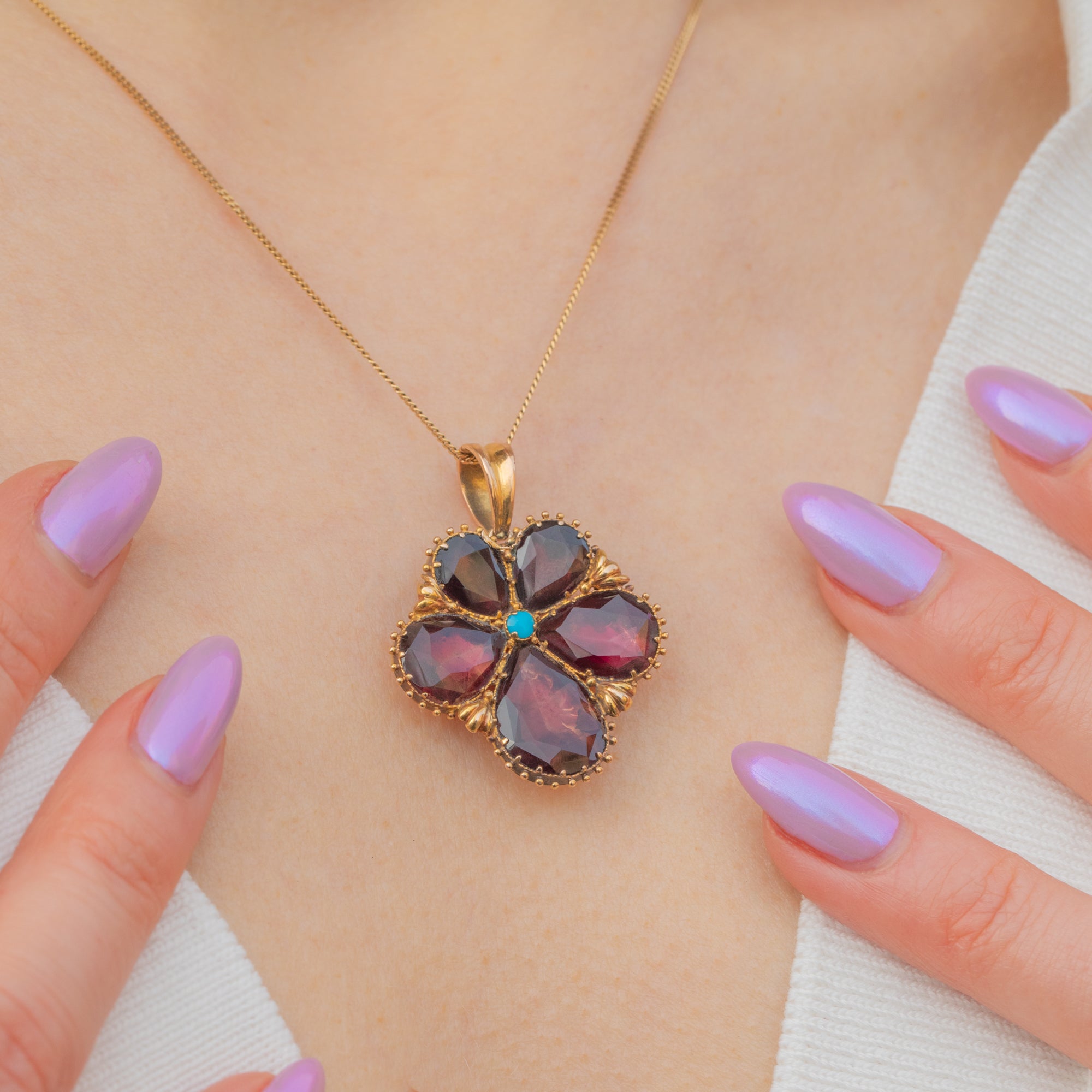 What a gorgeous Georgian 18ct Gold Garnet pansy pendant! This sweet flower looks as though it's been freshly plucked from a field, saturated with a rich merlot hue and accentuated by the pop of fresh blue from her Turquoise centre, this Georgian pendant is simply divine.
