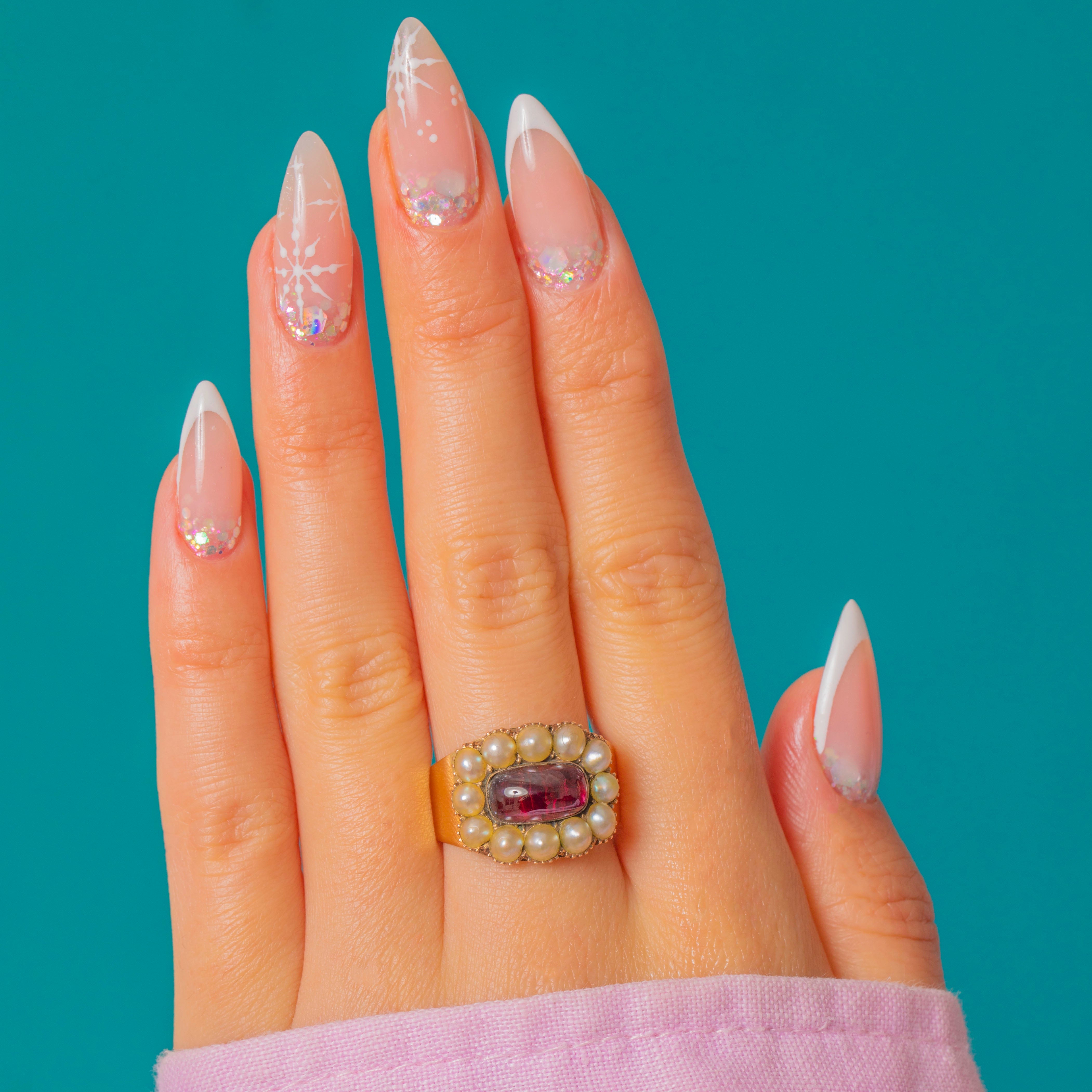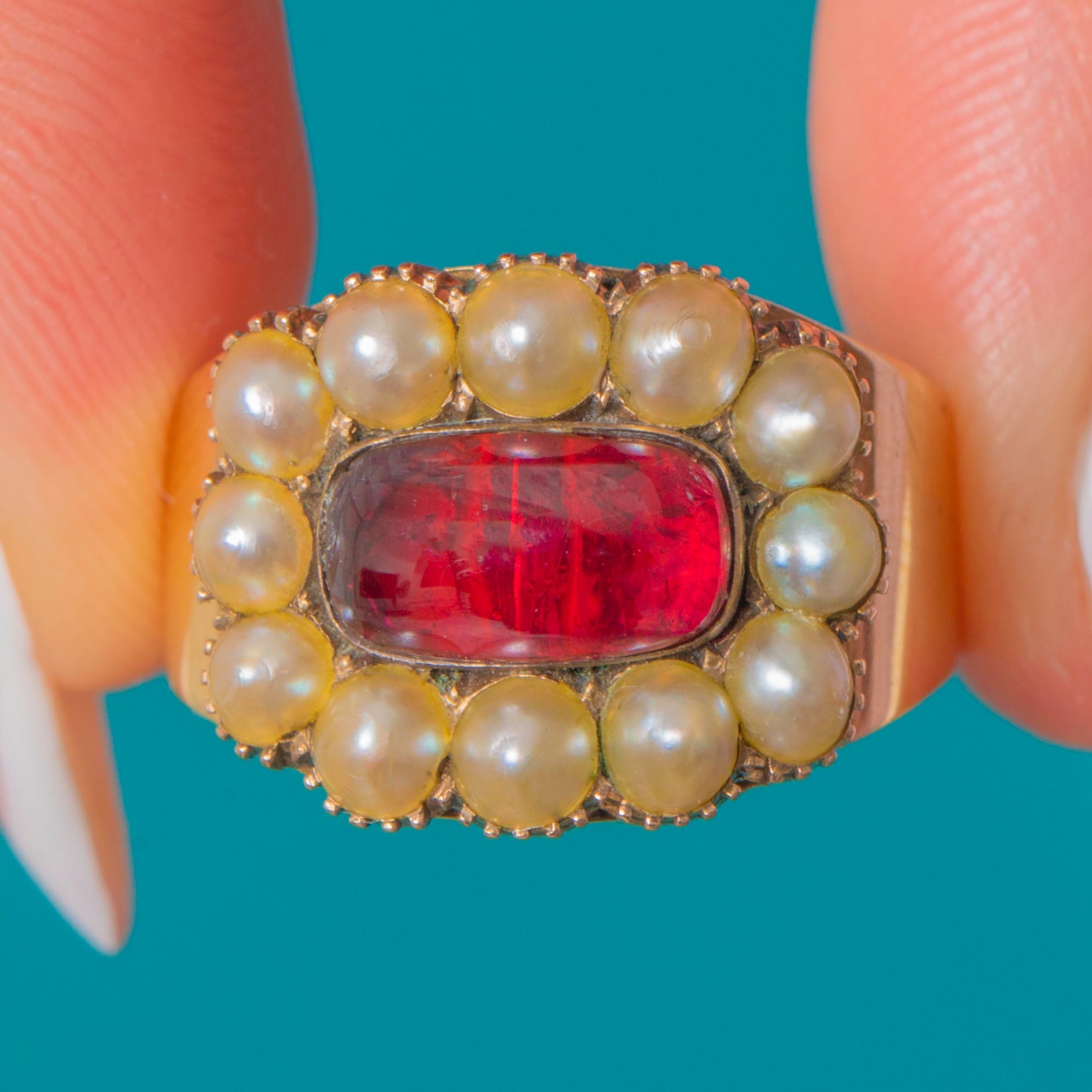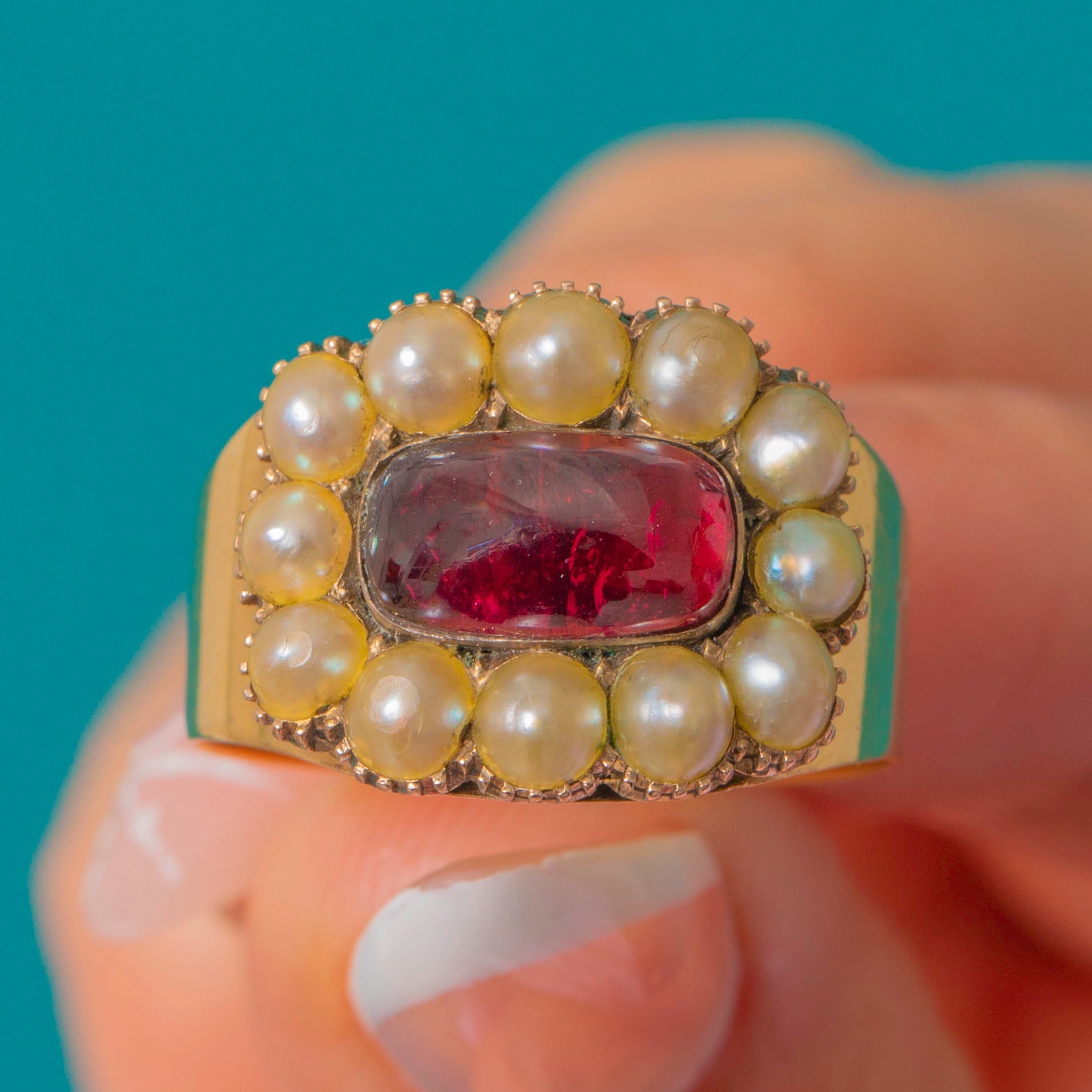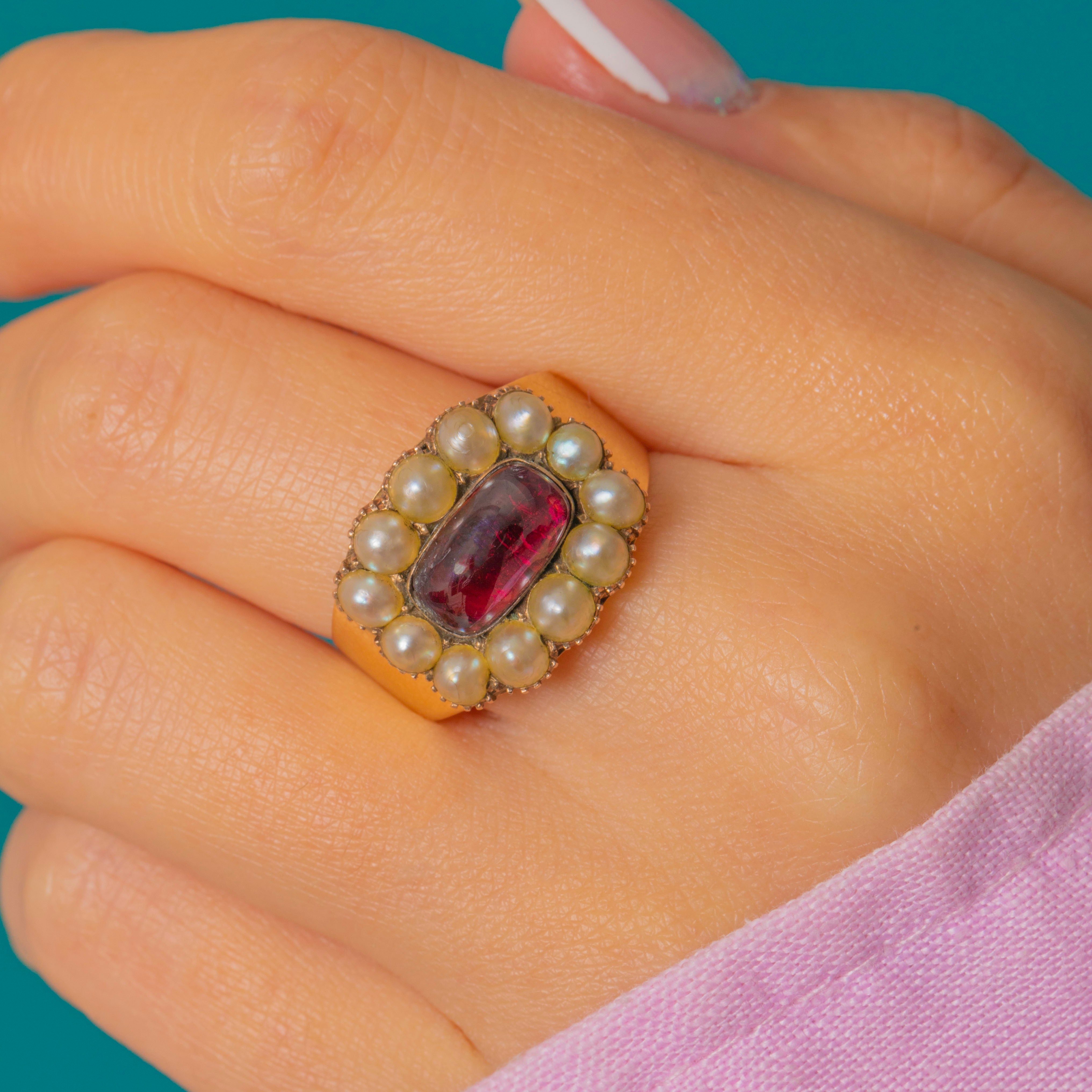 18金 ジョージアン ガーネット カボション パール クラスター リング 1.60カラット、約1814年