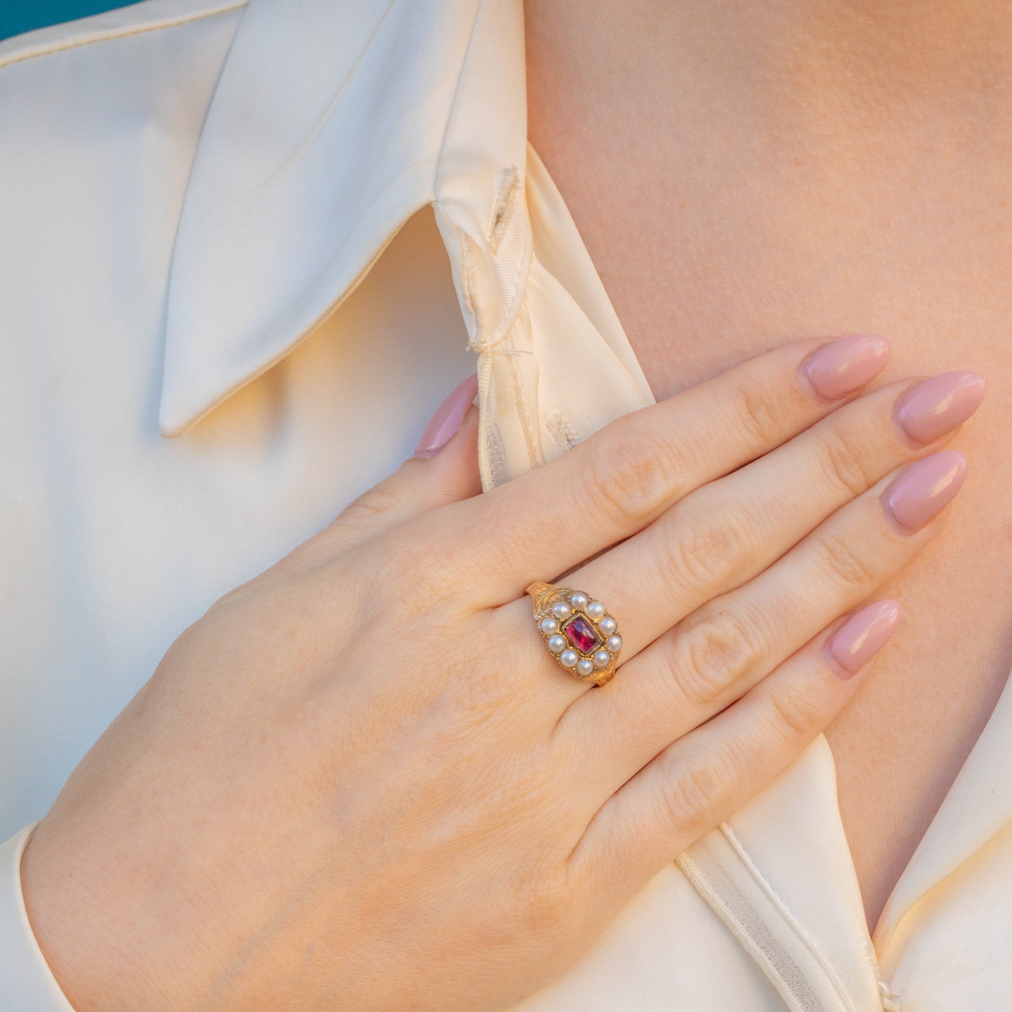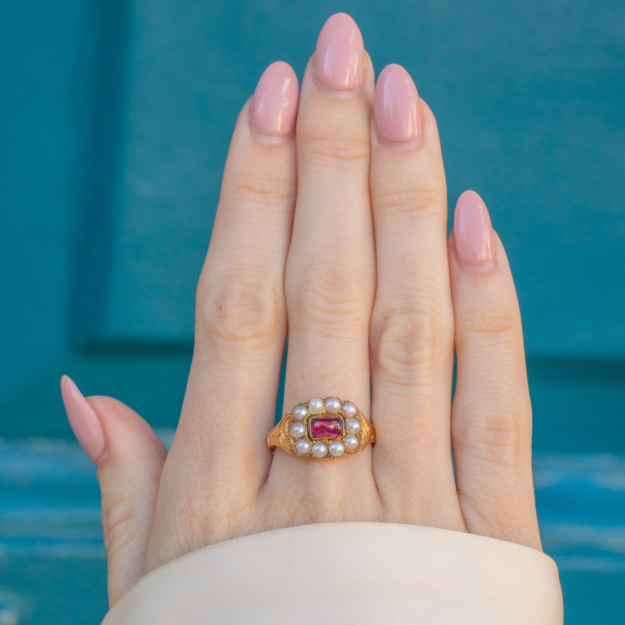 This glowing early 19th-century Georgian 18ct Gold Garnet Pearl cluster ring is a wonderful example of the traditional cluster style! With a halo of bright natural Pearls surrounding the bright and chunky sugarloaf Garnet, this ring shines supreme with old-world antique Georgian charm!