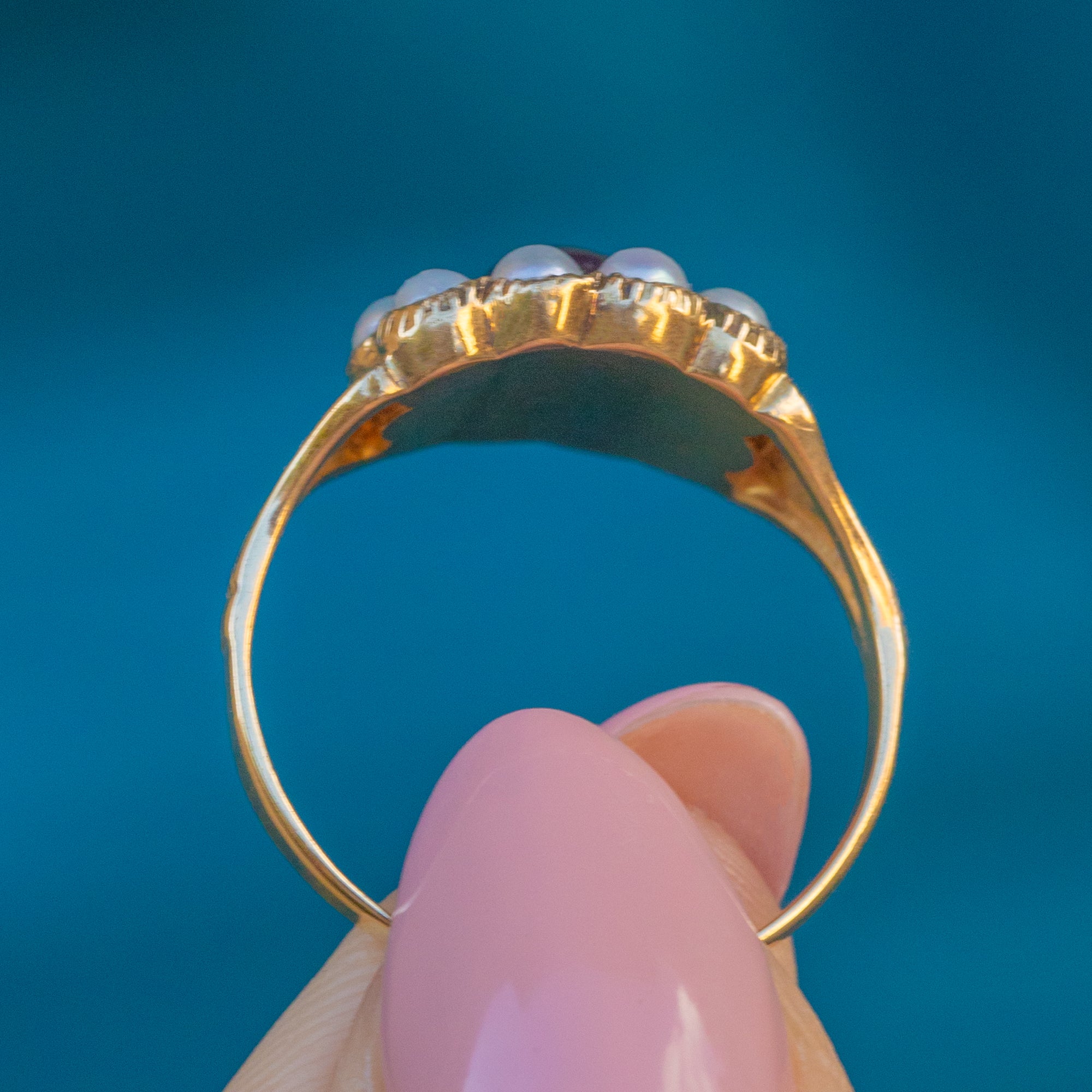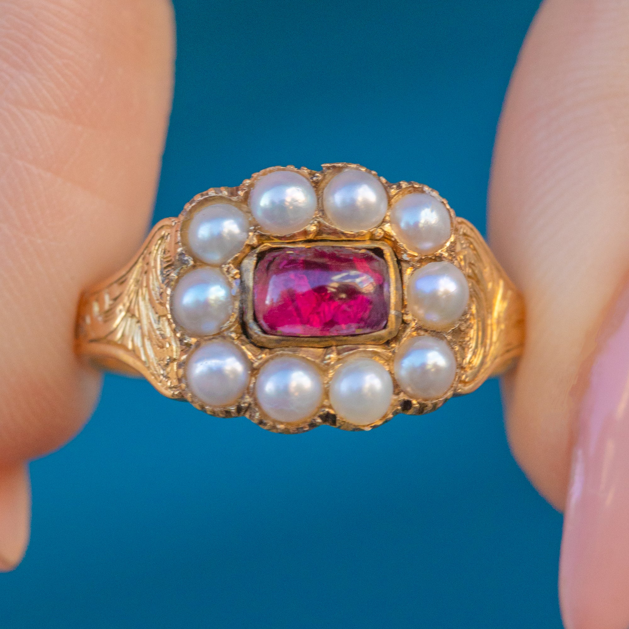 EXCELLENT. This Georgian 18ct Gold Garnet Pearl cluster ring is in excellent condition throughout, with the Garnet and Pearls free from any damage or signs of wear and still with beautiful lustre after over 200 years! The shank has a just-about-visible indication of an earlier resizing but the ring is safe to wear and enjoy and can be re-sized safely by our antique specialist jeweller if needed. The typical Georgian crimped settings are not only beautiful but also free from wear and hold the stones securely.