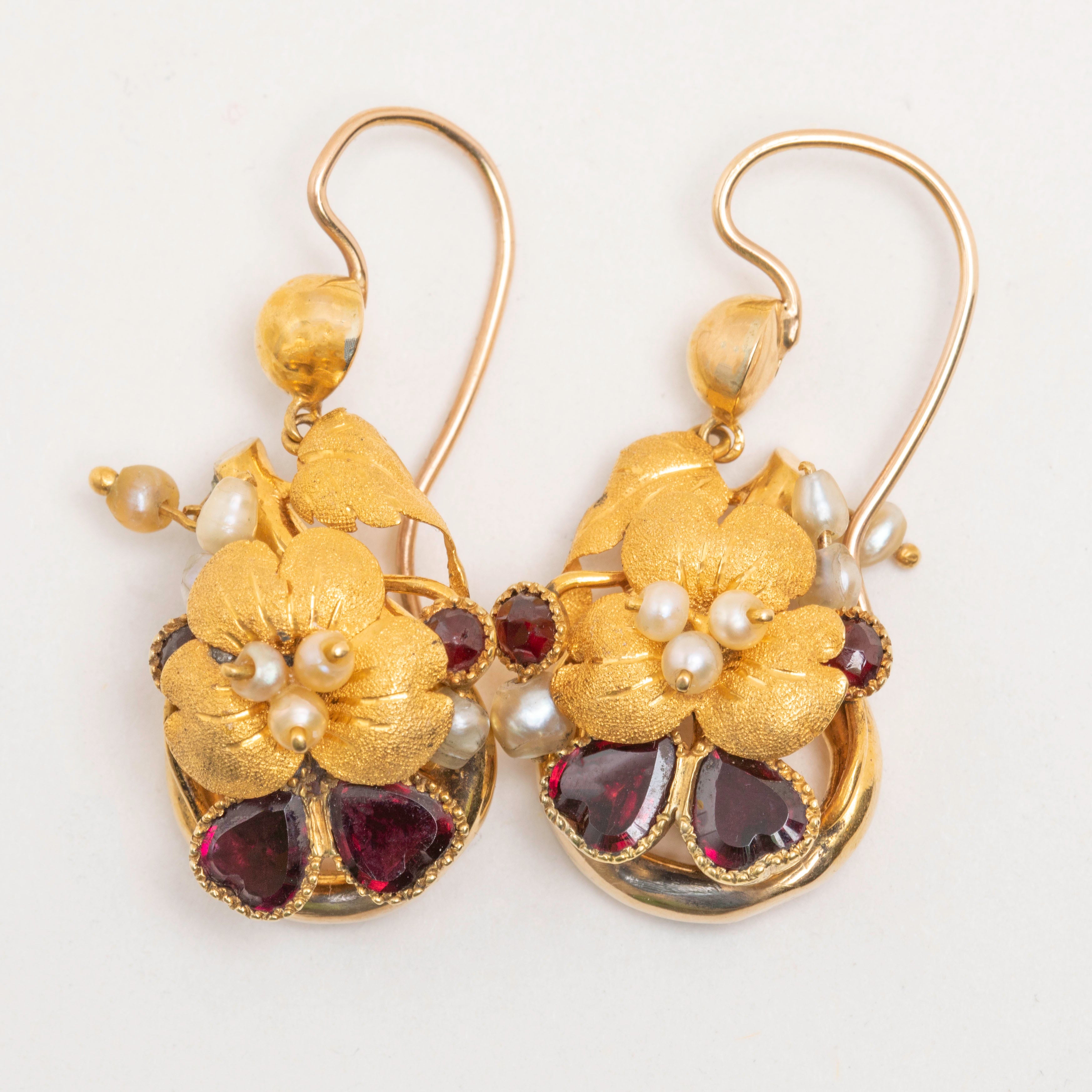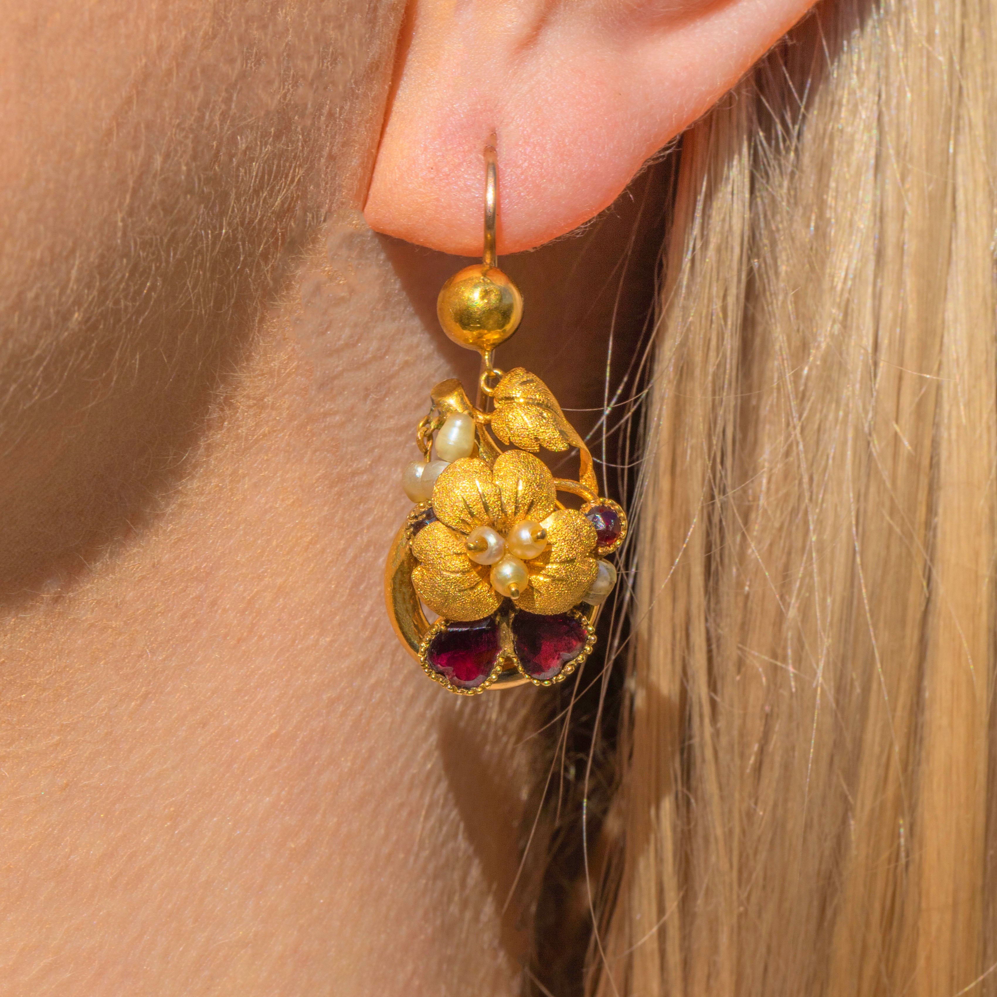 Georgian 18ct Gold Garnet Pearl Pansy Earrings