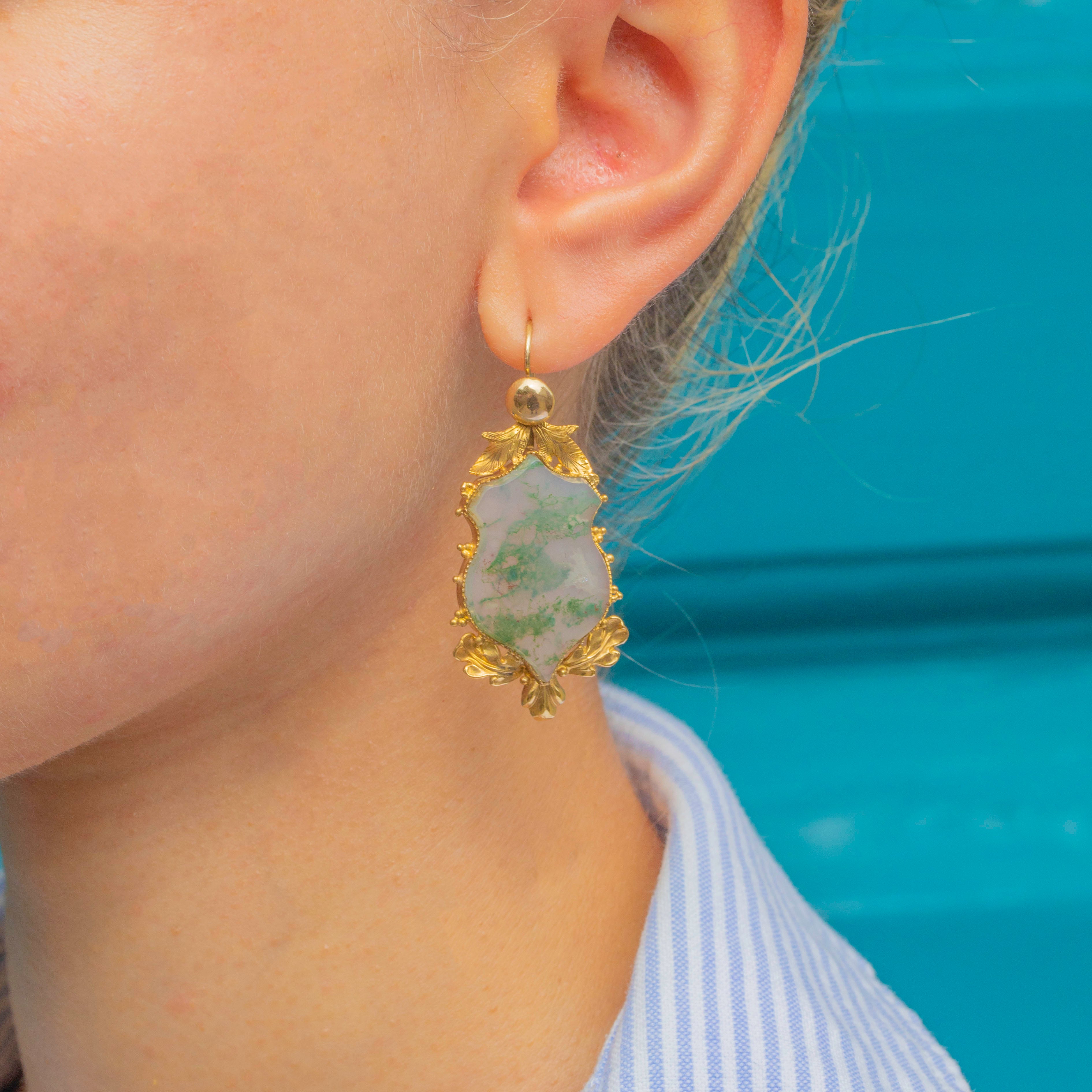 EXCELLENT: The Moss Agate stones have been wonderfully preserved with no chips or damage. The natural inclusions remain clear and vibrant, enhancing each piece’s unique character. The 18ct Gold setting is intact with finely detailed foliate motifs and no missing or bent elements. The earrings display a warm patina consistent with their age and careful preservation, making them a beautiful example of Georgian craftsmanship