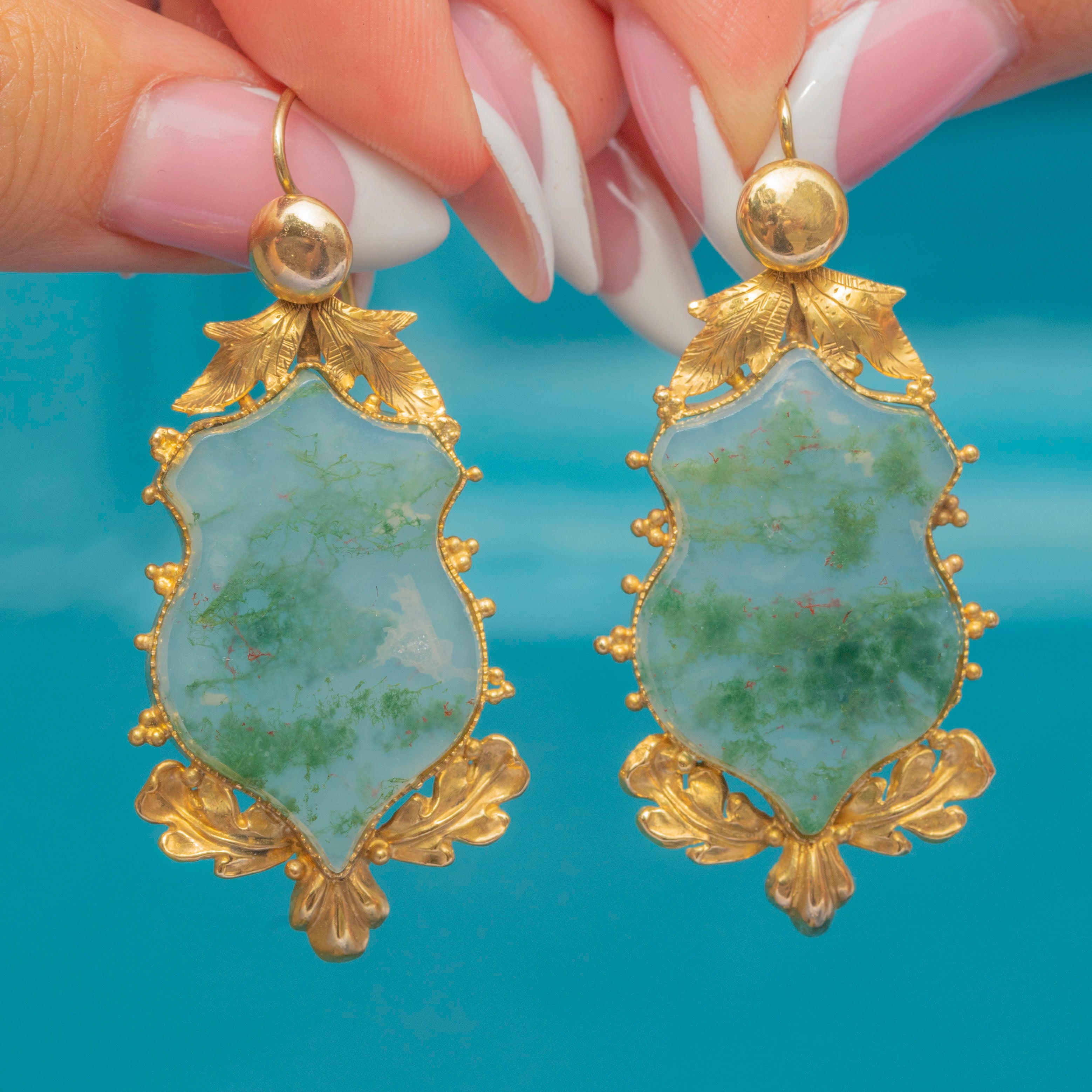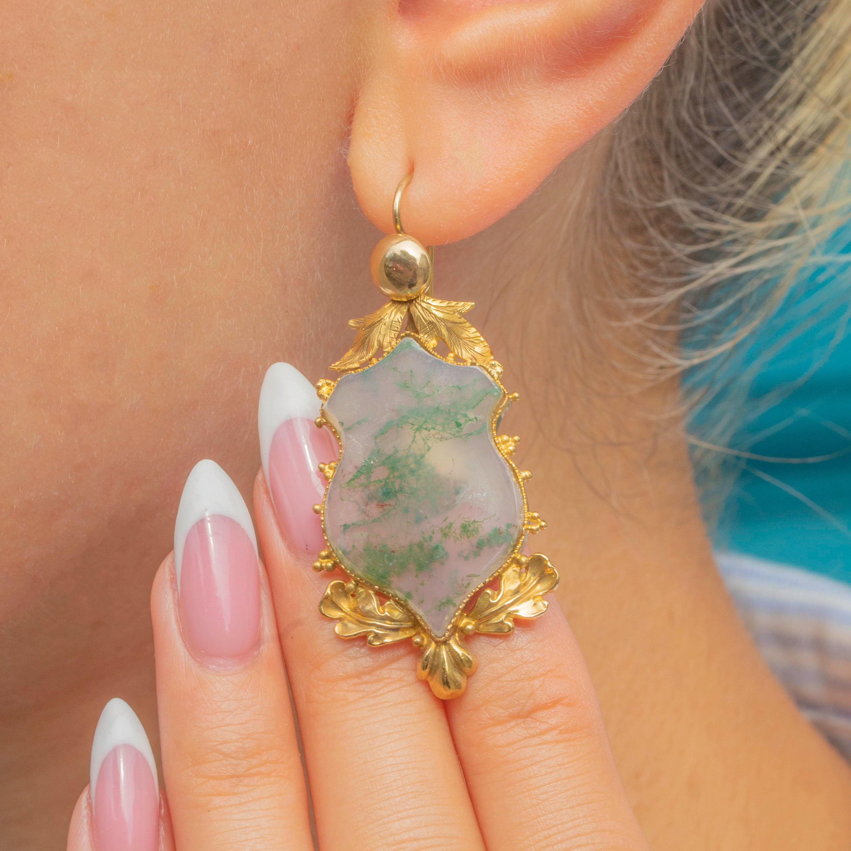The impressive size of these antique Moss Agate earrings offers an elegant yet bold statement, perfectly capturing the artistry and sophistication of the Georgian era.