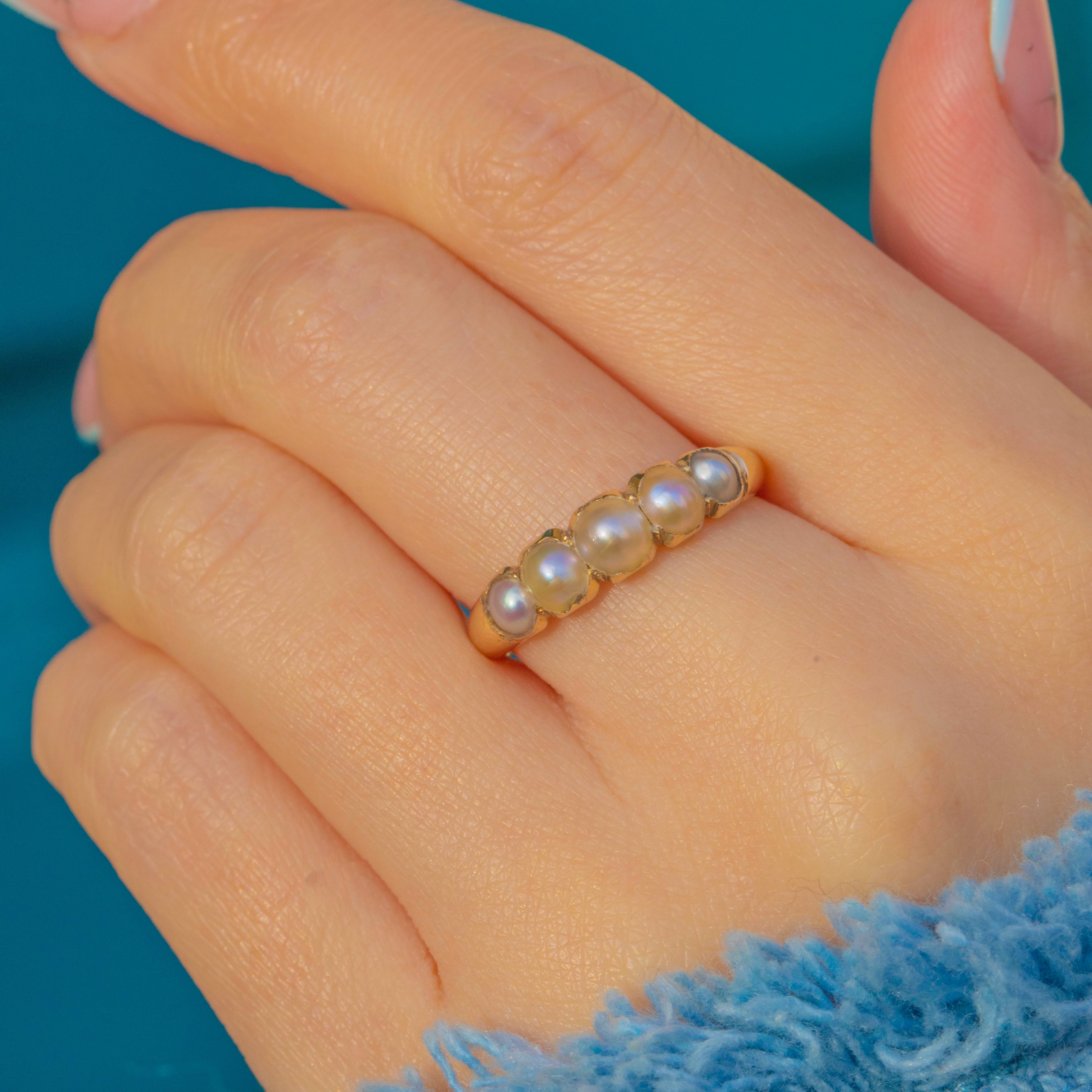 A lyrical Georgian five-stone half hoop, crafted in rich 18ct Gold and set with Natural Pearls that graduate softly across the finger. Each domed Pearl nestles in scalloped settings, creating a romantic, low-profile line of glow and gentle shimmer.