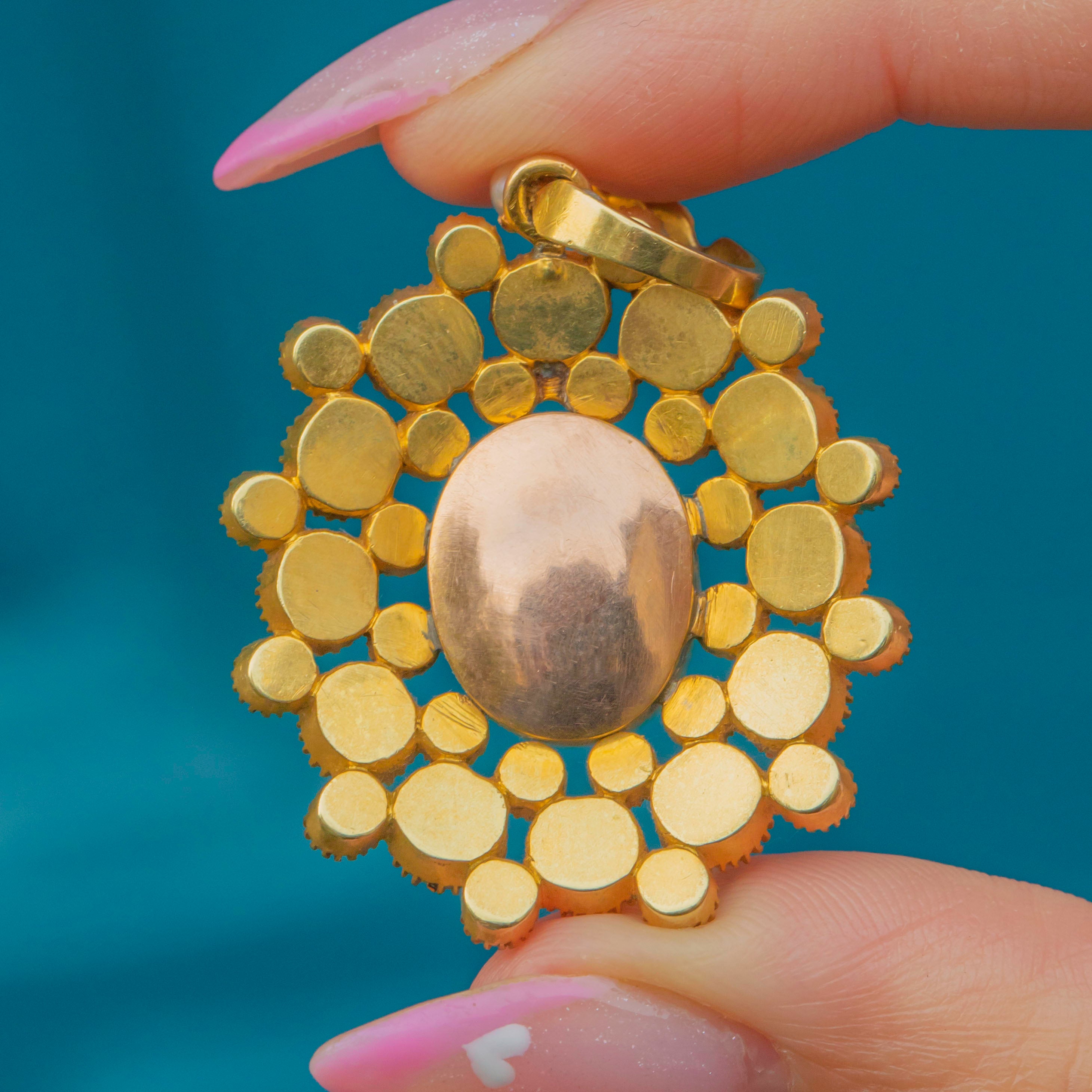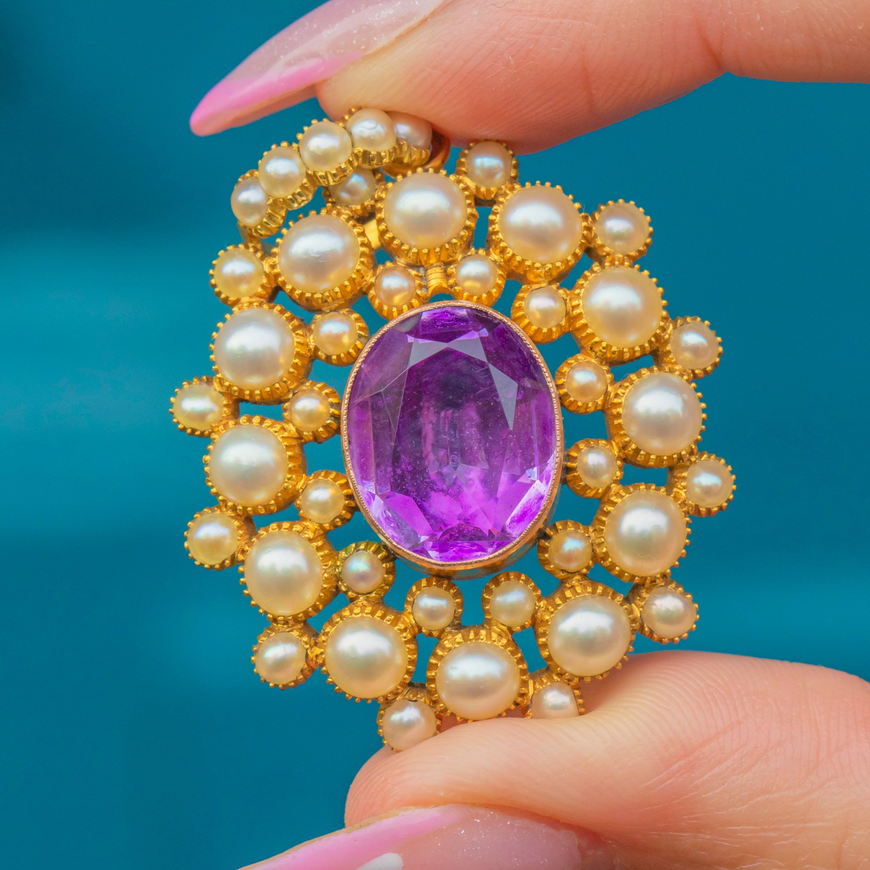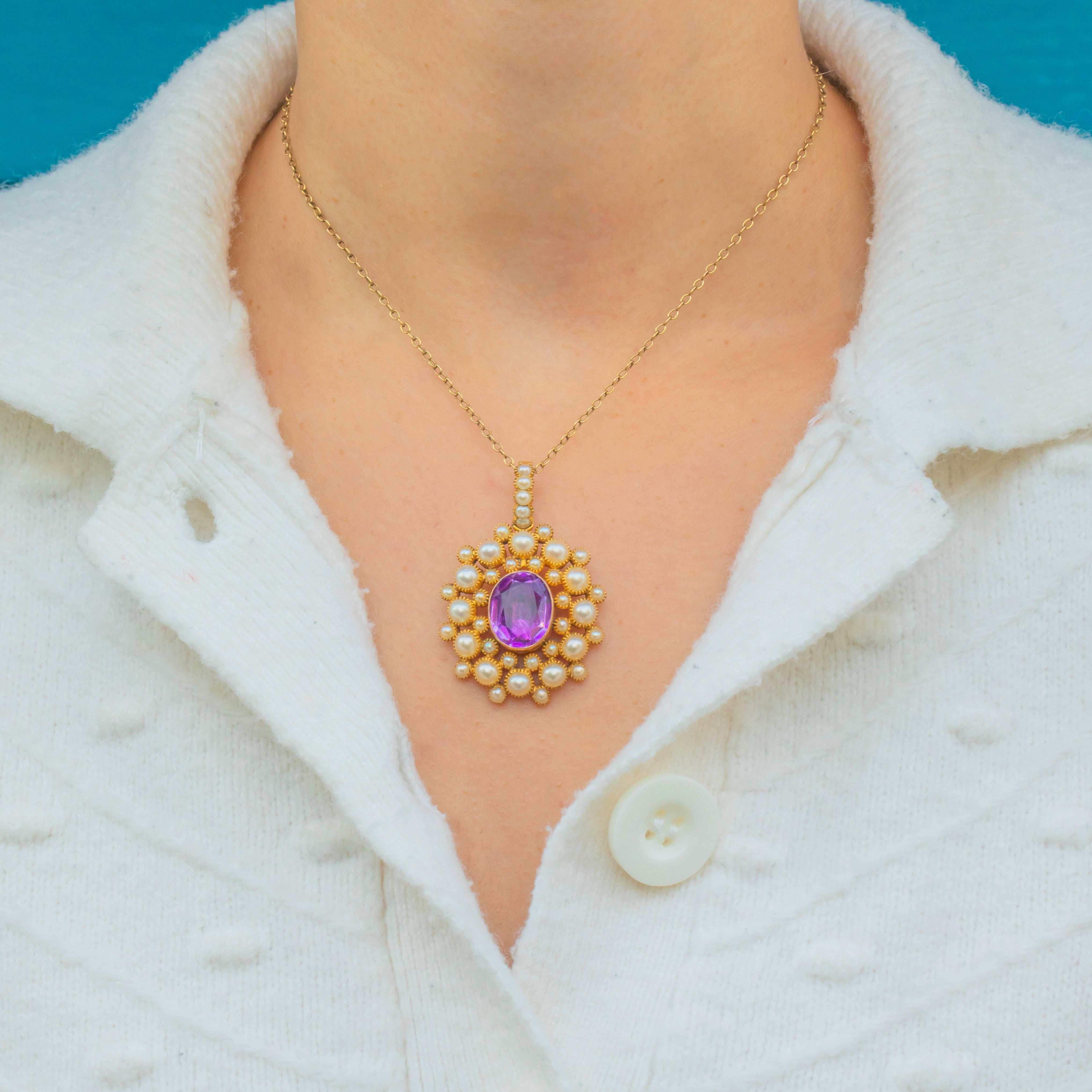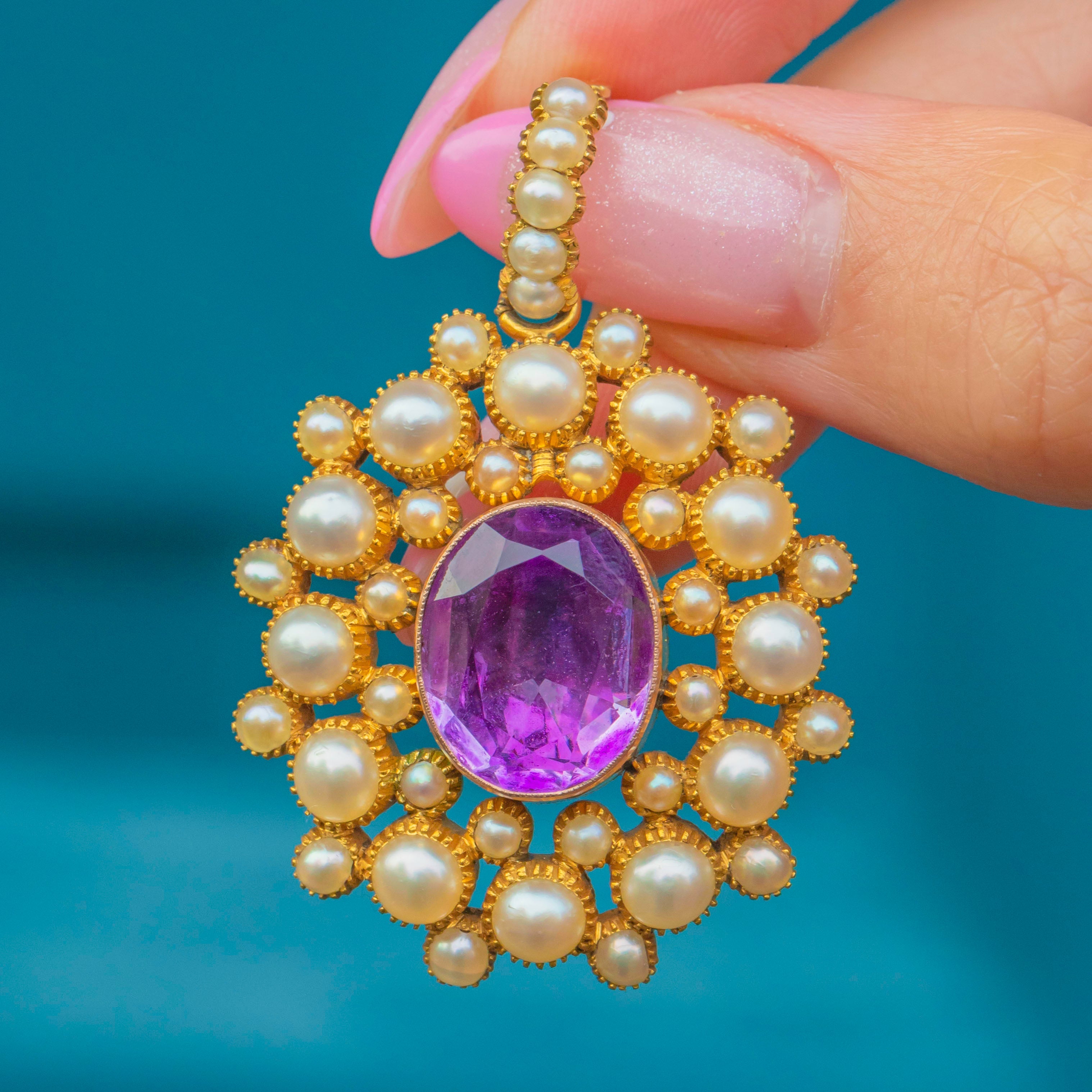 ジョージアン 18ct ゴールド ピンクアメジスト パール クラスター ペンダント、2.40ct.