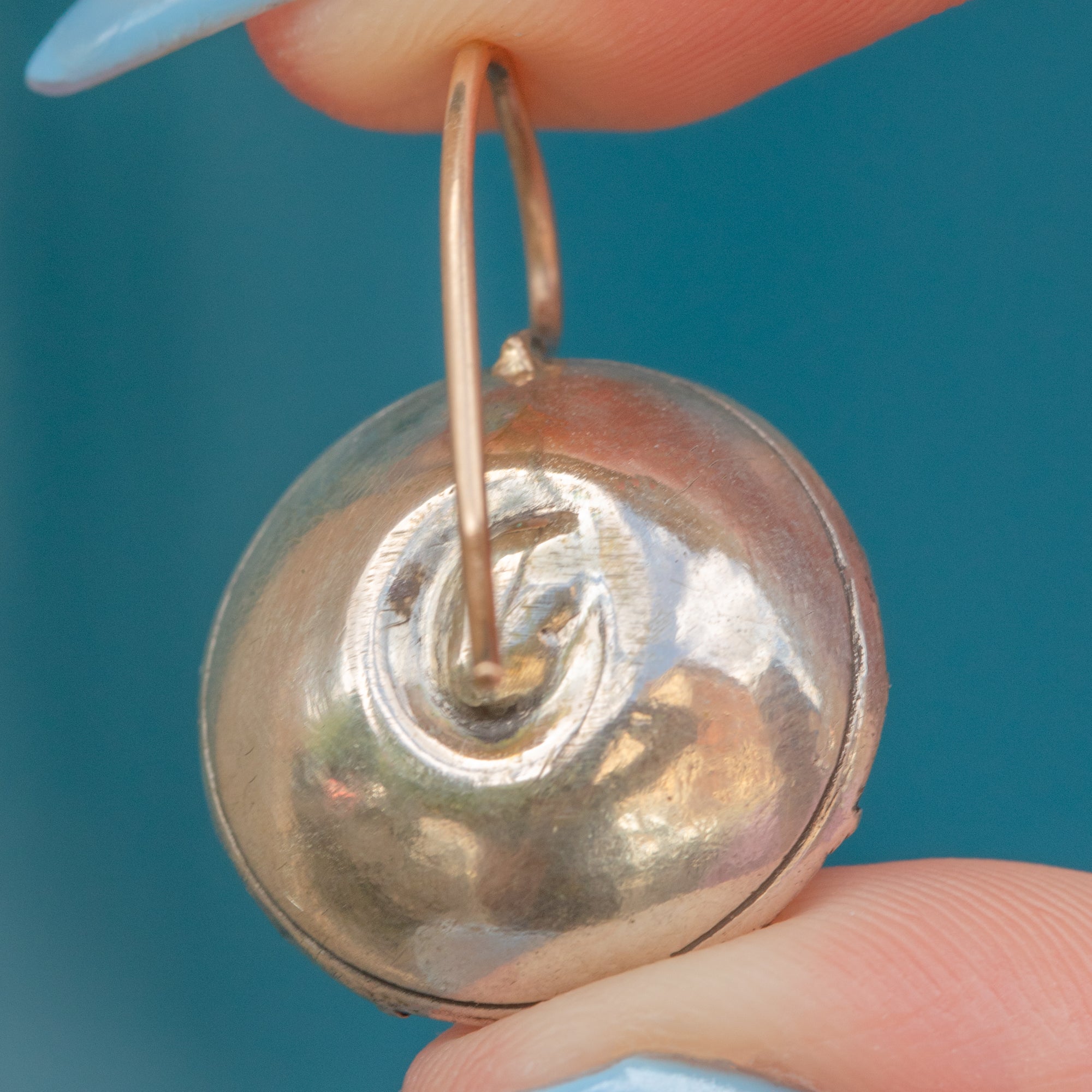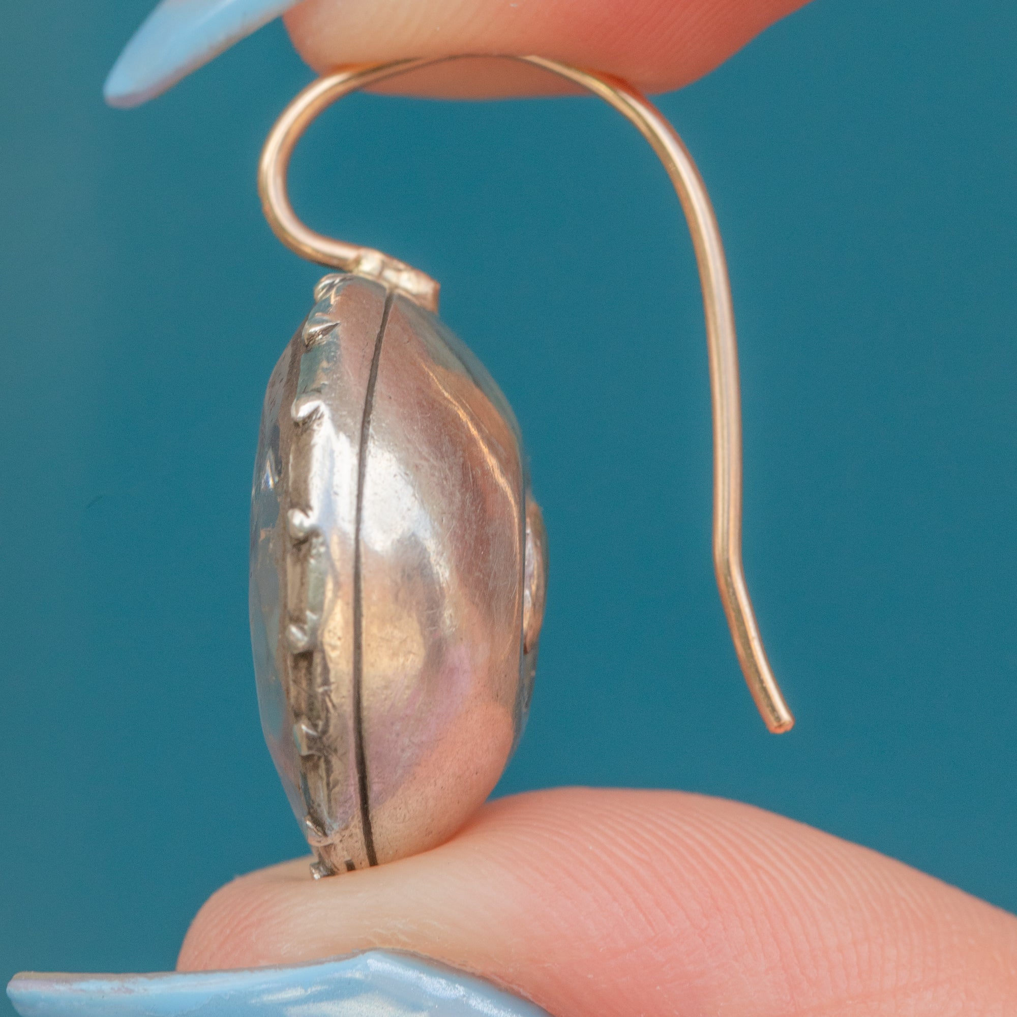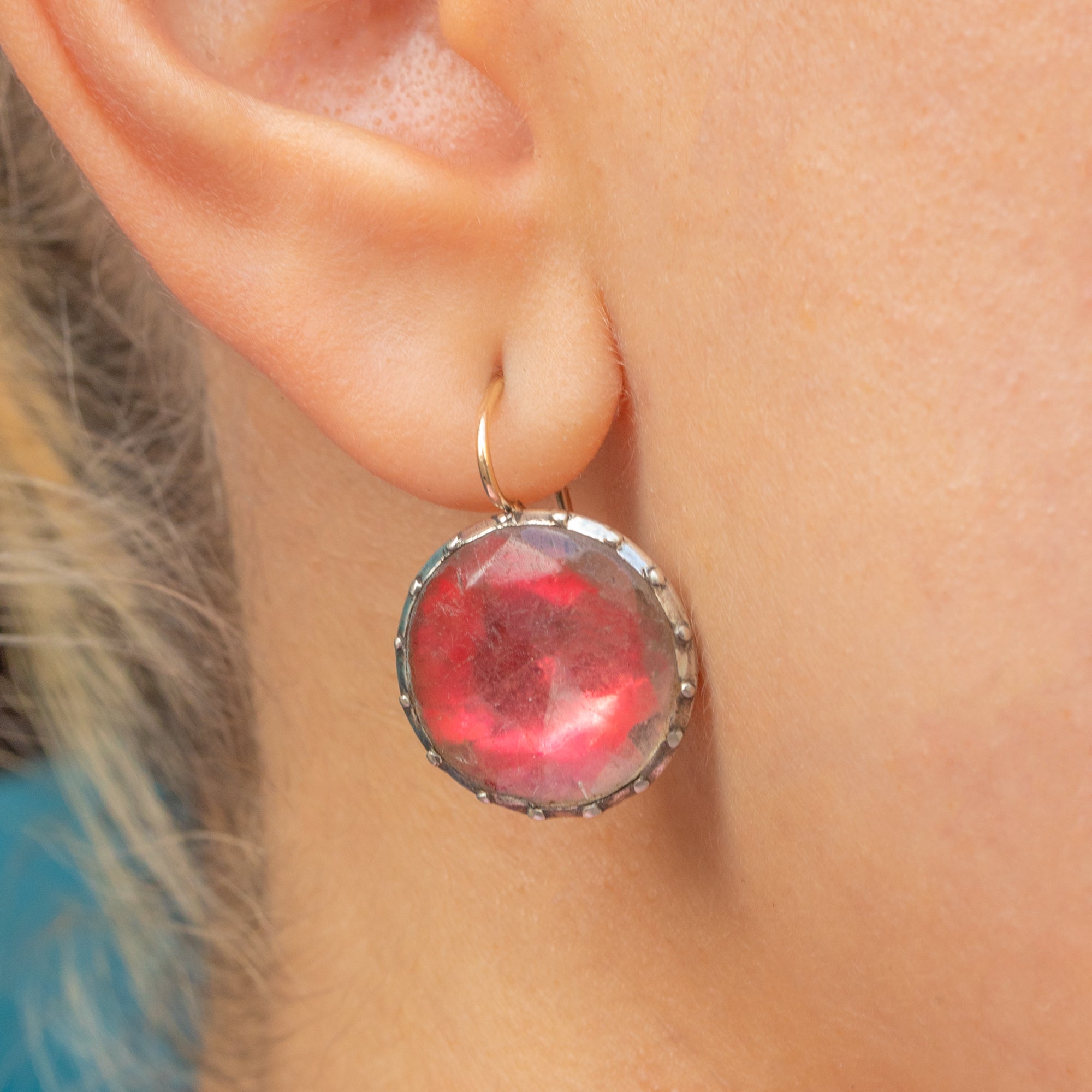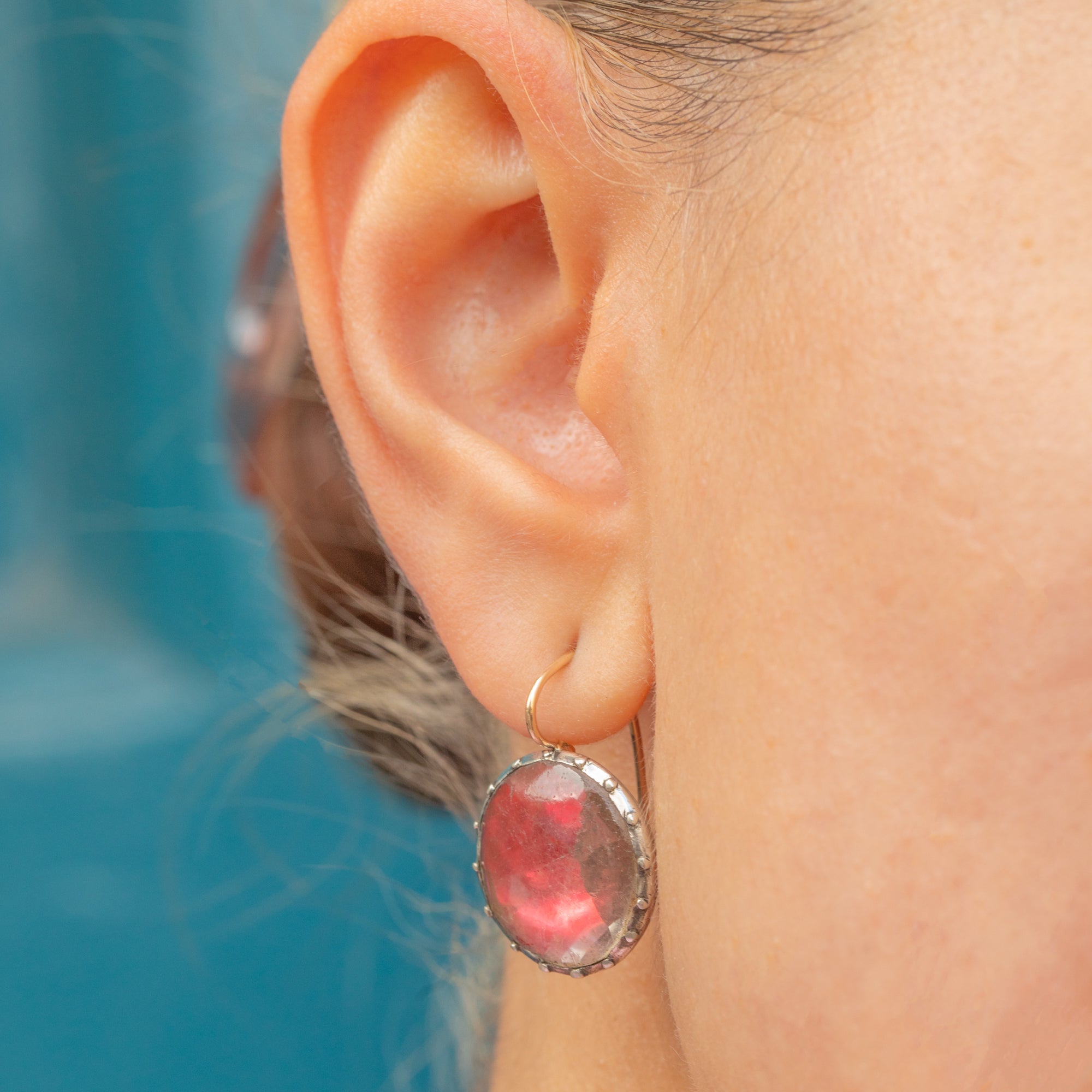 GOOD -VERY GOOD. These Georgian earrings have lasted amazingly well considering their age. The Paste are secure and their foiled backing has lasted beautifully. Both Paste stones have notable surface wear, but the colour is so striking it's not super obvious until you look up close. One of the earrings has a dent on the back, but when you wear them, this isn't visible. The long slender hooks are securely soldered, so you can wear these Queen Anne earrings with utmost confidence!