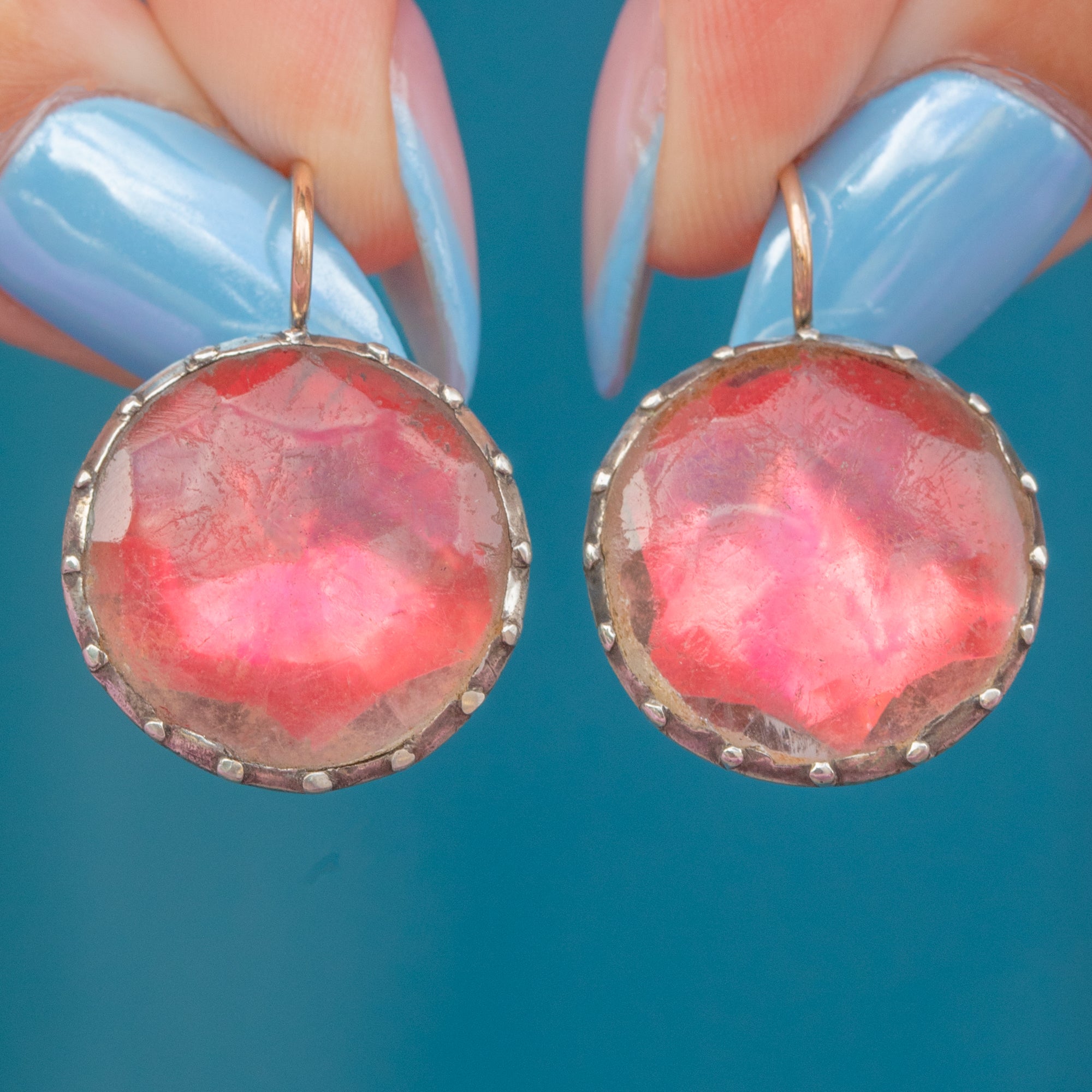 Pretty in pink, these Queen Anne Paste earrings are a rare find! The earrings are crafted from Sterling Silver with classic piecrust settings and finished with elegant 9ct Gold hooks.