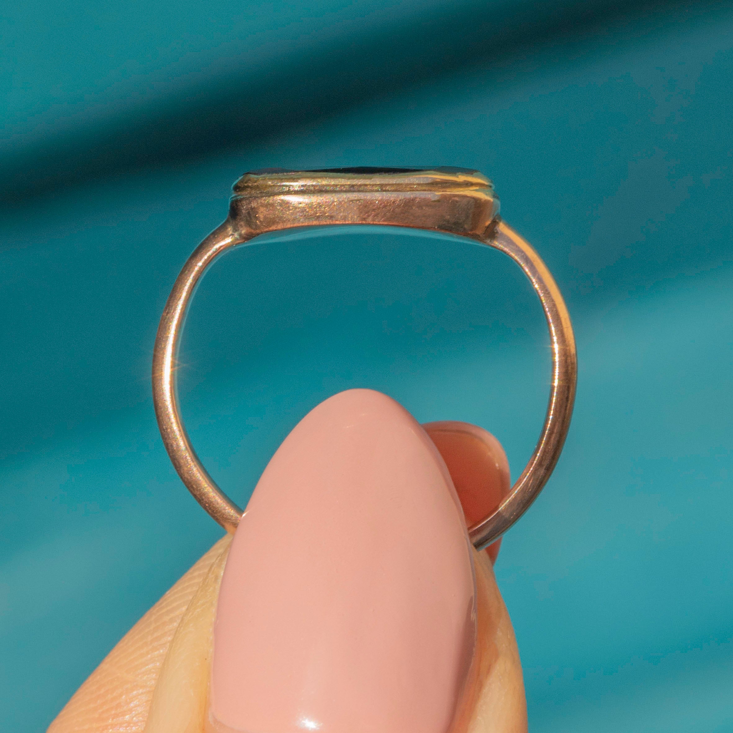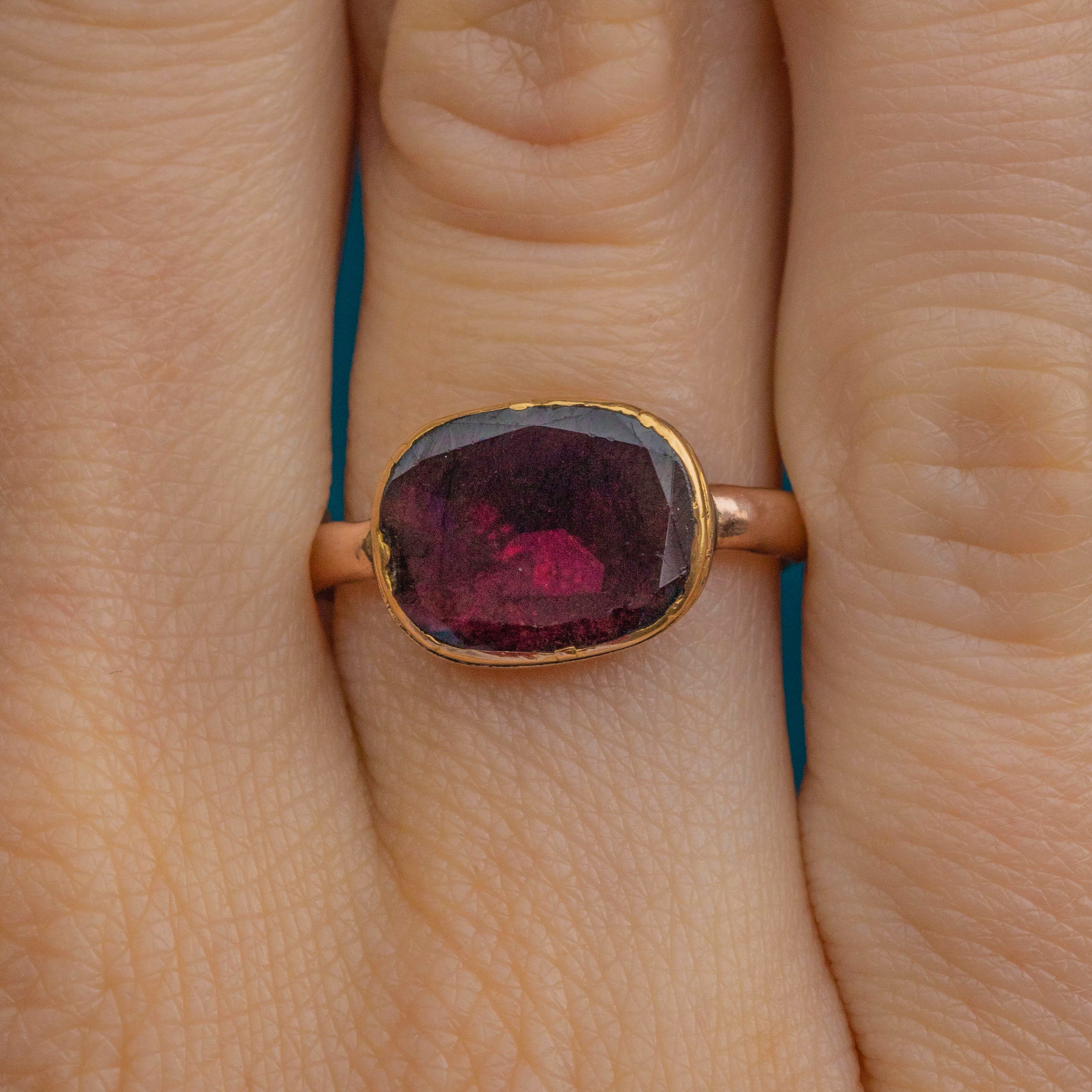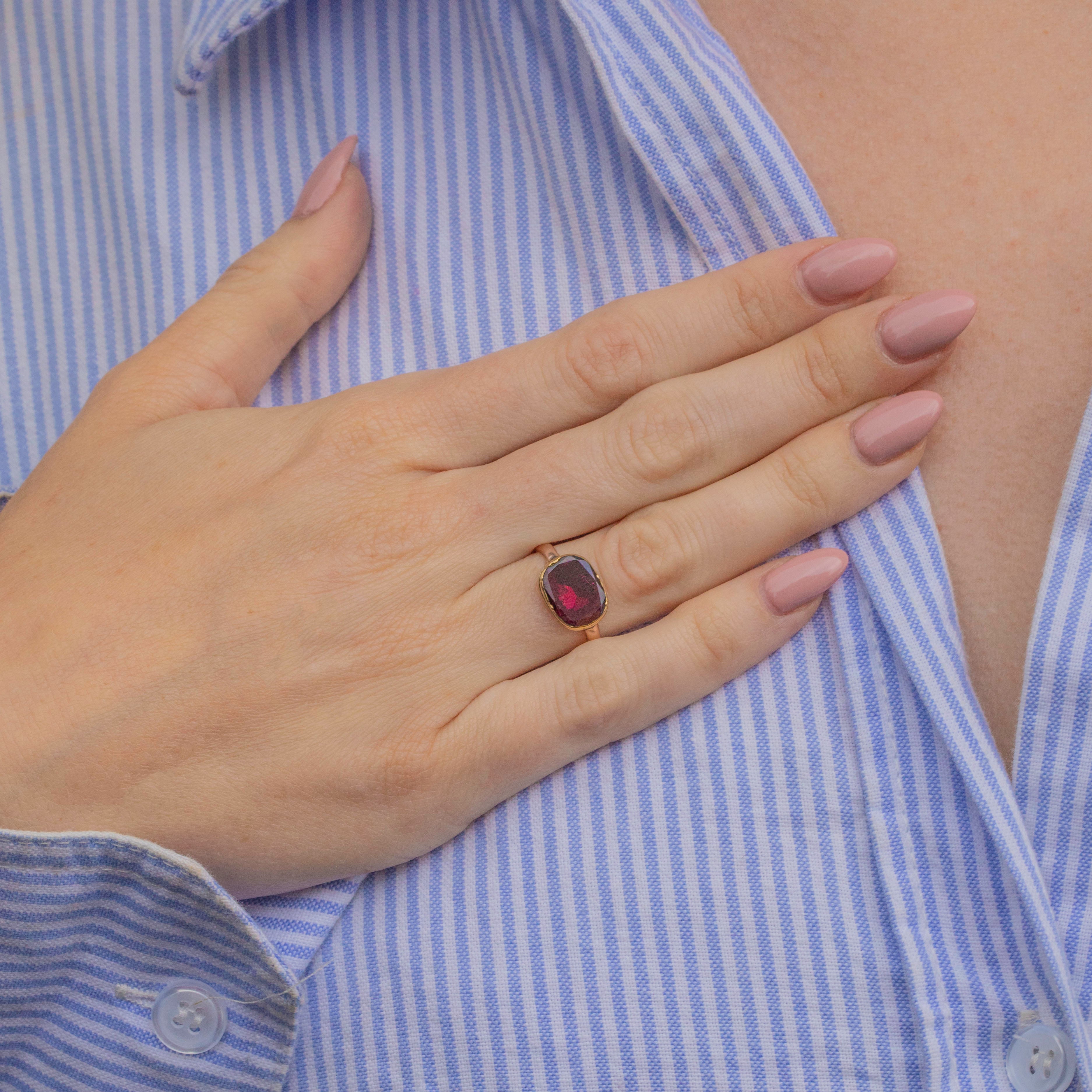 This Georgian 8ct Gold flat-cut Garnet ring will make a striking addition to your curated ring stack! The deep purple-hued Garnet is displayed within a traditional Georgian piecrust setting, its large flat-cut surface revealing flashes of magenta as she catches the light.