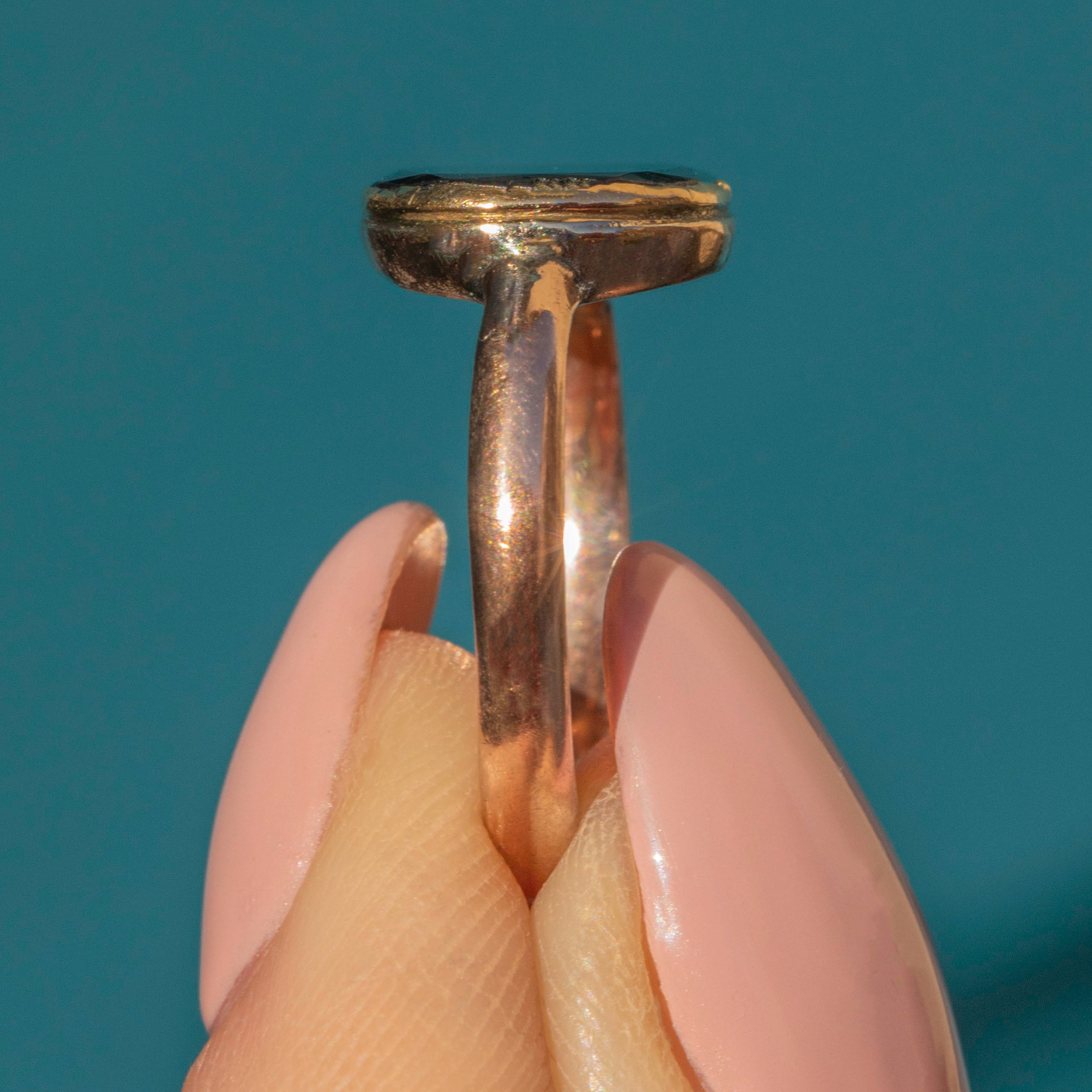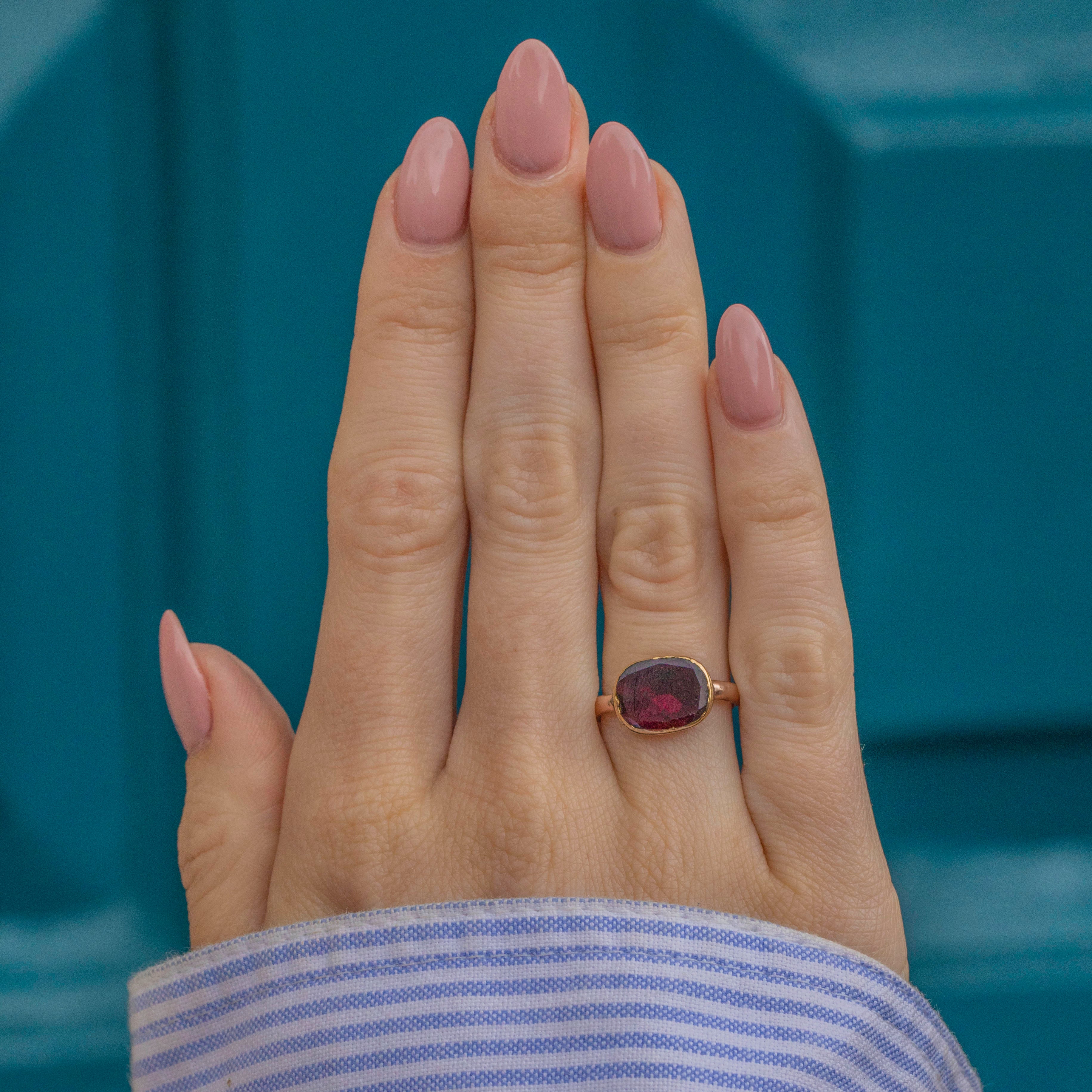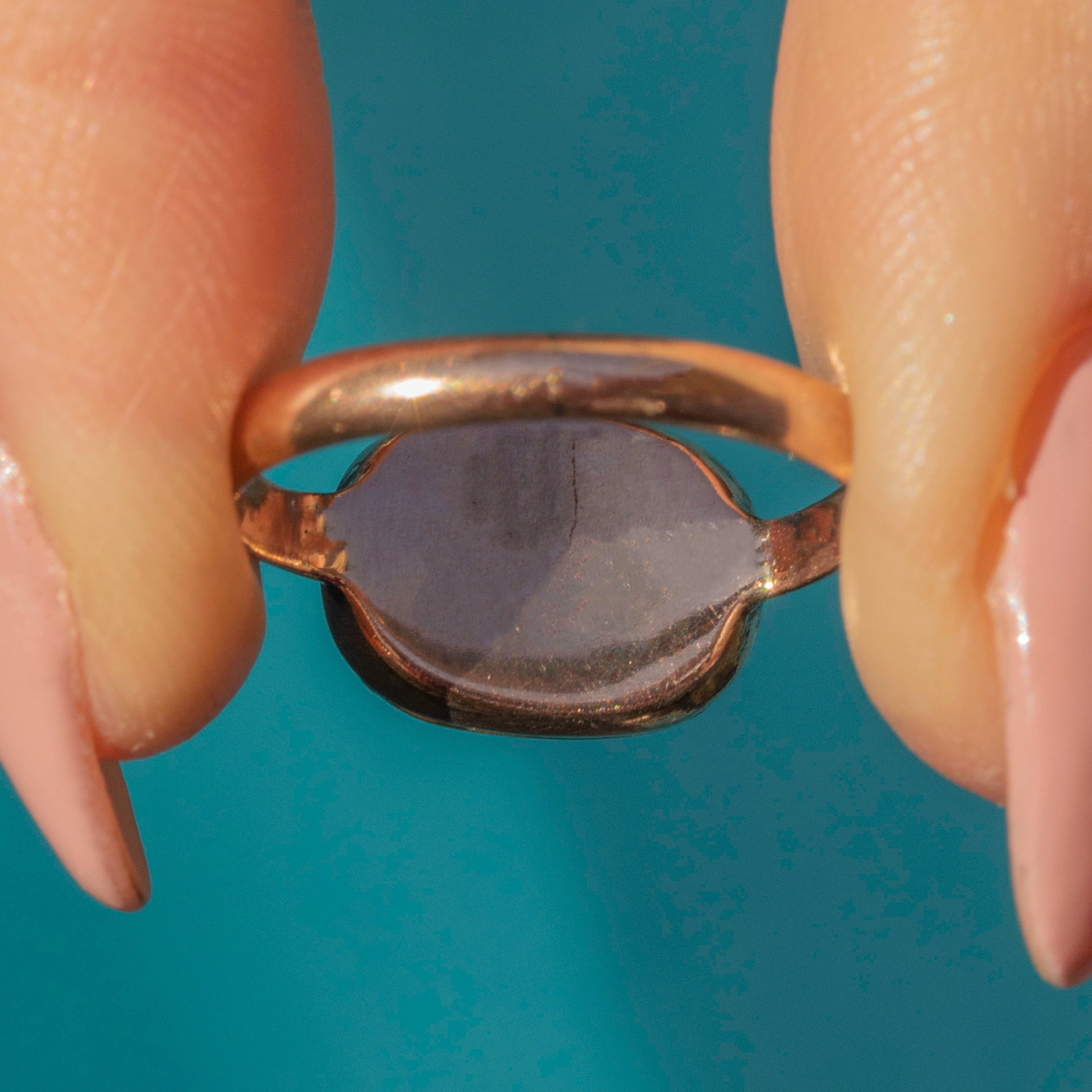 This Georgian 8ct Gold flat-cut Garnet ring will make a striking addition to your curated ring stack! The deep purple-hued Garnet is displayed within a traditional Georgian piecrust setting, its large flat-cut surface revealing flashes of magenta as she catches the light.