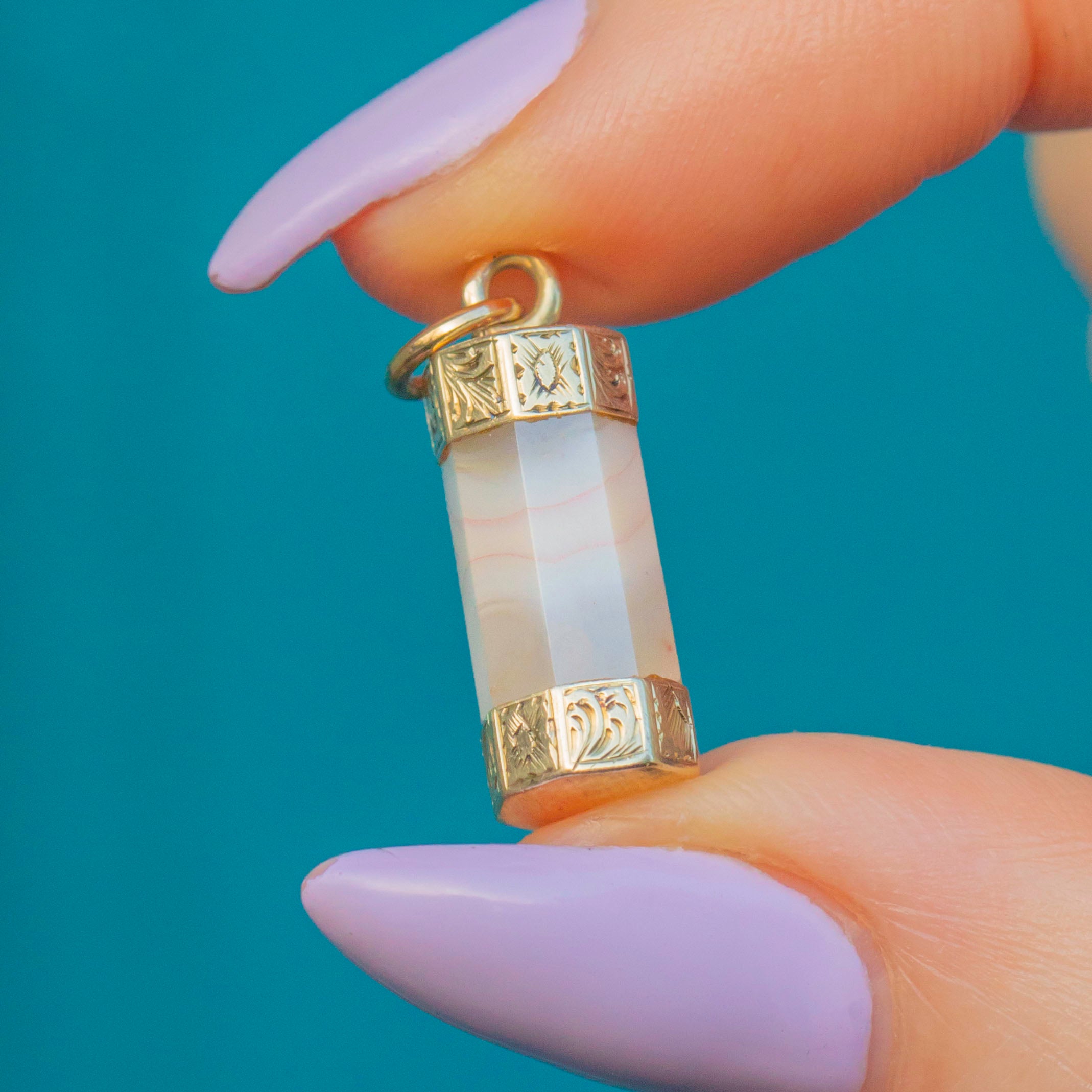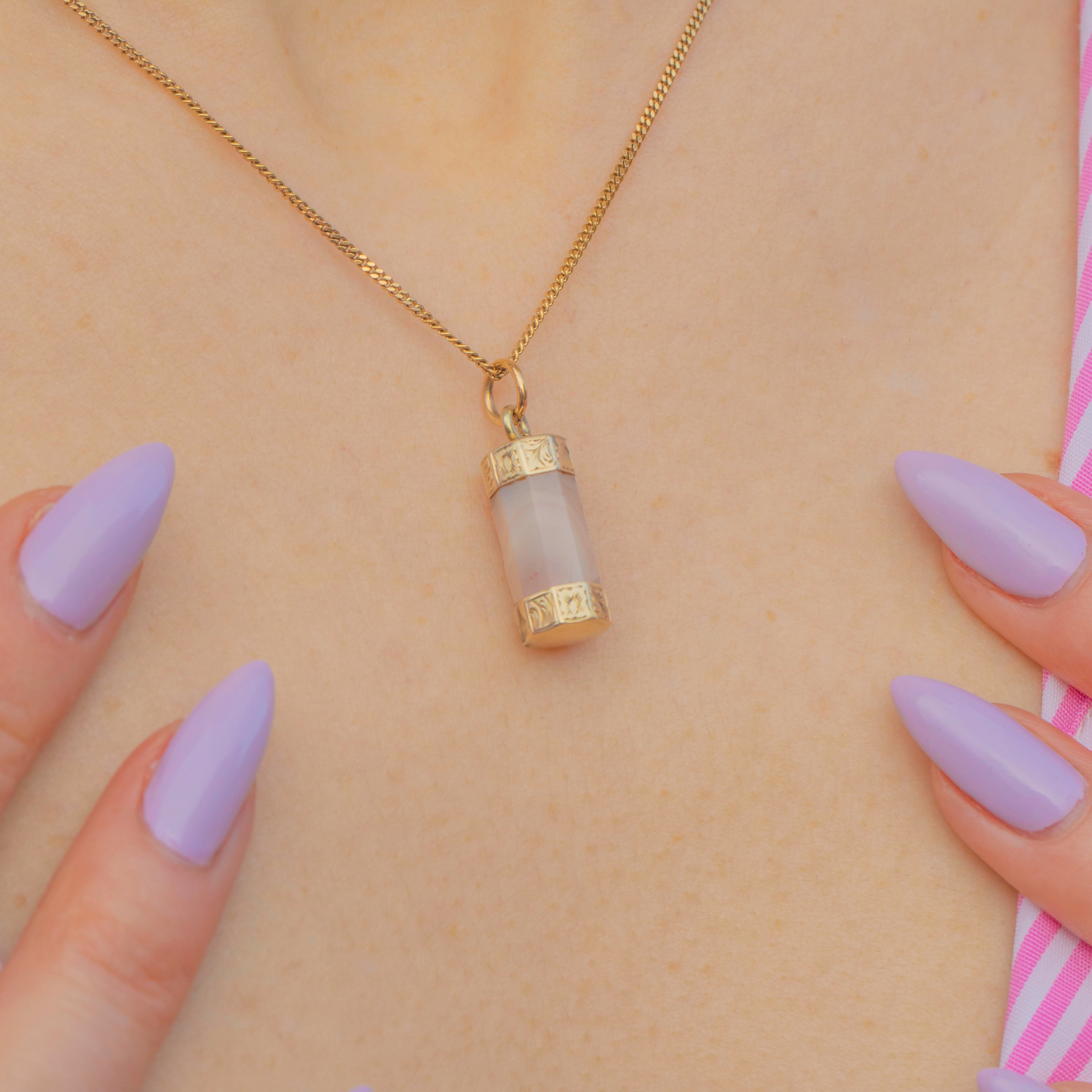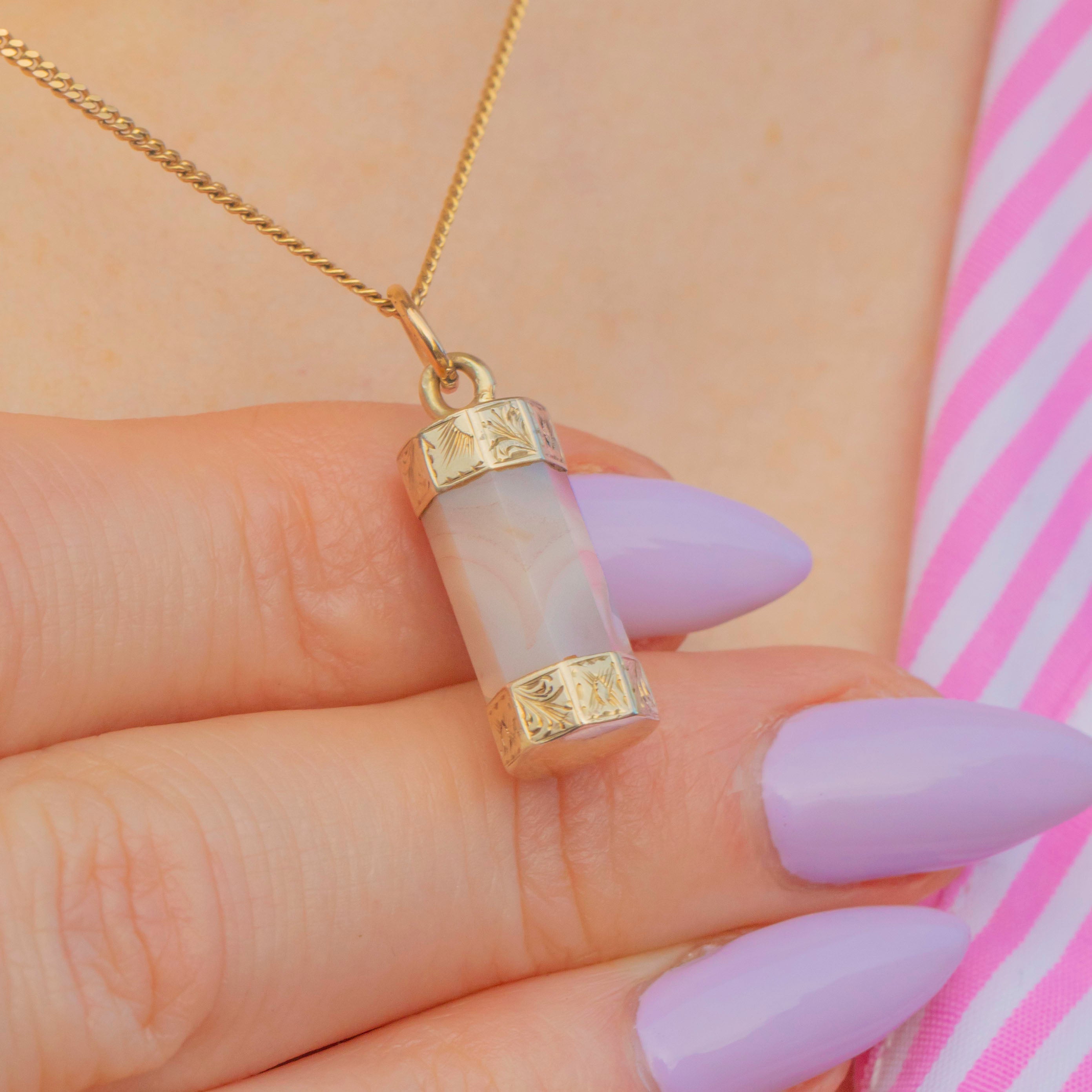 EXCELLENT. This Georgian 9ct Gold Agate column pendant is in excellent condition. The Agate is smoothly cut, with no signs of surface wear, and is securely held within its settings. The Gold has a lovely pale yellow hue and the engraved details have remained defined. With plenty of wear potential, don't hesitate to make this antique Agate charm your newest acquisition!
