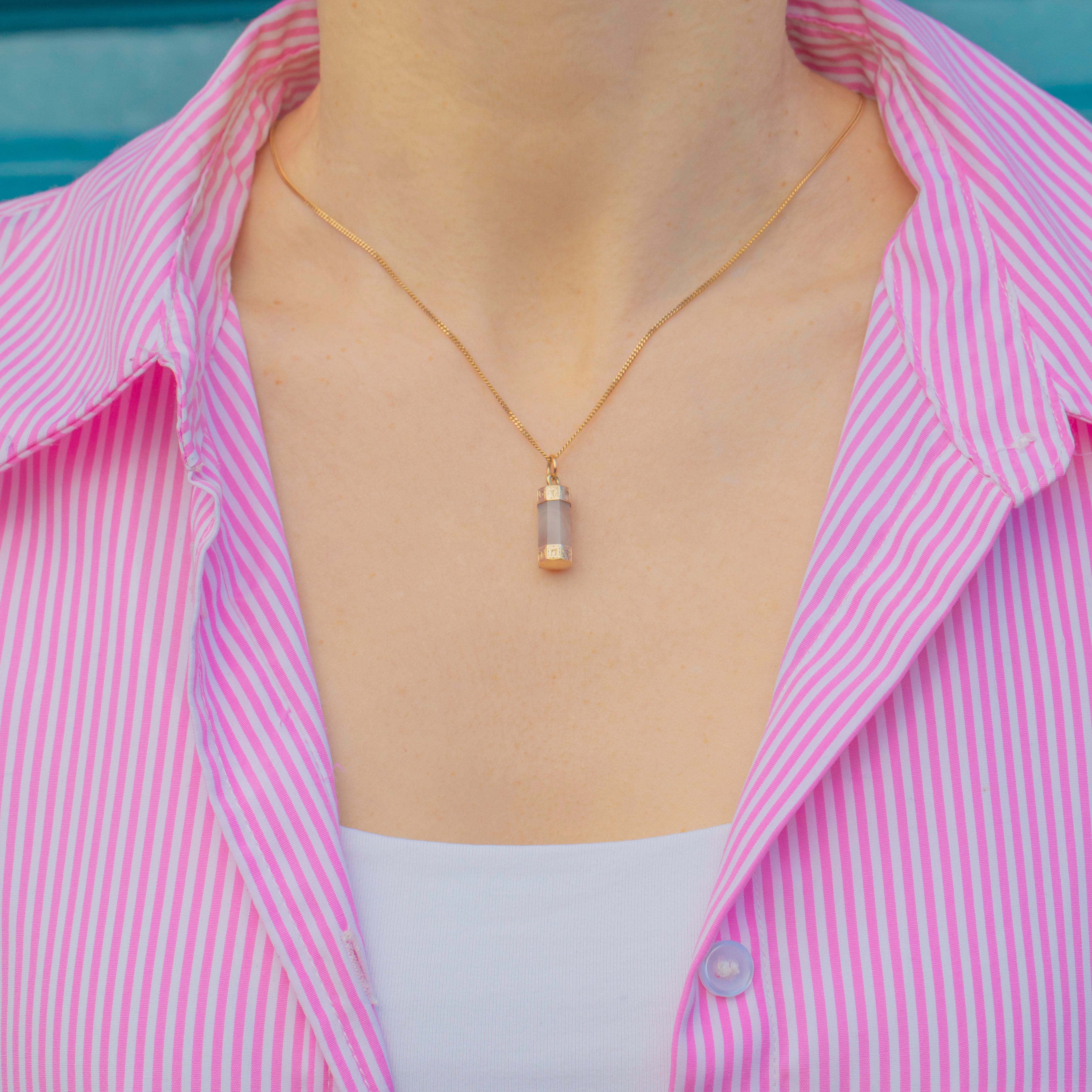 This exquisitely crafted Georgian 9ct Gold Agate column pendant will bring a sense of mystique to your collection! The striking faceted Agate displays light striations of earthy hues that almost appear to be suspended within the stone, giving it an enchanting allure.