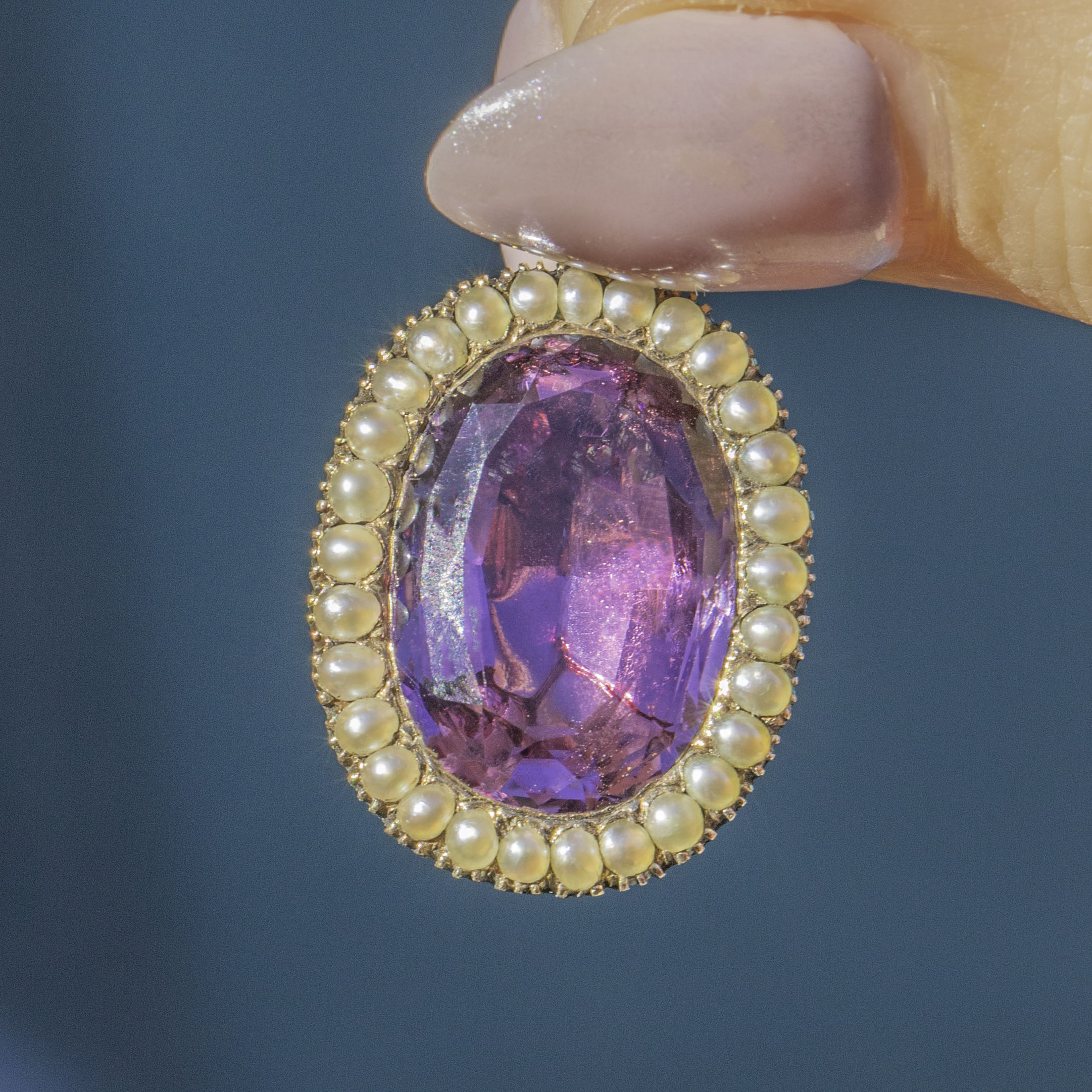 This is a magnificent Georgian 9ct Amethyst Pearl cluster pendant! Rich and regal, this antique pendant is perfect for adding a touch of luxury and vibrant pop of colour to your jewellery collection.