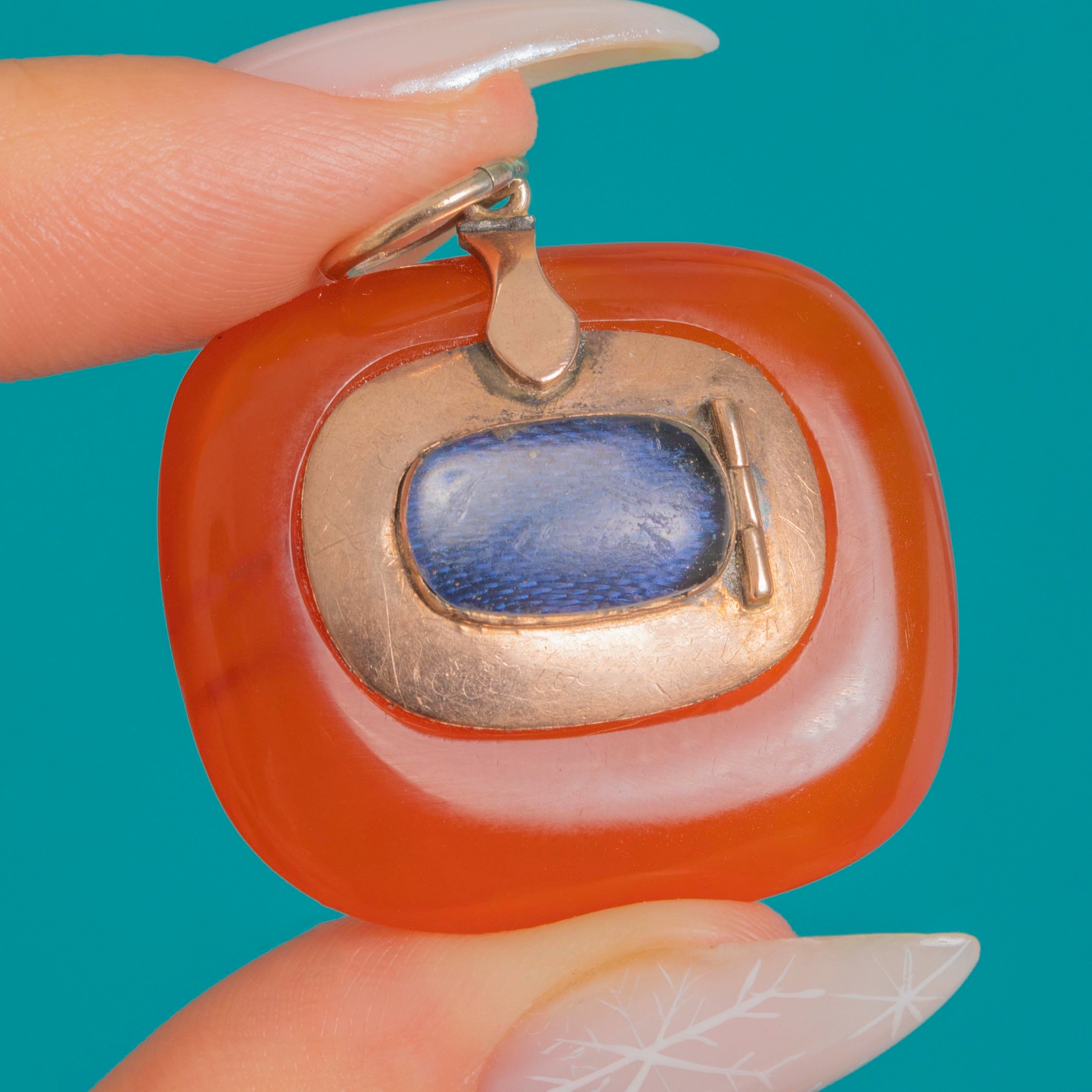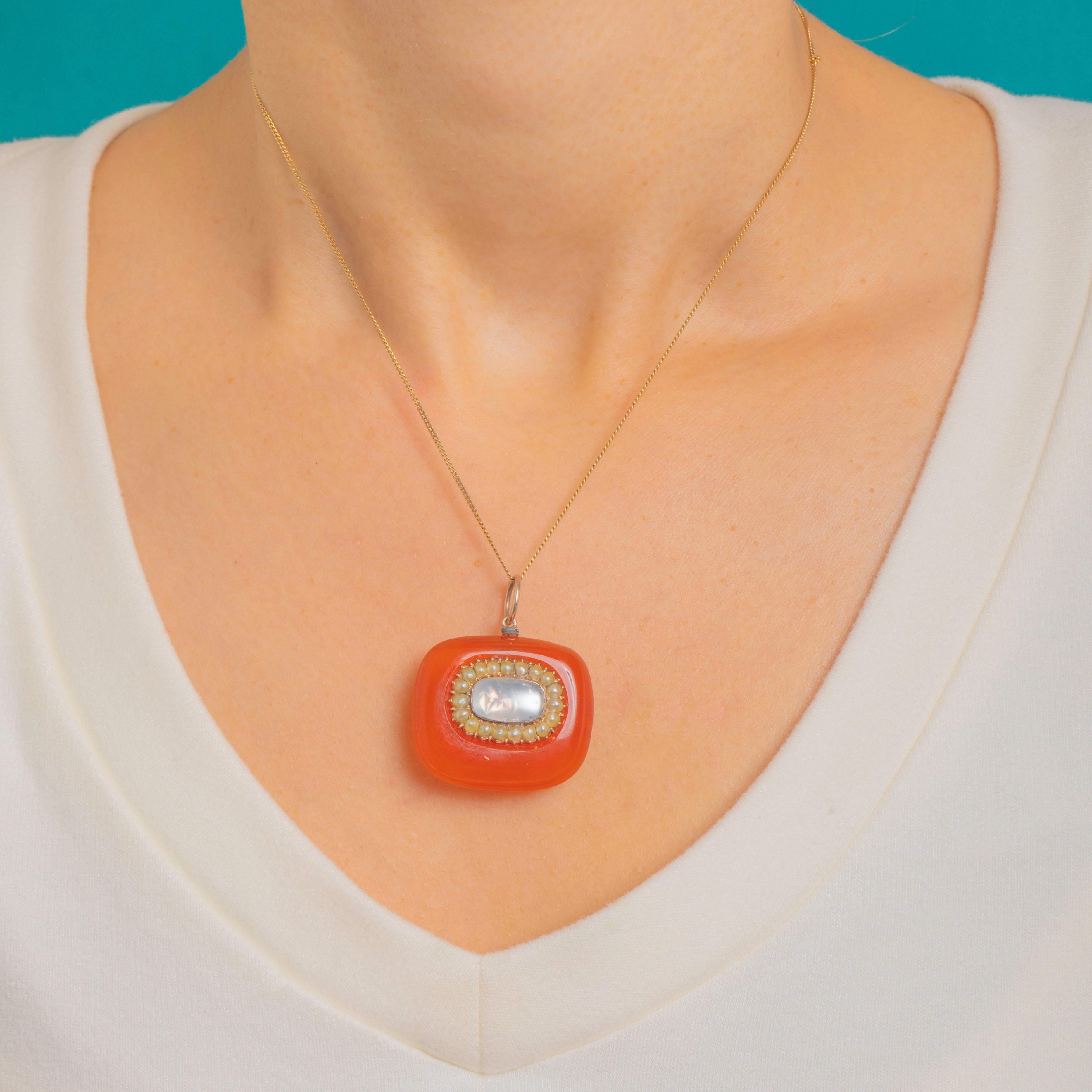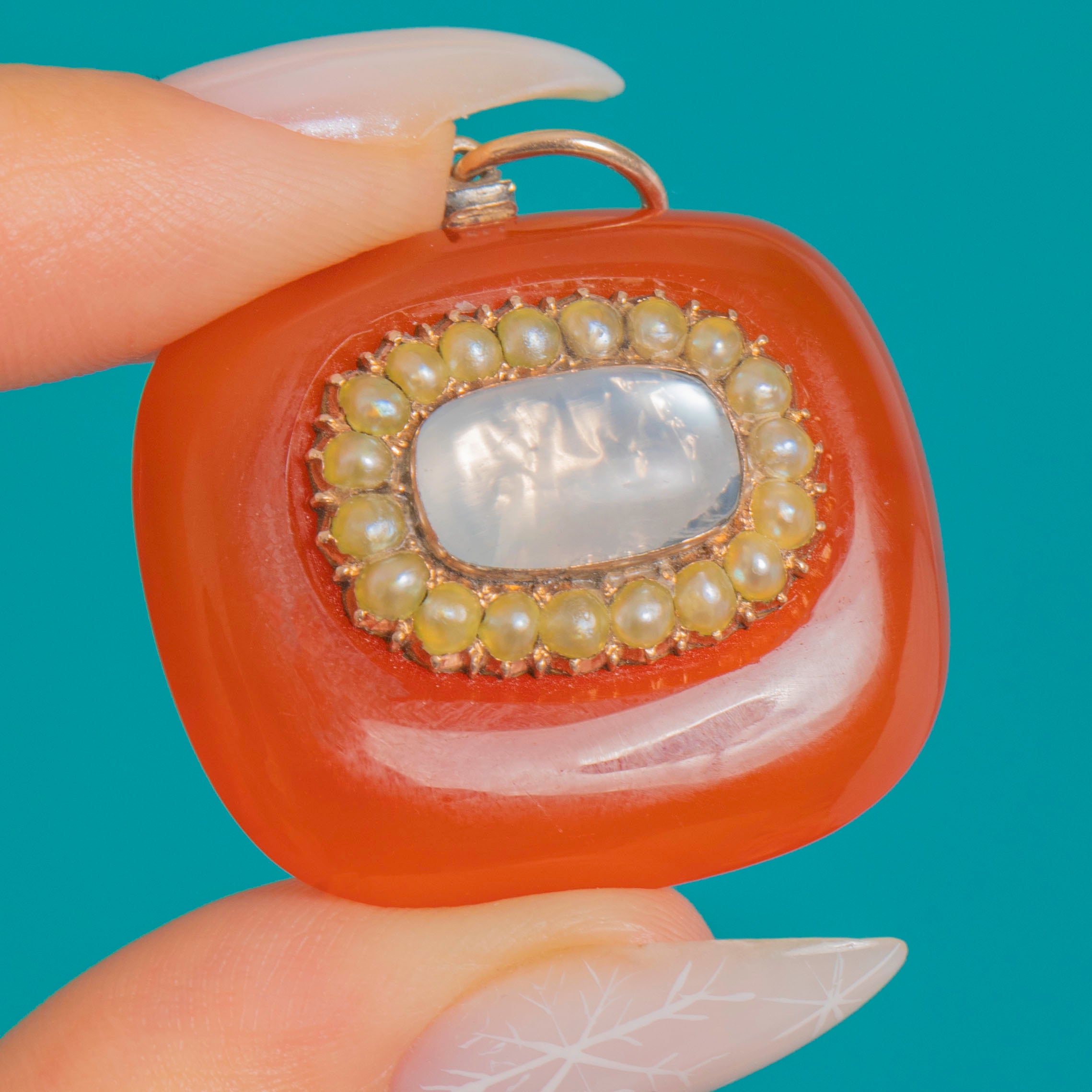 A striking Georgian pendant showcasing a rich orange-red Carnelian tablet centred by a luminous oval Moonstone and encircled by a neat halo of creamy seed Pearls. The colour-play is wonderfully graphic and elegant, with the soft glow of Moonstone and Pearls set off by the saturated Carnelian and warm 9ct Gold mount.