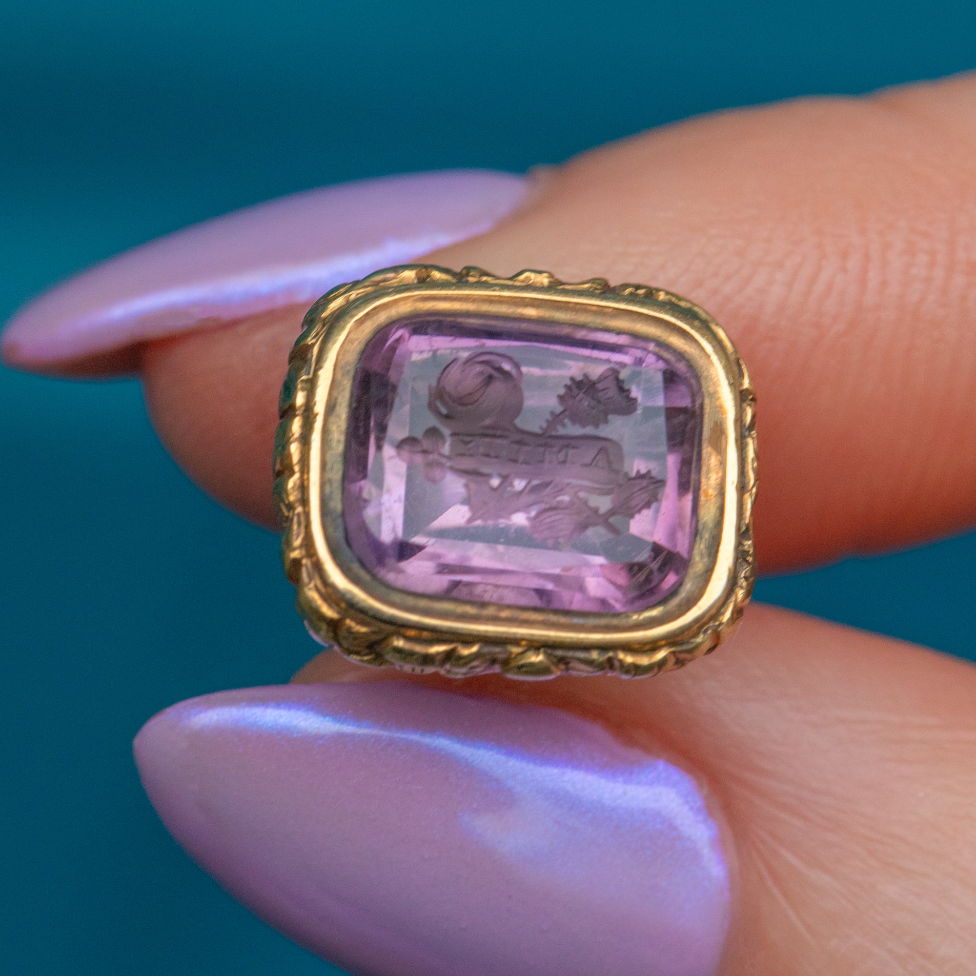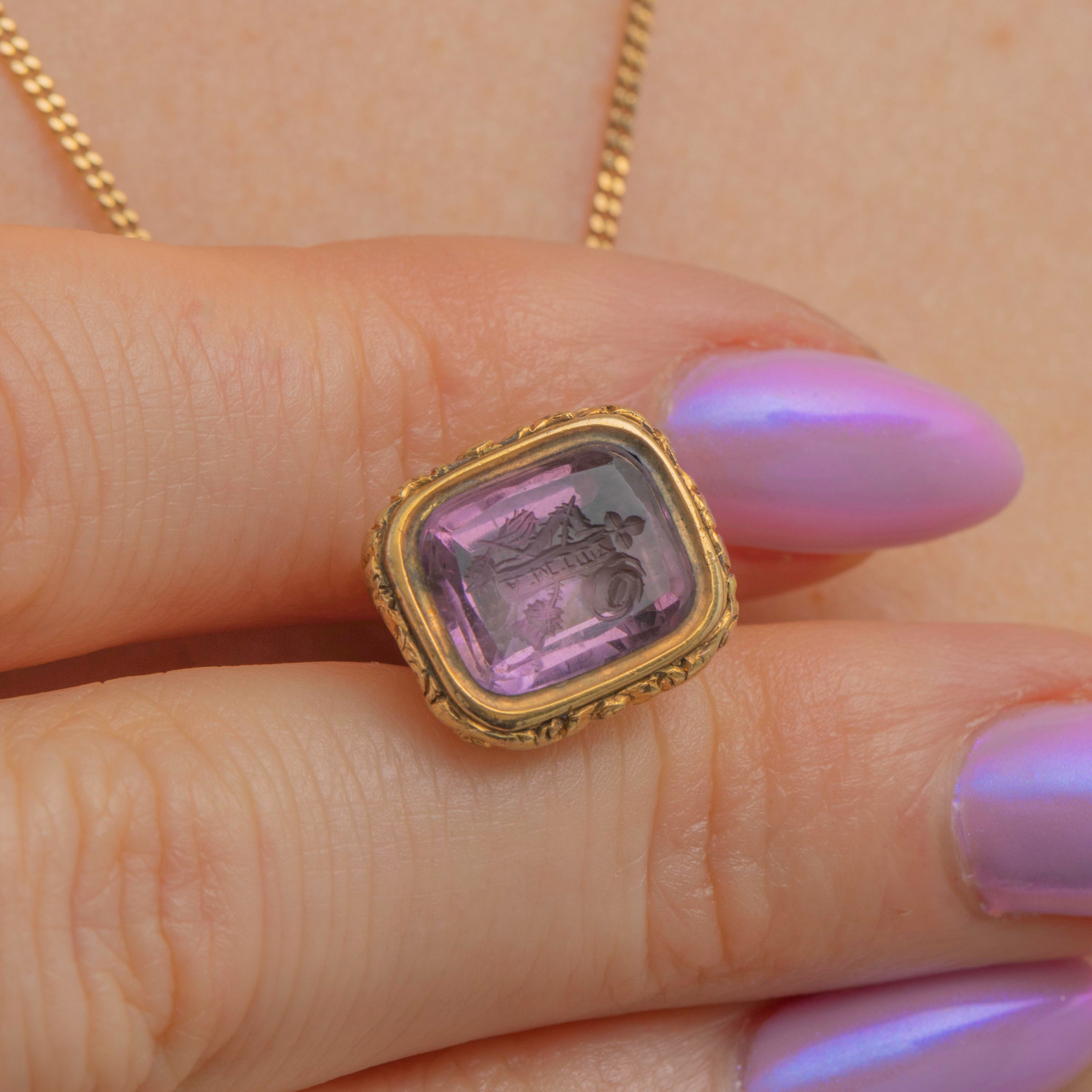 The Amethyst has been intricately engraved with thistles and foliate surrounding the the word "amity" - meaning friendship, making his Georgian fob a wonderful gift choice! Boasting exquisite craftsmanship and offered in lovely condition, this antique Amethyst fob would make a fantastic addition to your collection.