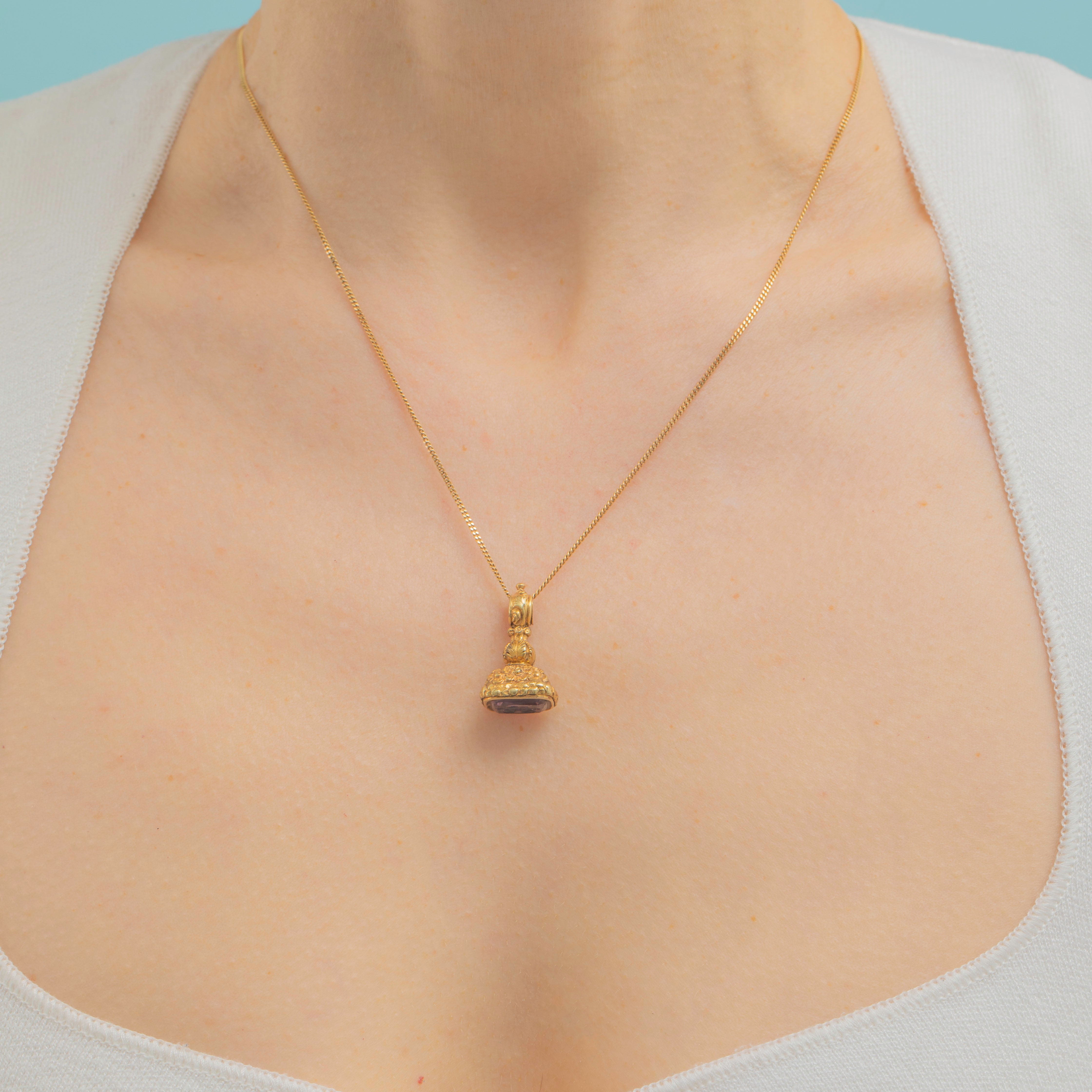 VERY GOOD. This Georgian 9ct Gold cased Amethyst intaglio fob pendant is in very good condition. The Gold casing is bright and buttery and the details have all remained defined. The fob does have some general surface wear, including some wear to the Gold casing and the Amethyst has some light scratches, which is to be expected from a piece of such great age. The intaglio is crisp and the Amethyst remains securely set. All this sweet little Georgian fob needs is a skinny Gold chain to adorn!