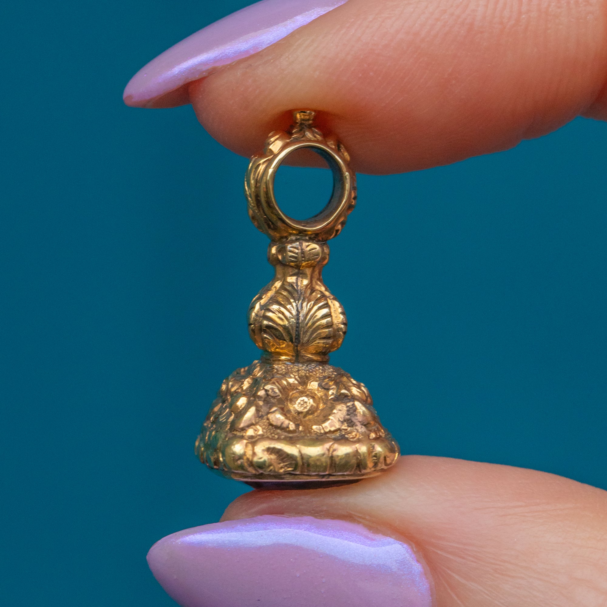This Georgian 9ct Gold cased Amethyst intaglio fob pendant is a gorgeous little treasure! Bursting with ornate details, this dainty antique wax seal fob is covered in blooming florals and sweeping leaves, displaying a lilac Amethyst at the base.