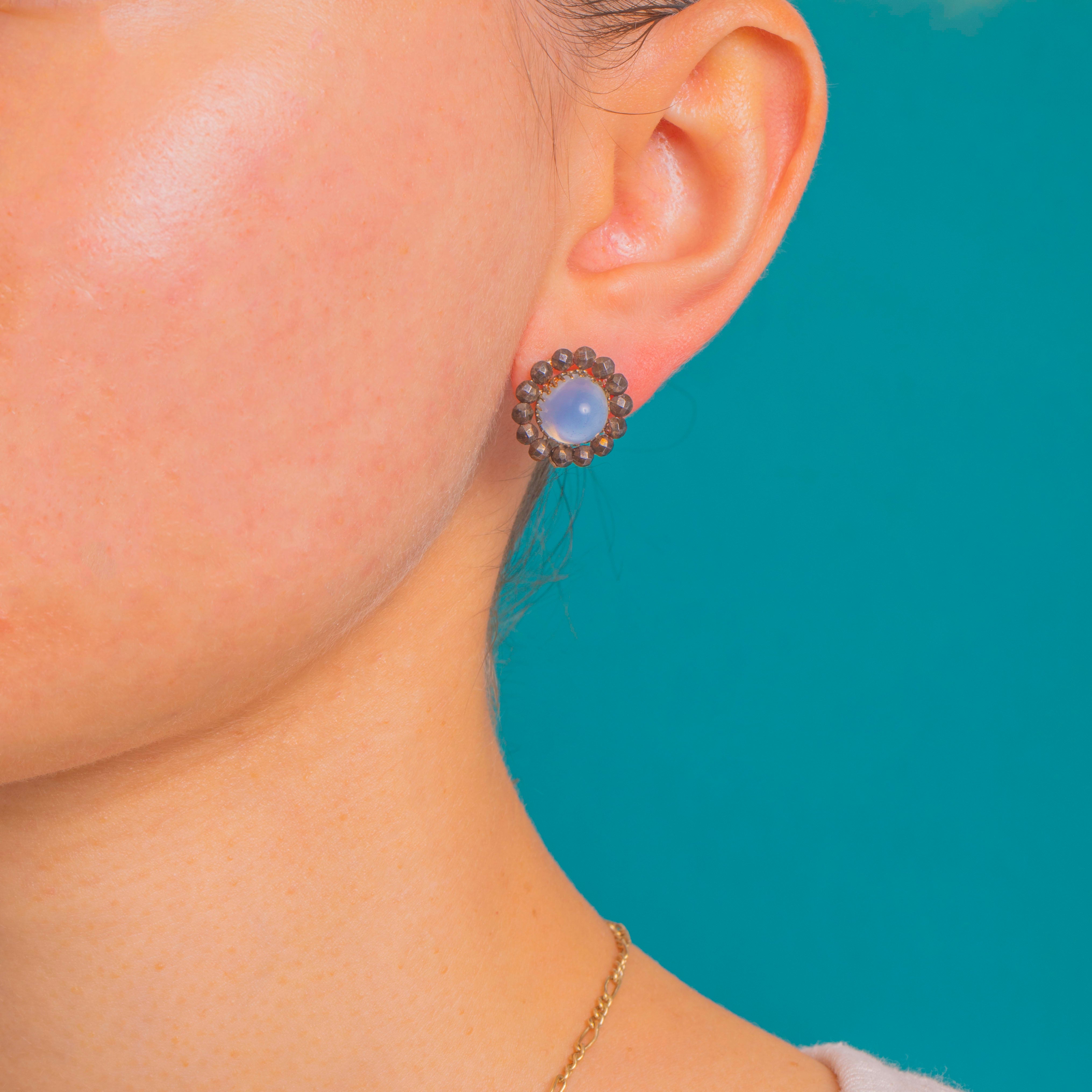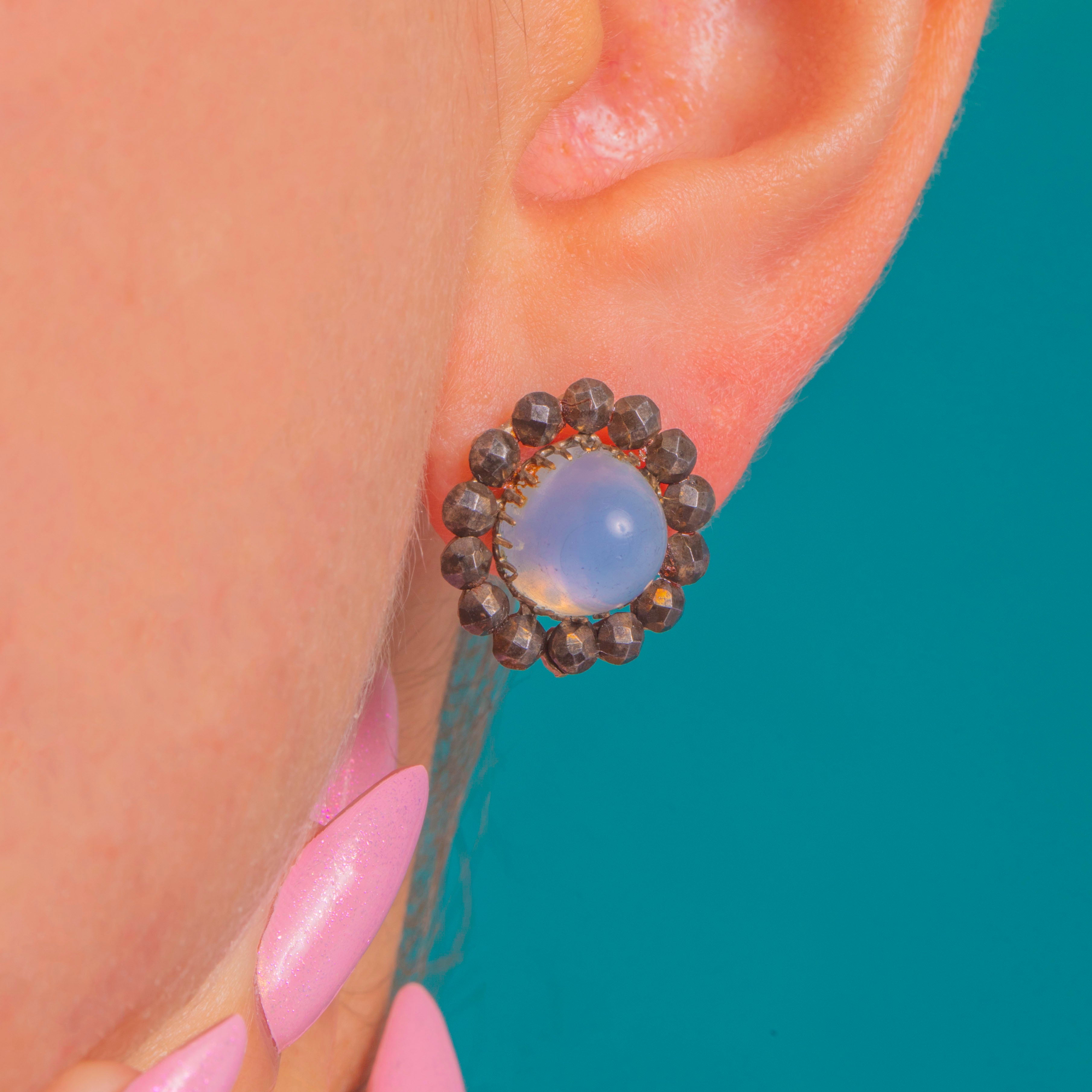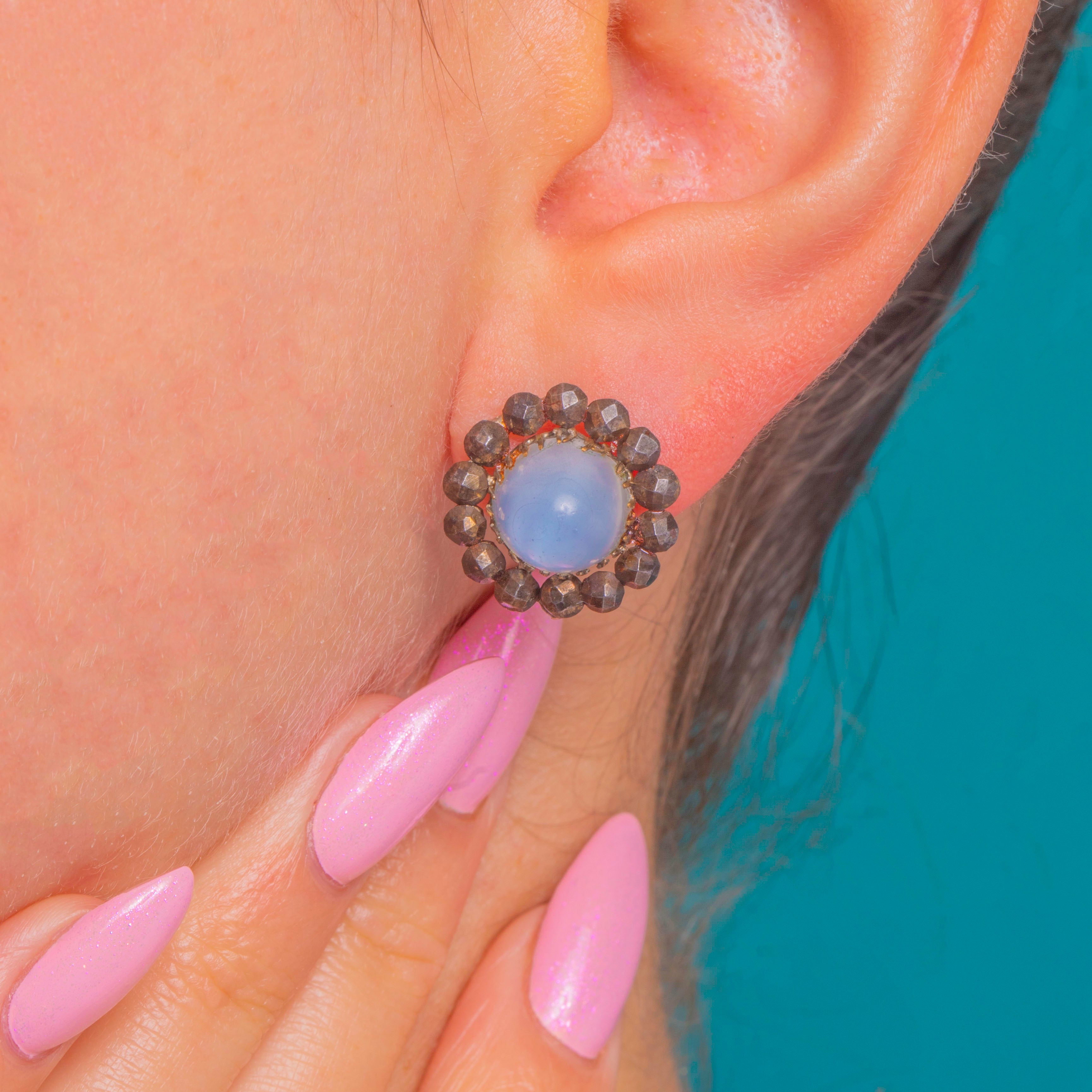 涼やかなスカイブルーとアンティークの輝きが調和した、個性豊かなクラスター・スタッドピアスです。各ピアスの中心には、柔らかなドーム状の光沢を放つブルーカルセドニーのシュガーローフ・カボションが配され、その周囲をきらめくGeorgianカットスティールのハローが囲みます。淡いブルーとガンメタルのファセットのコントラストが、洗練されたロゼットを形作り、動くたびに光を美しく反射します。