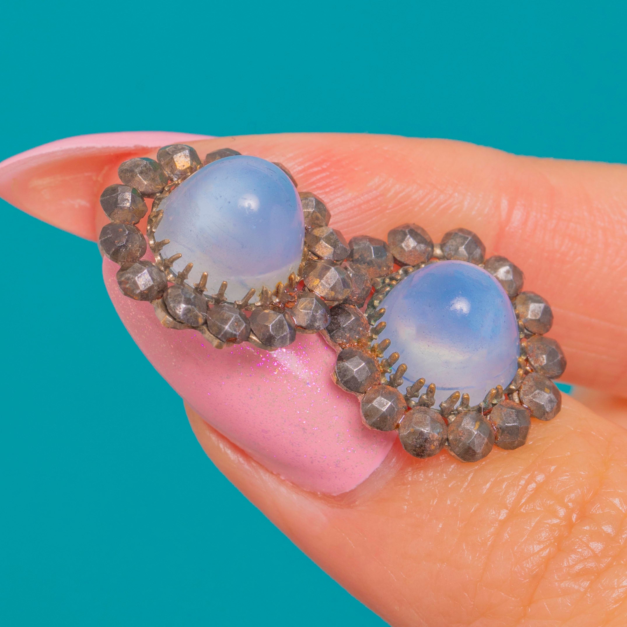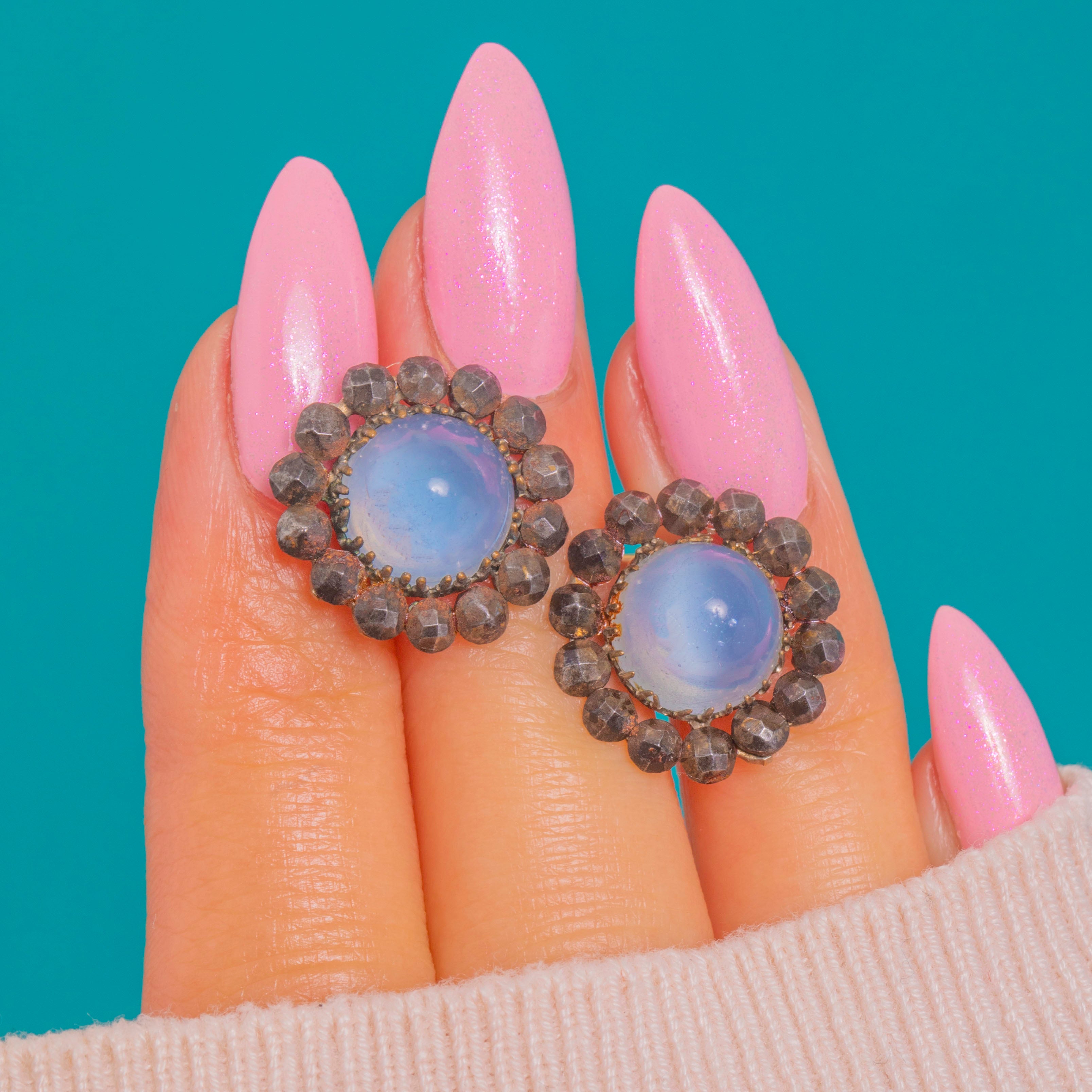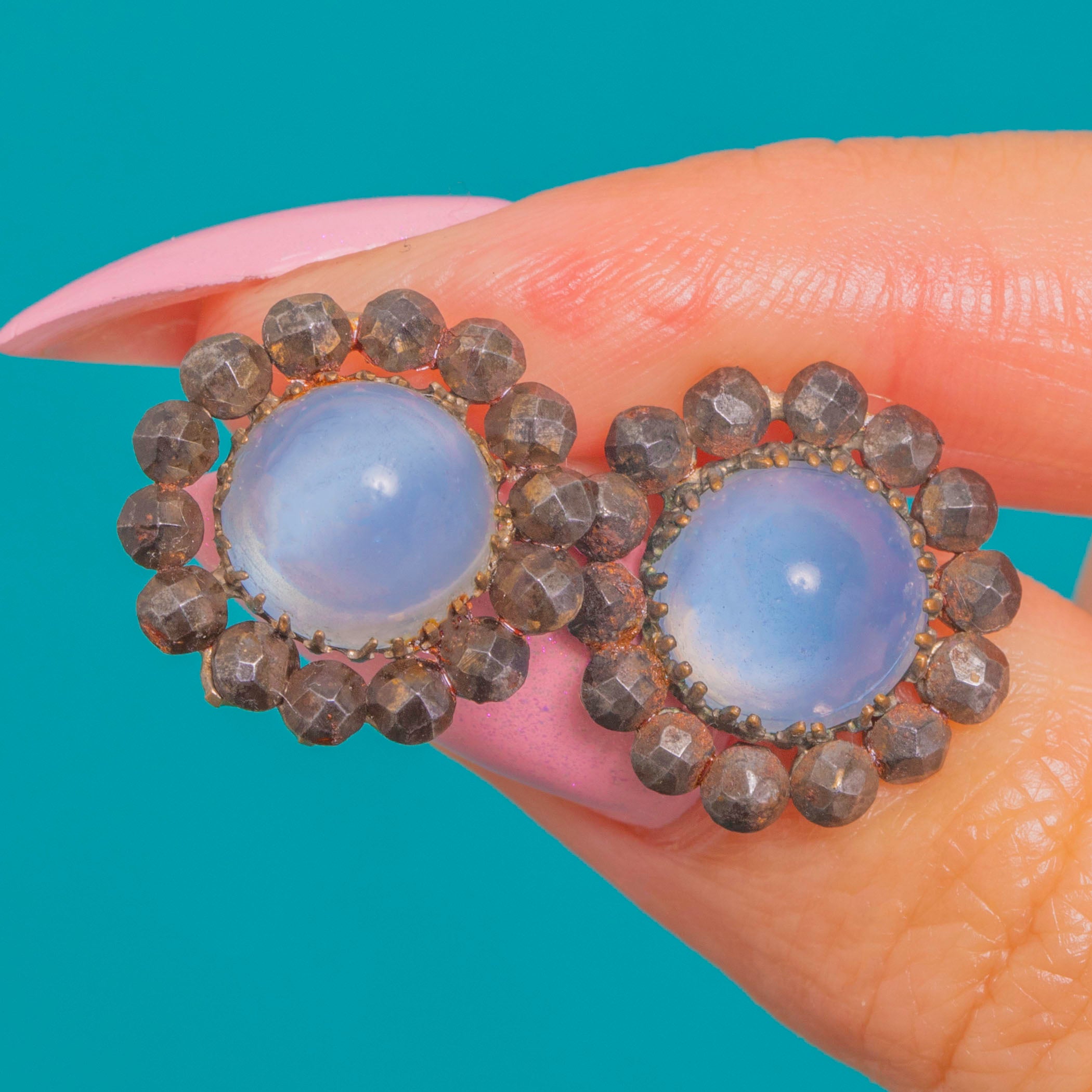 涼やかなスカイブルーとアンティークの輝きが調和した、個性豊かなクラスター・スタッドピアスです。各ピアスの中心には、柔らかなドーム状の光沢を放つブルーカルセドニーのシュガーローフ・カボションが配され、その周囲をきらめくGeorgianカットスティールのハローが囲みます。淡いブルーとガンメタルのファセットのコントラストが、洗練されたロゼットを形作り、動くたびに光を美しく反射します。